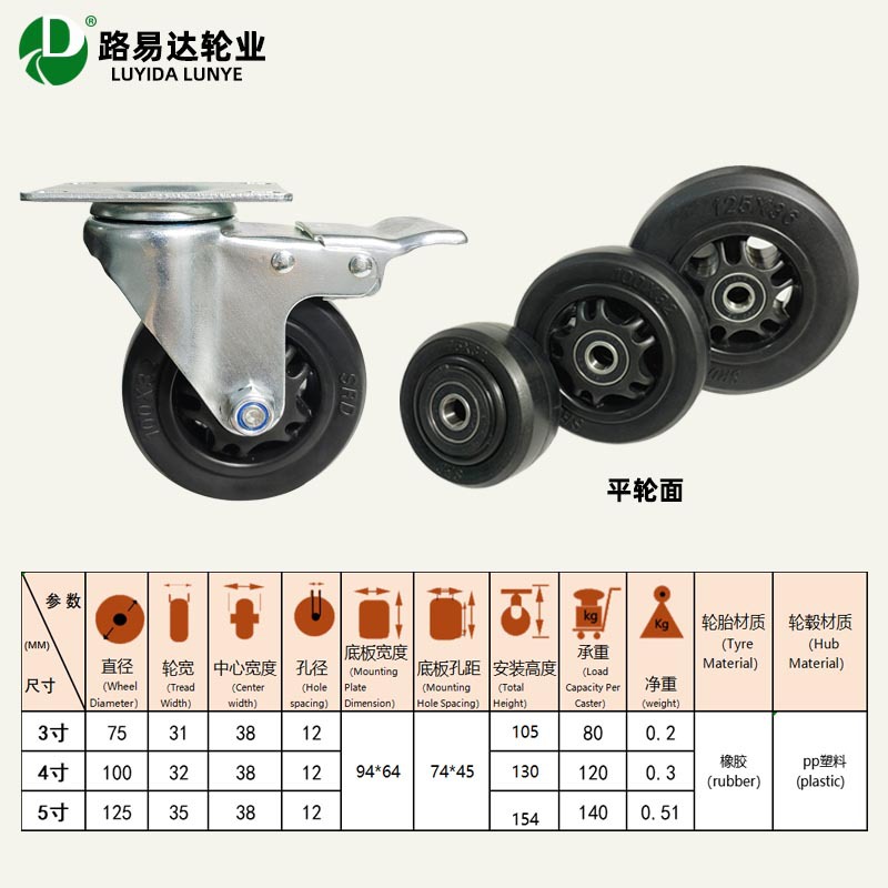 中型橡胶轮 3寸4寸5寸静音脚轮 平面轮胎手推车万向轮 板车刹车轮