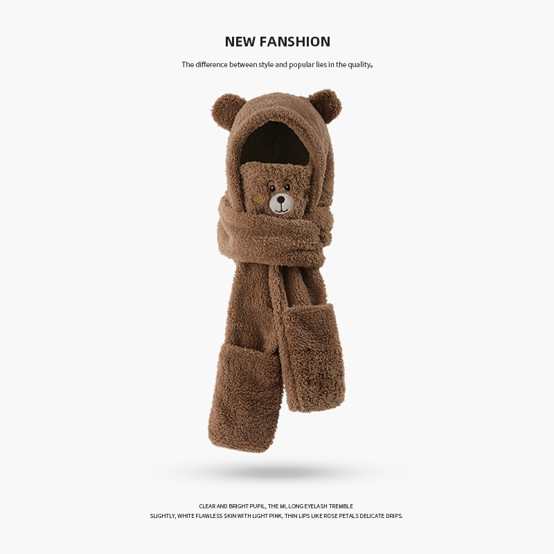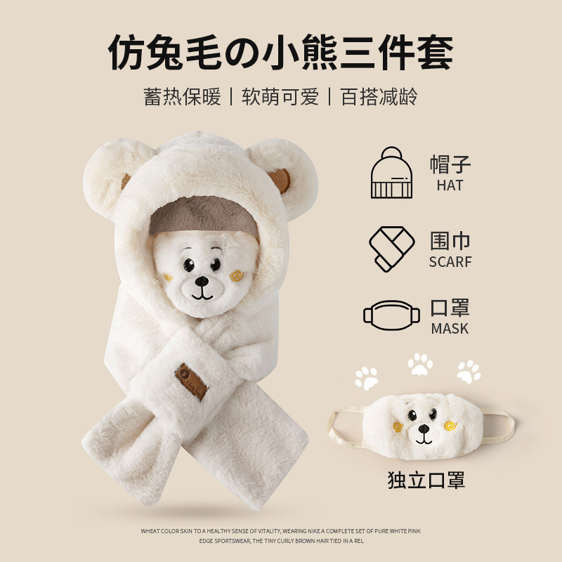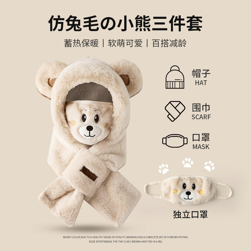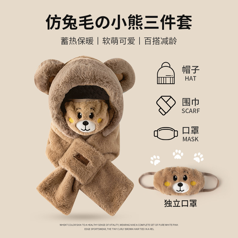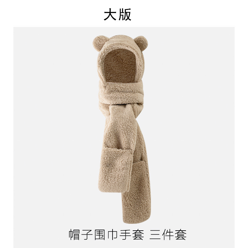 外贸卡通女士秋冬加厚保暖高品质毛绒可爱小熊帽子围巾一体三件套