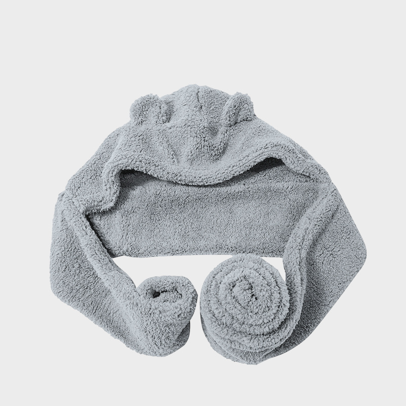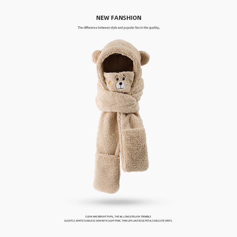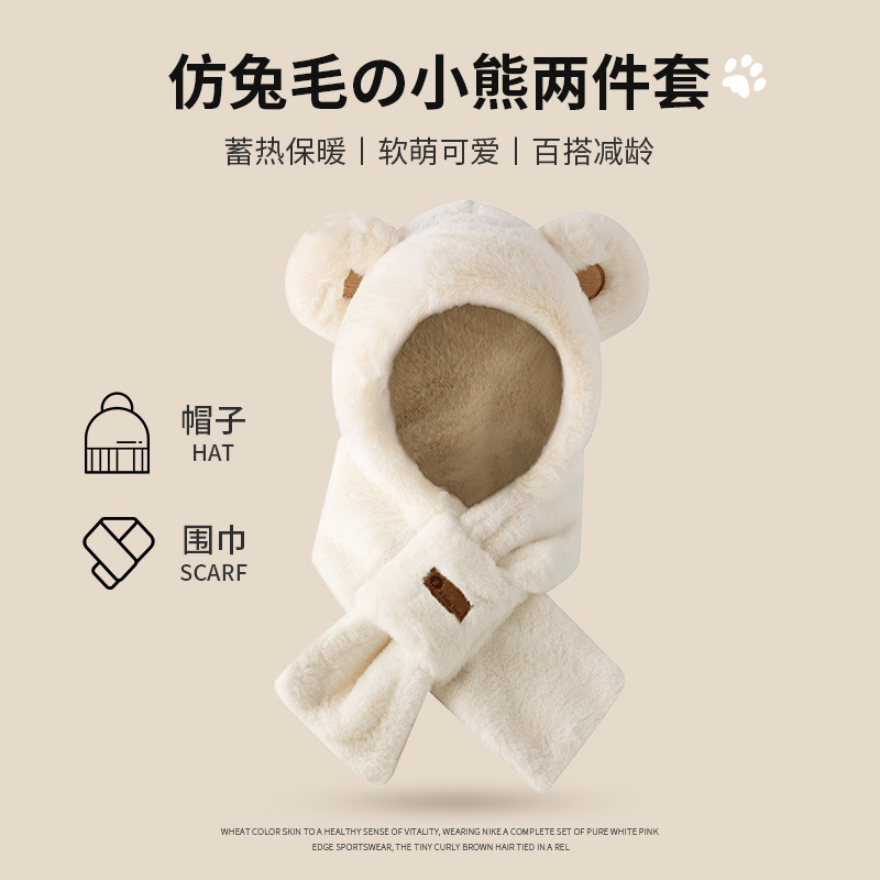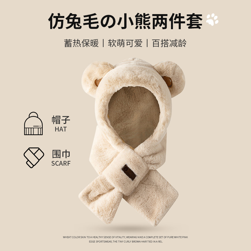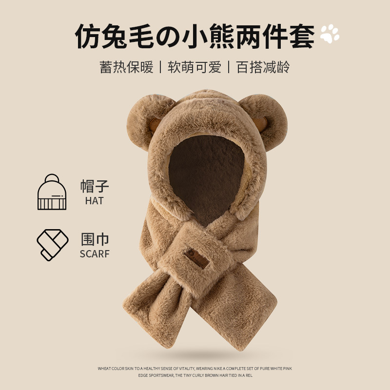 外贸卡通女士秋冬加厚保暖高品质毛绒可爱小熊帽子围巾一体三件套