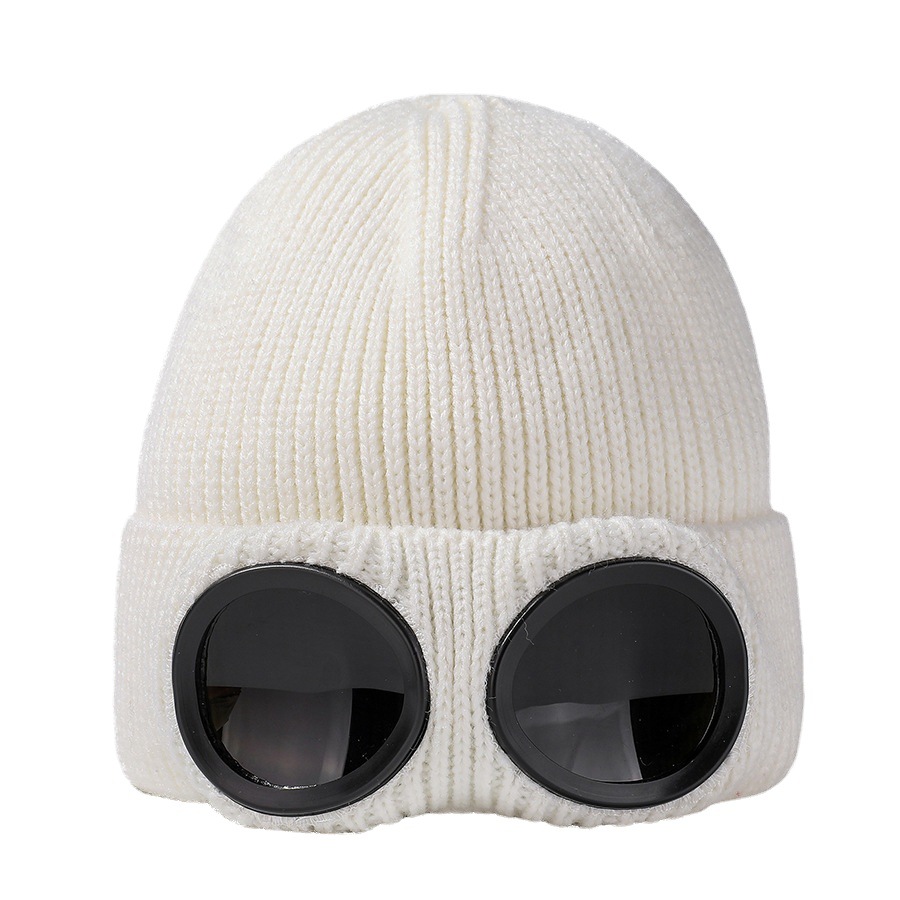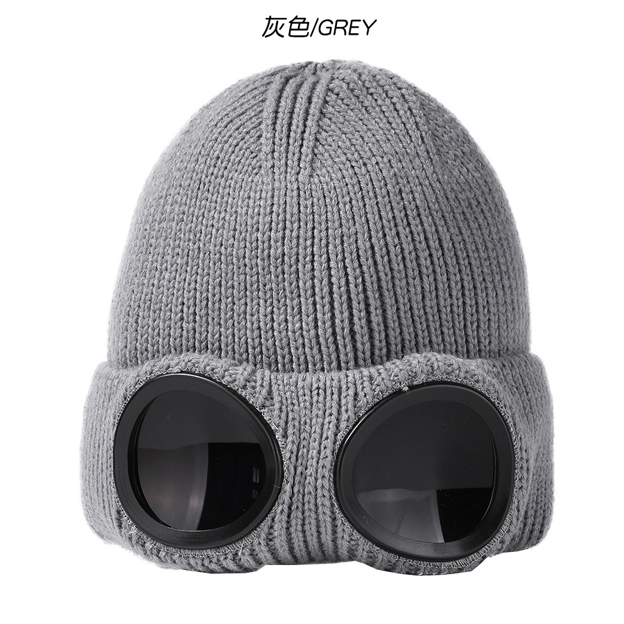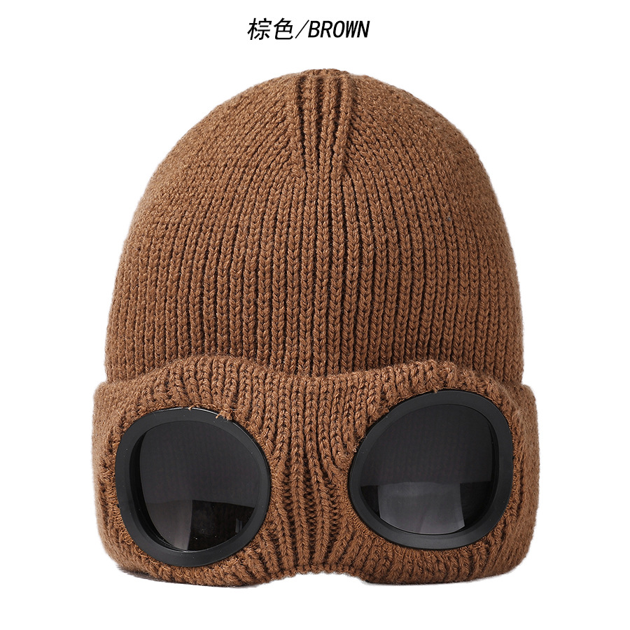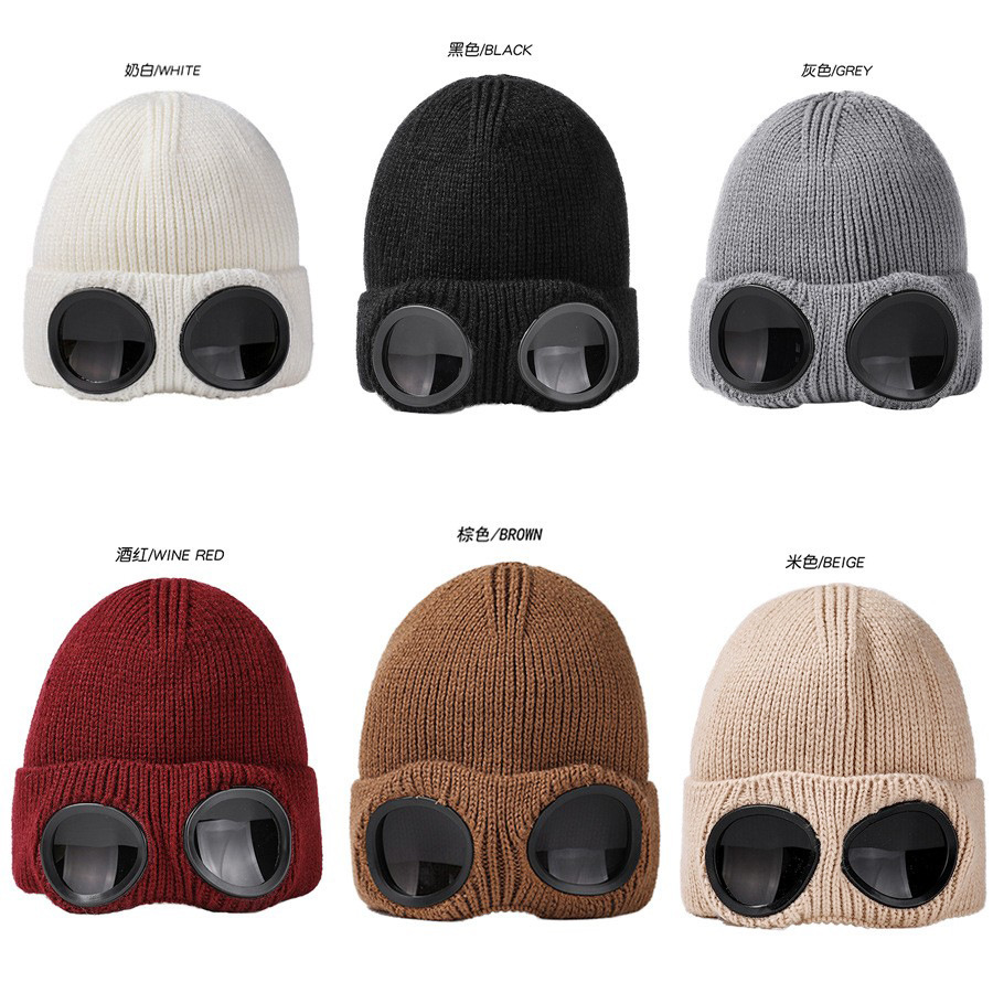跨境帽子秋冬季男女防风眼镜加绒滑雪针织帽亚马逊欧美保暖毛线帽