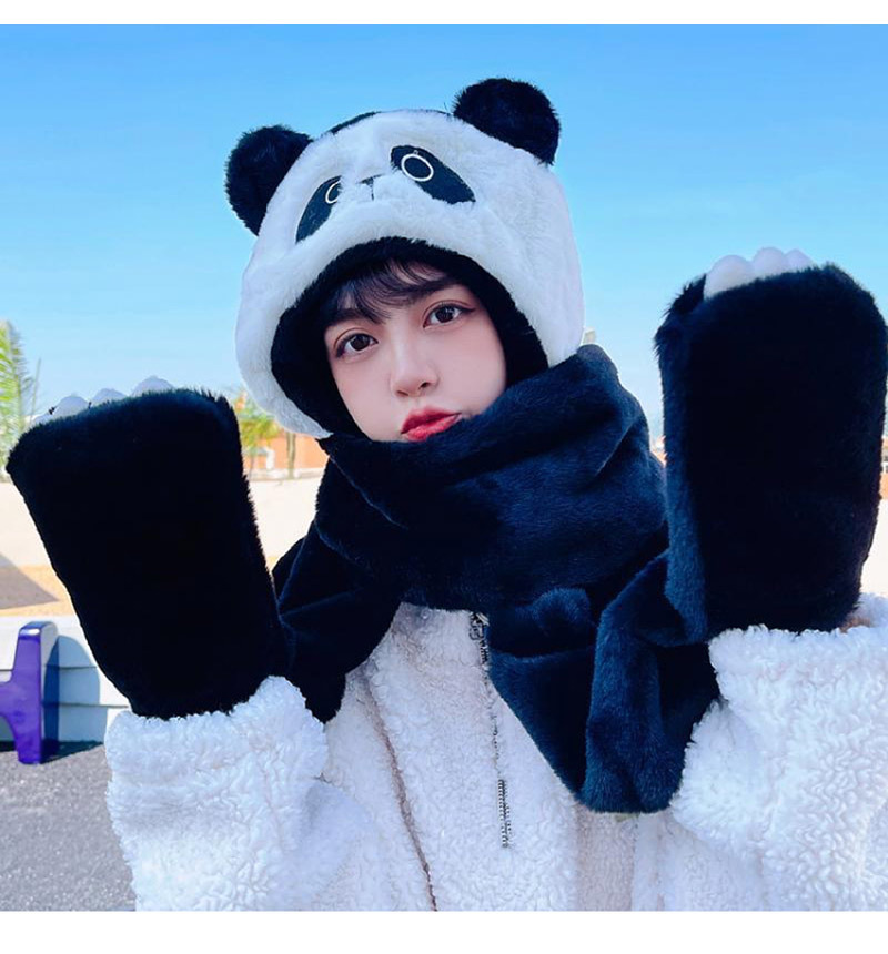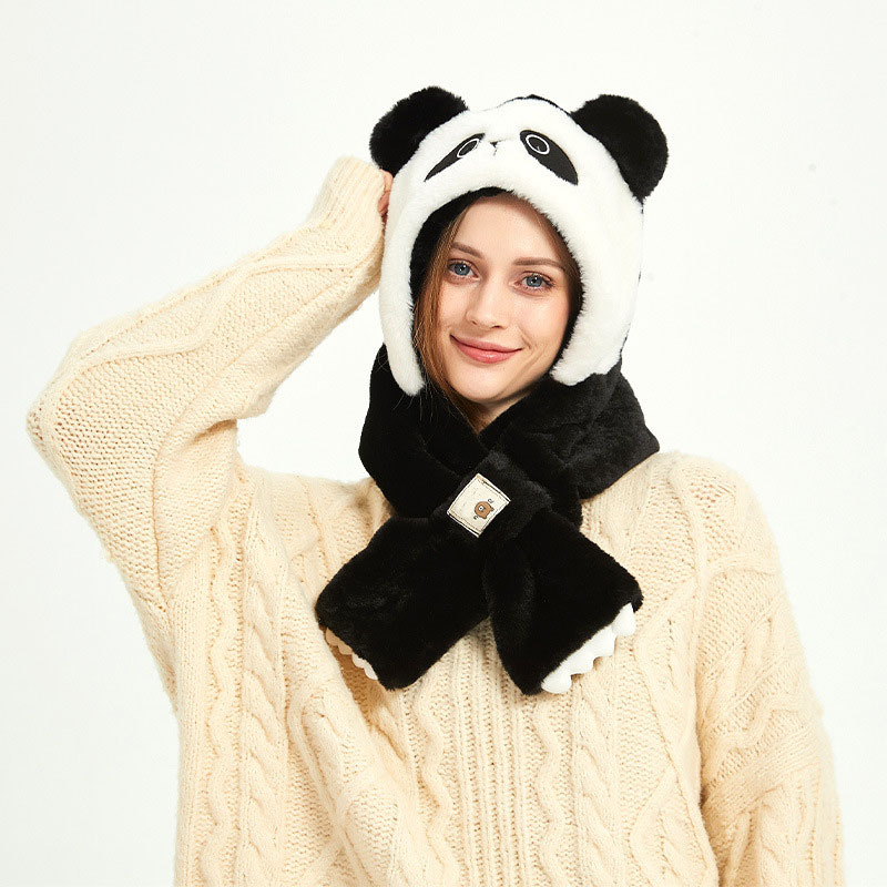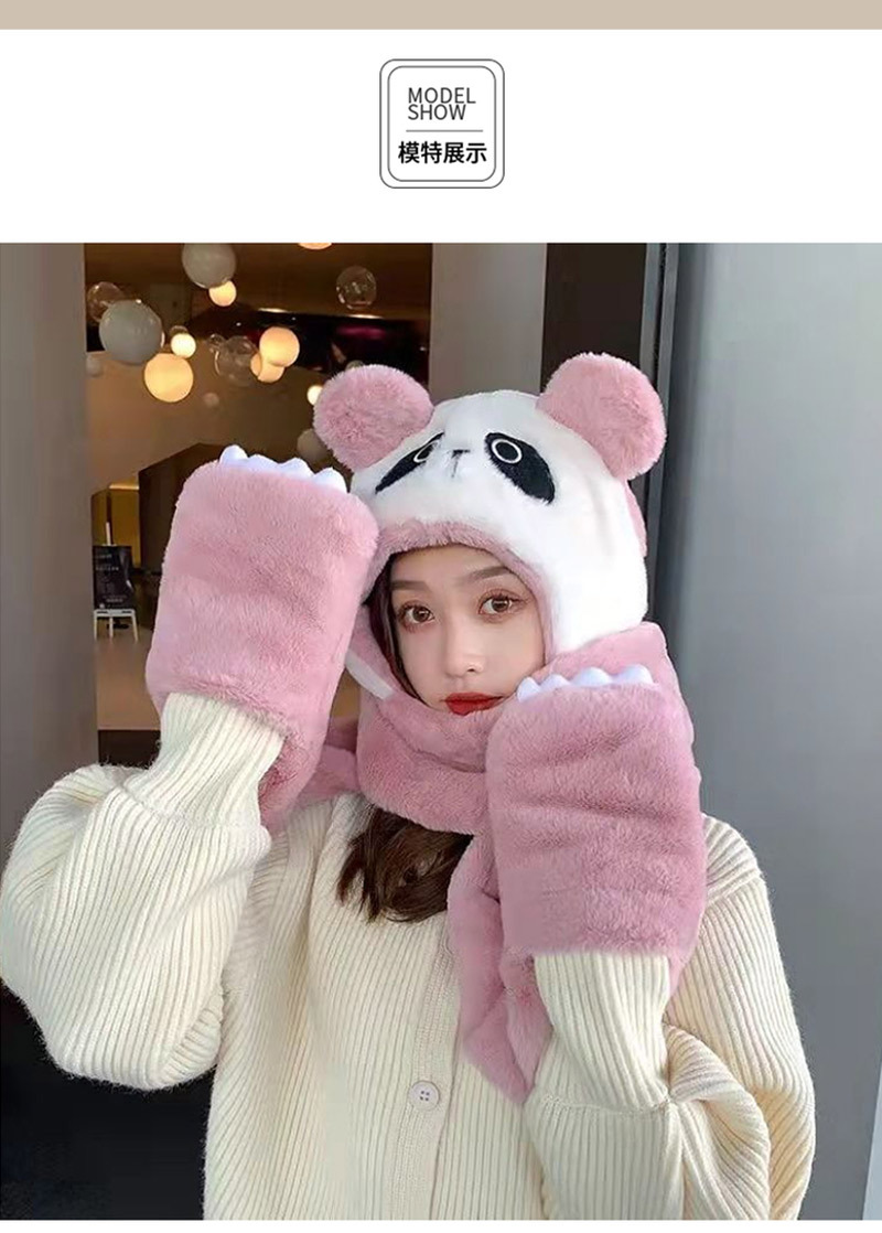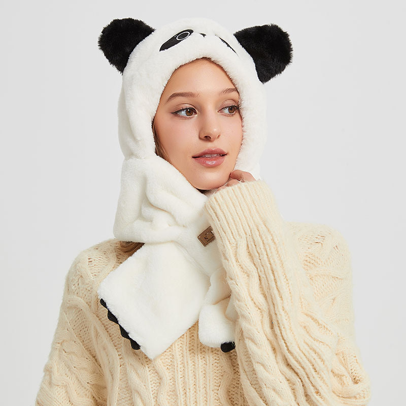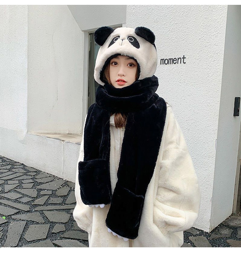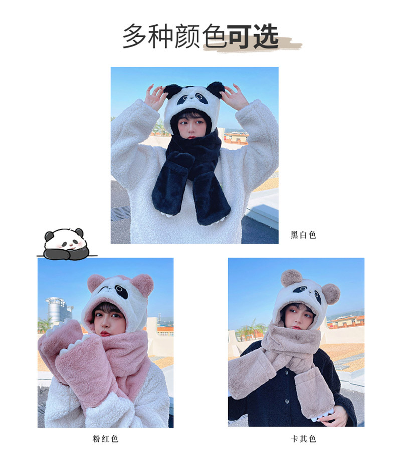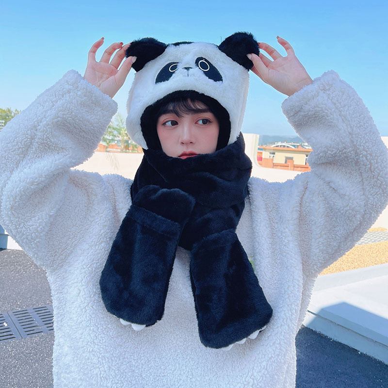 超萌熊猫毛绒帽子三件套秋冬季户外保暖护耳加长围巾一体卡通帽子