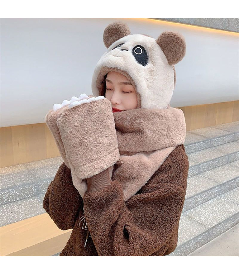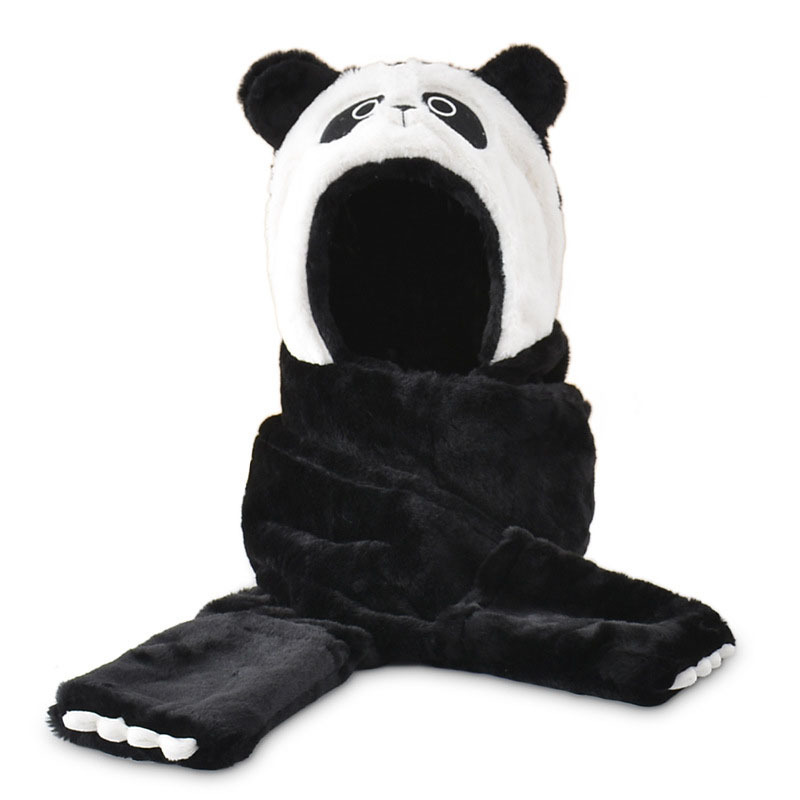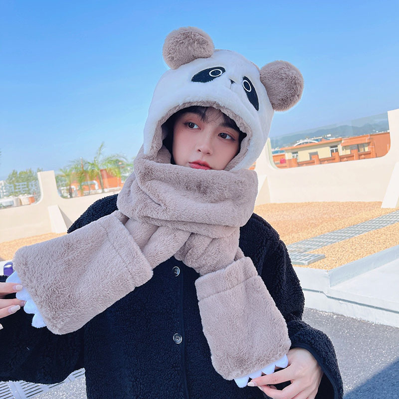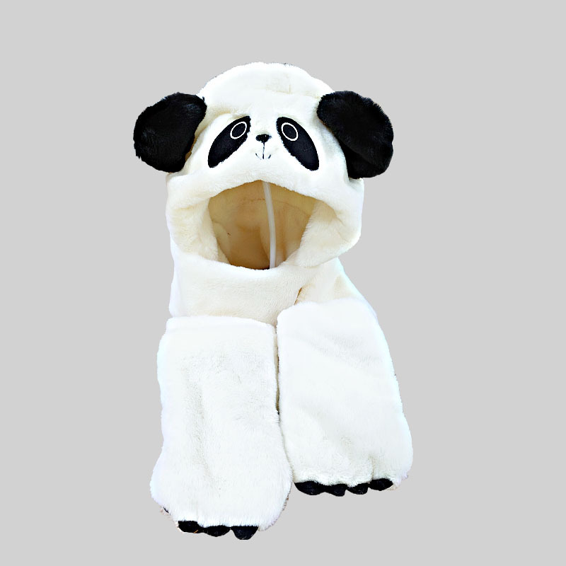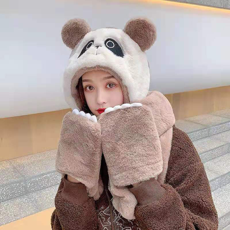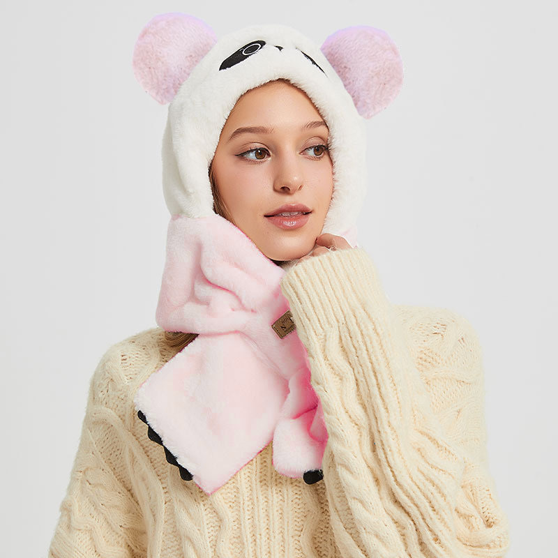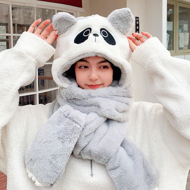 超萌熊猫毛绒帽子三件套秋冬季户外保暖护耳加长围巾一体卡通帽子
