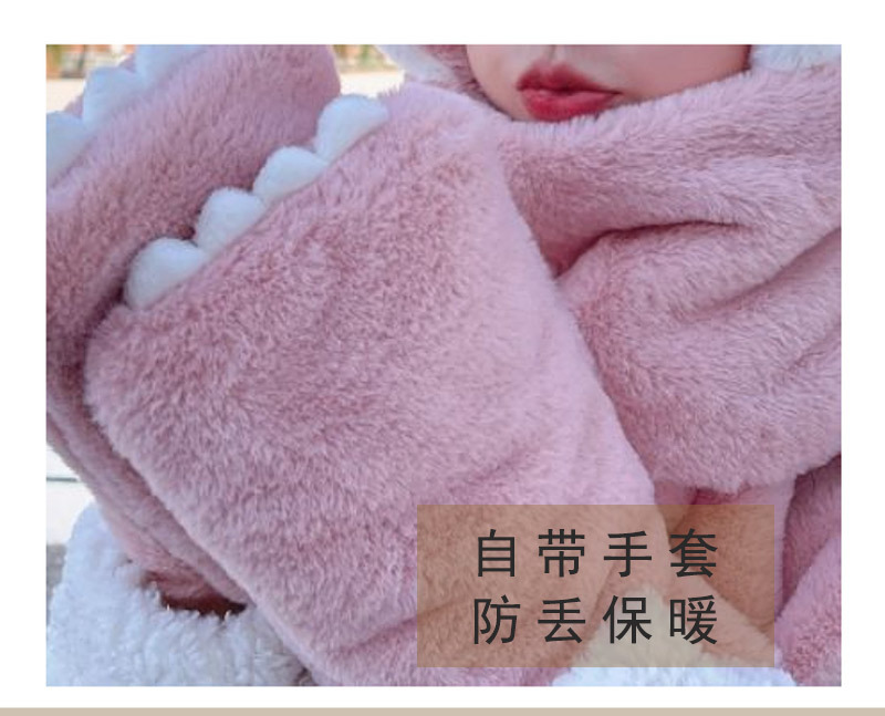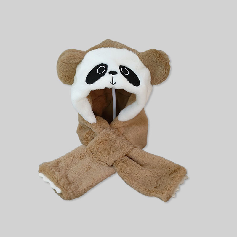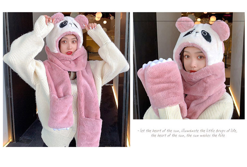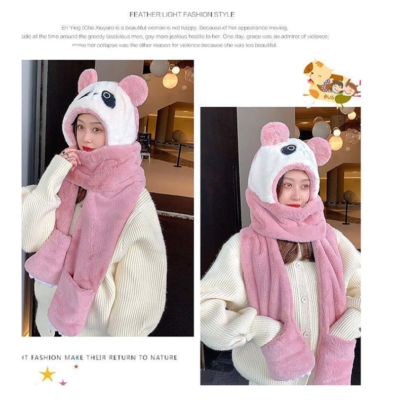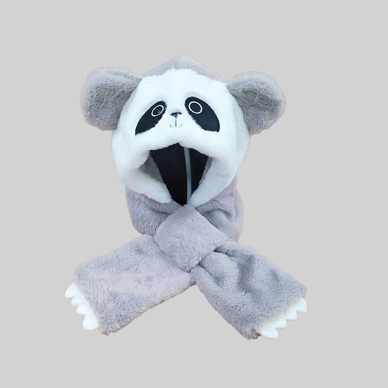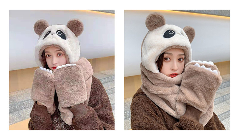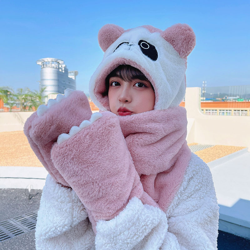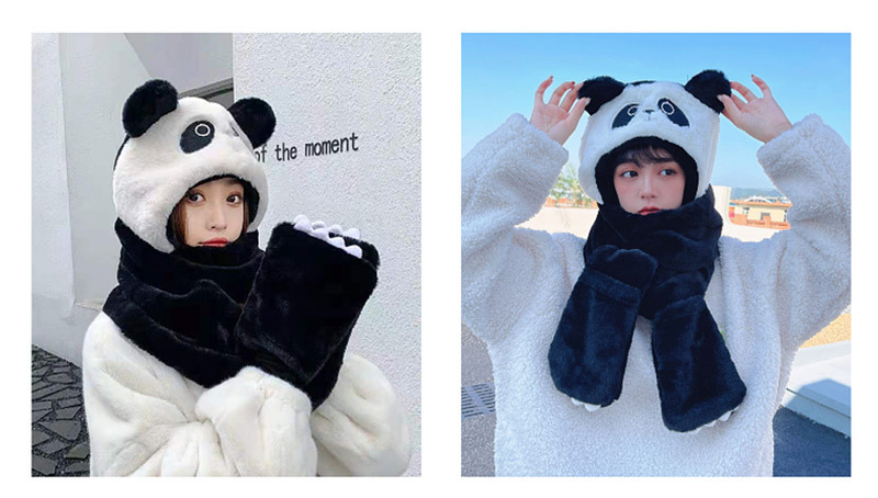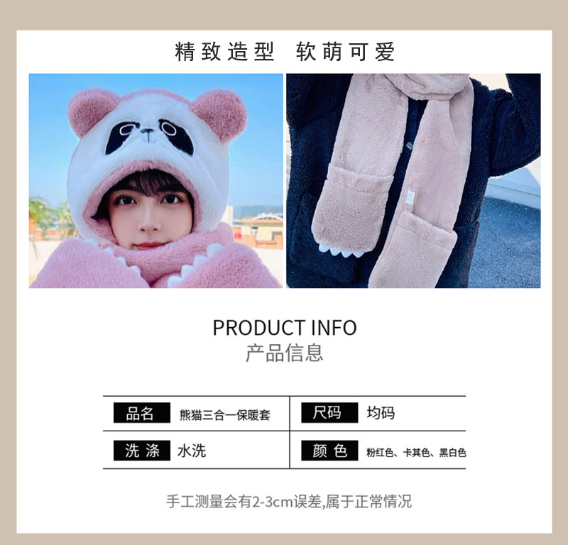 超萌熊猫毛绒帽子三件套秋冬季户外保暖护耳加长围巾一体卡通帽子