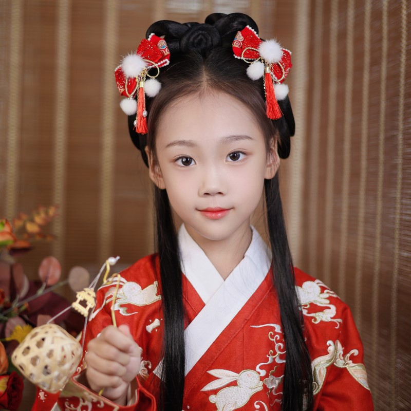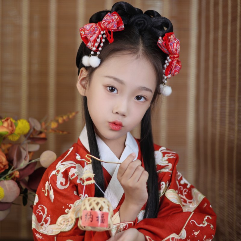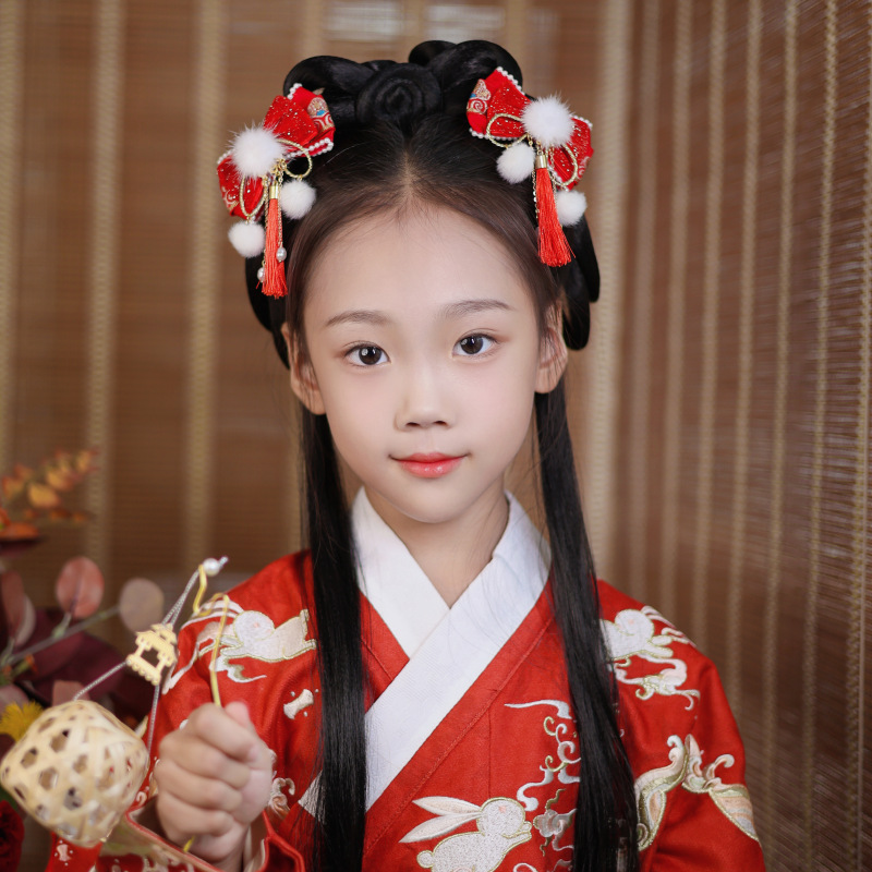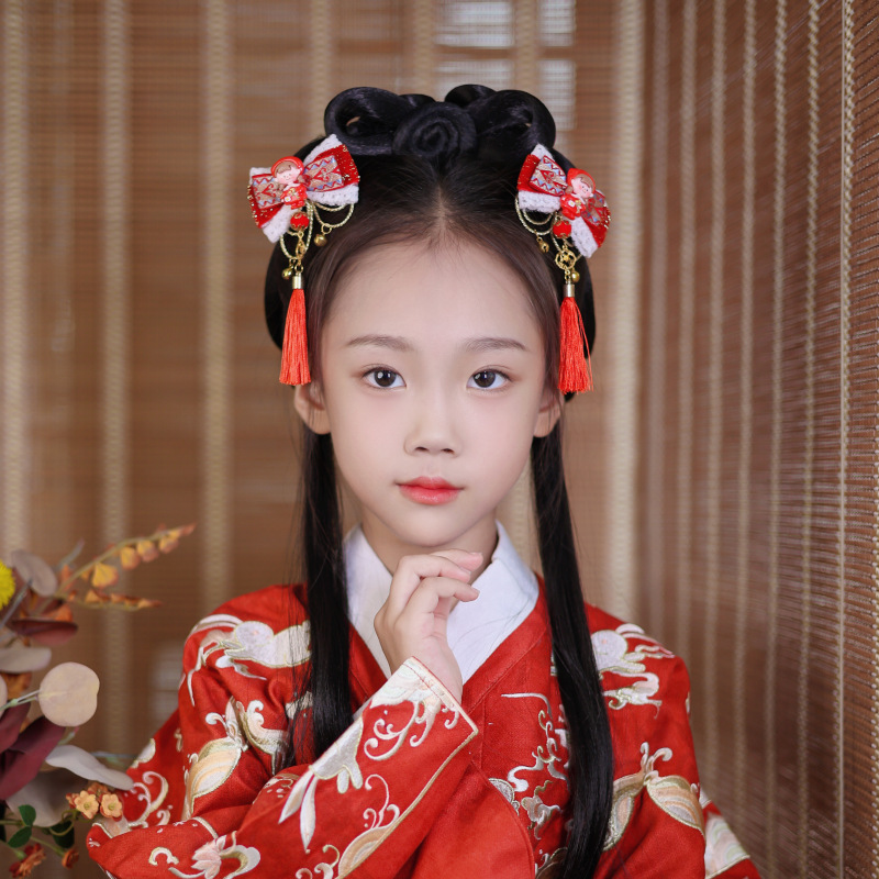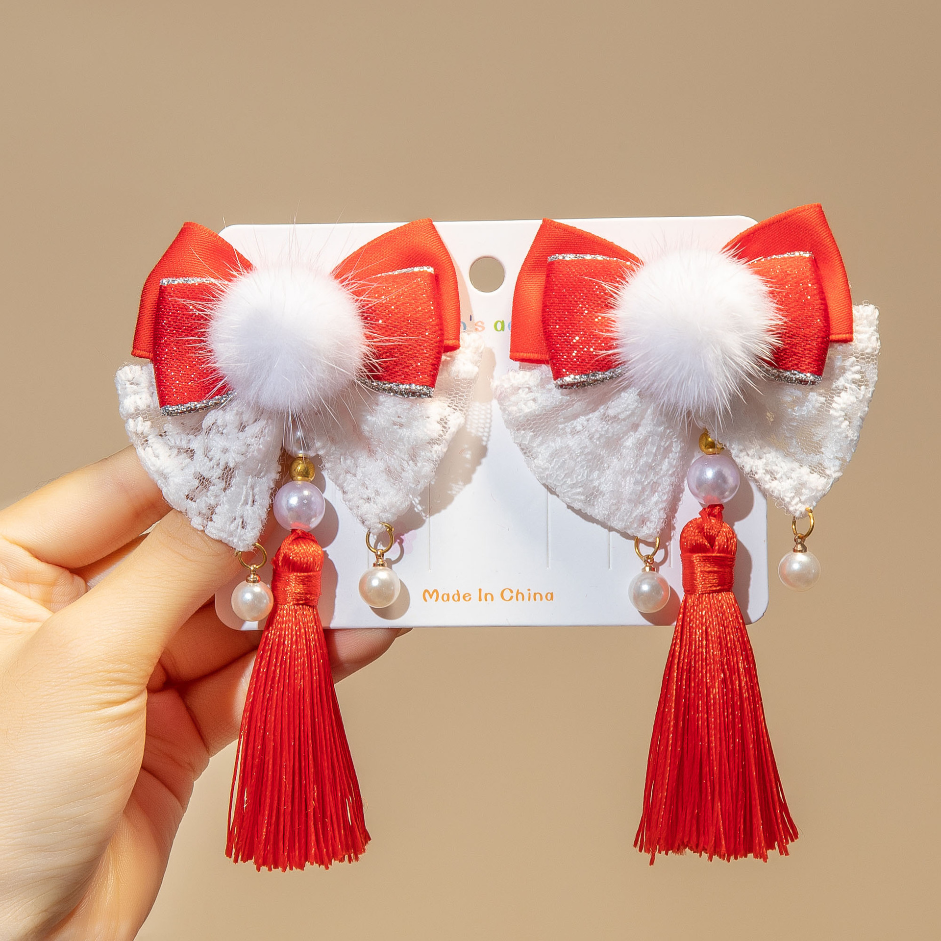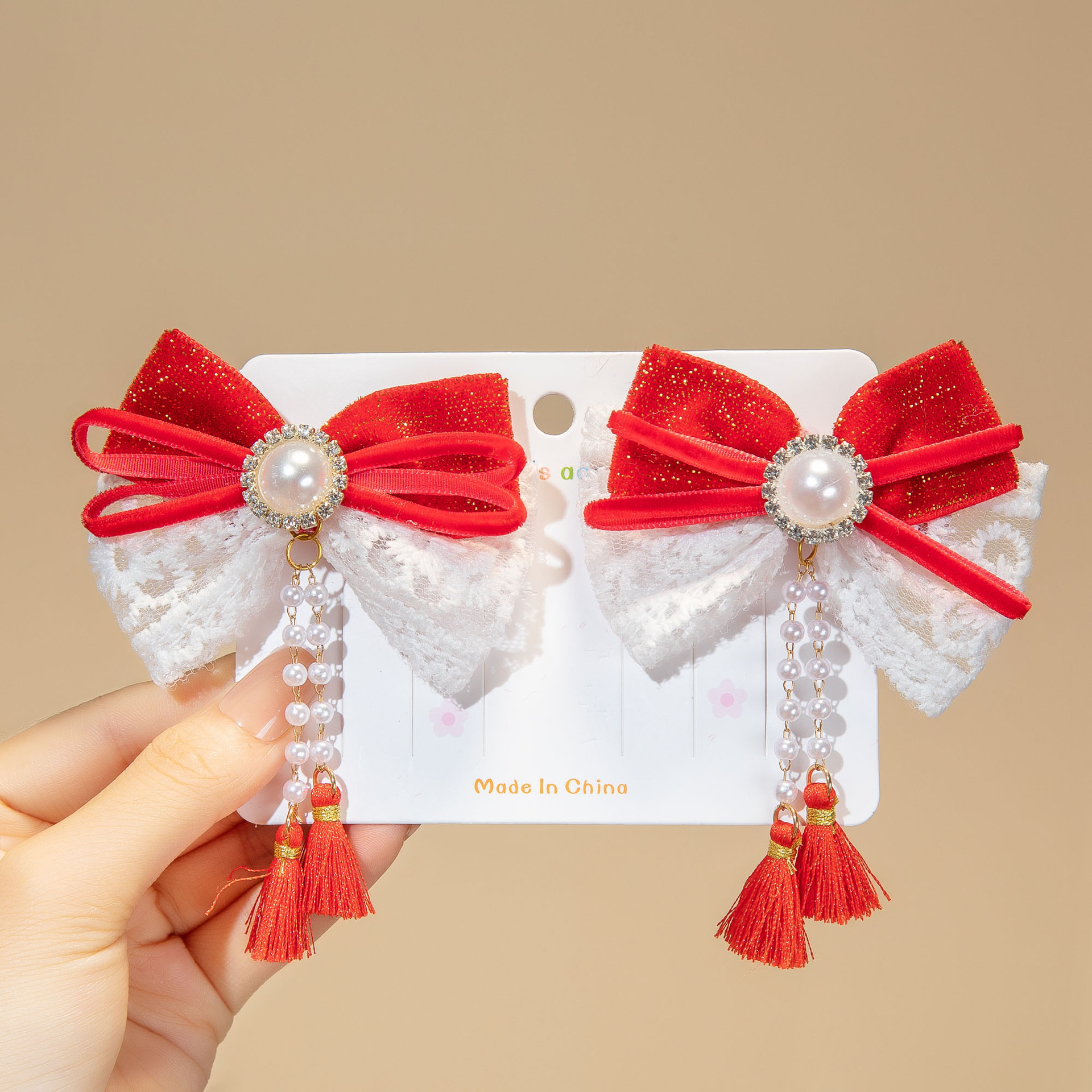 儿童新年喜庆发夹中国风复古布料流苏对夹发饰可爱公主蝴蝶结发卡