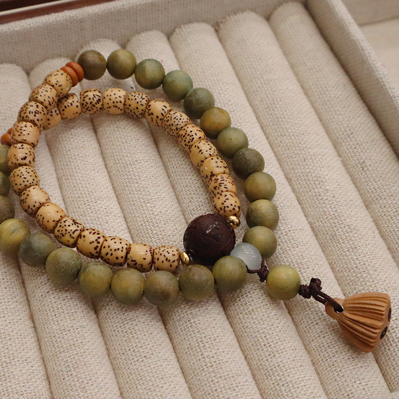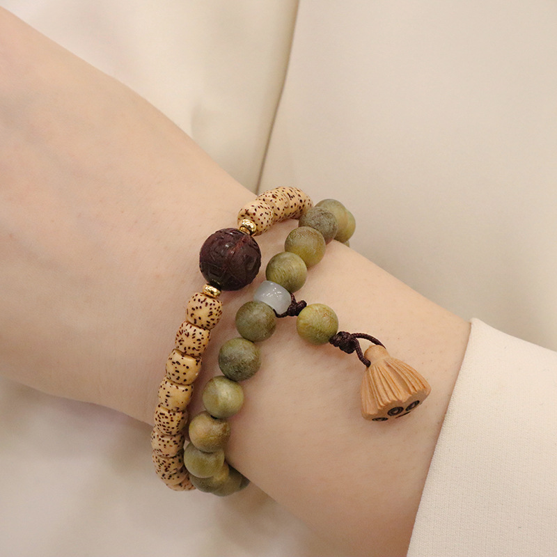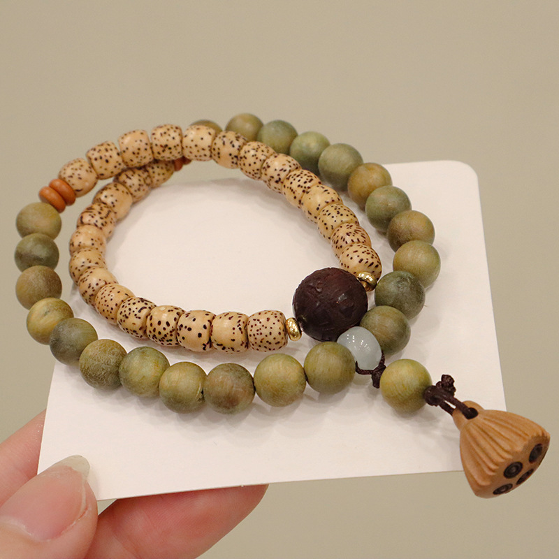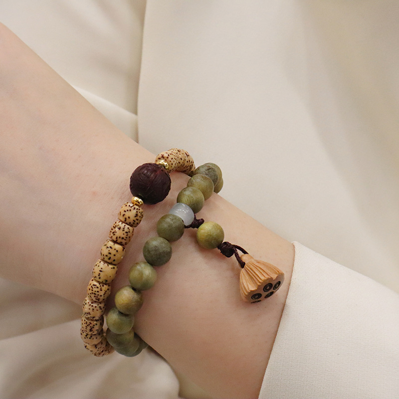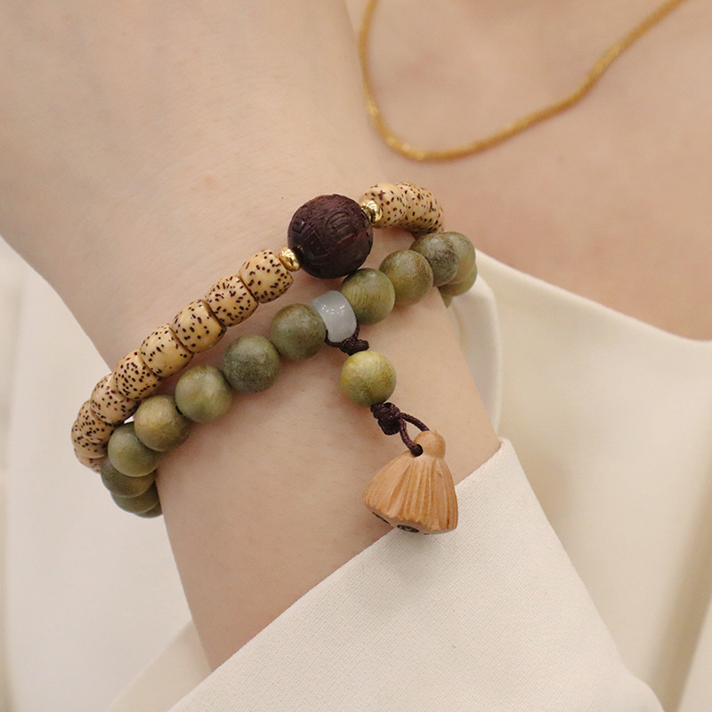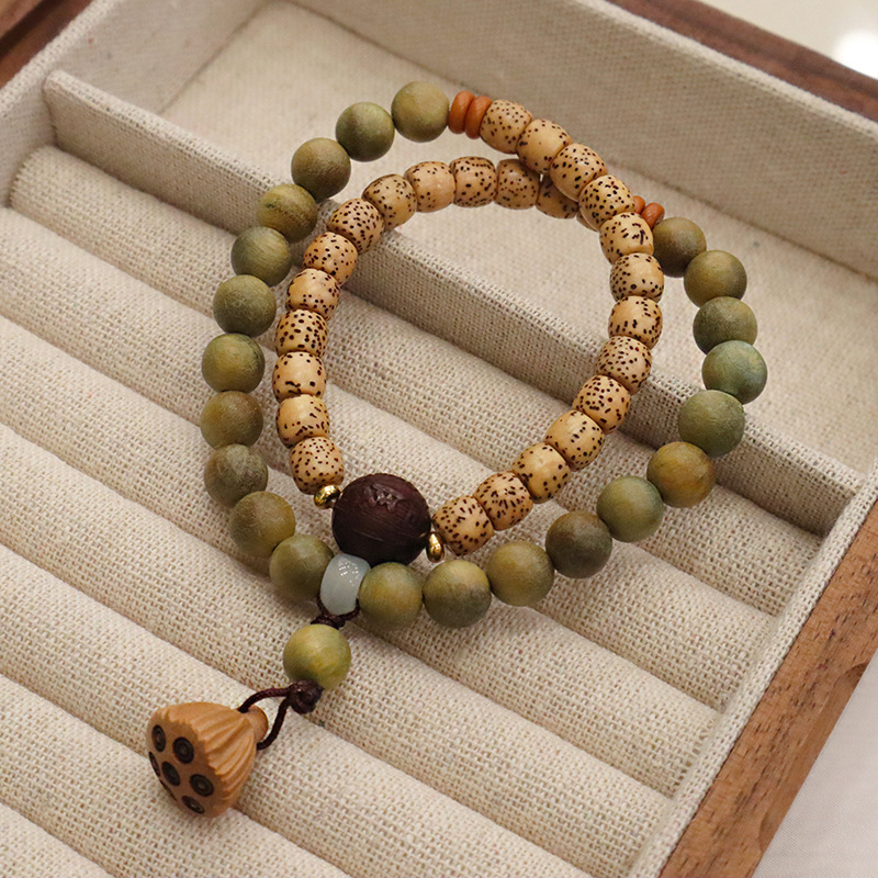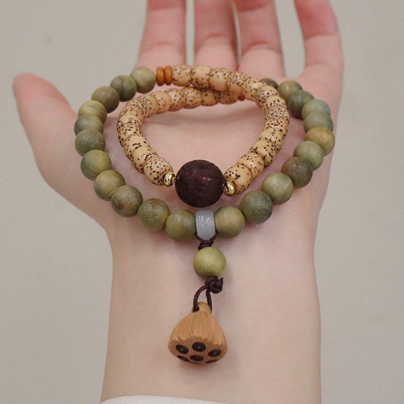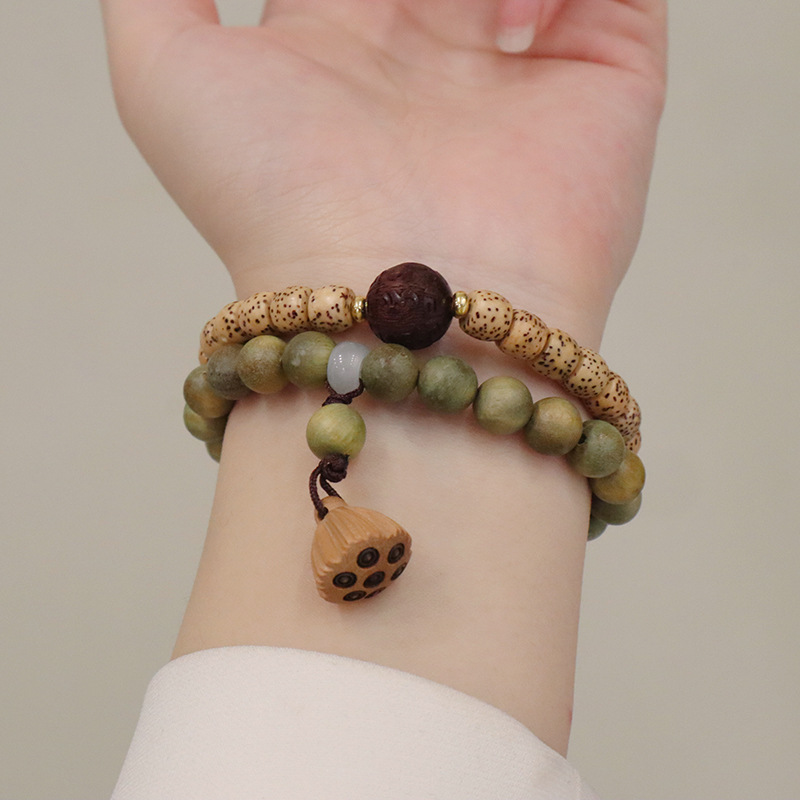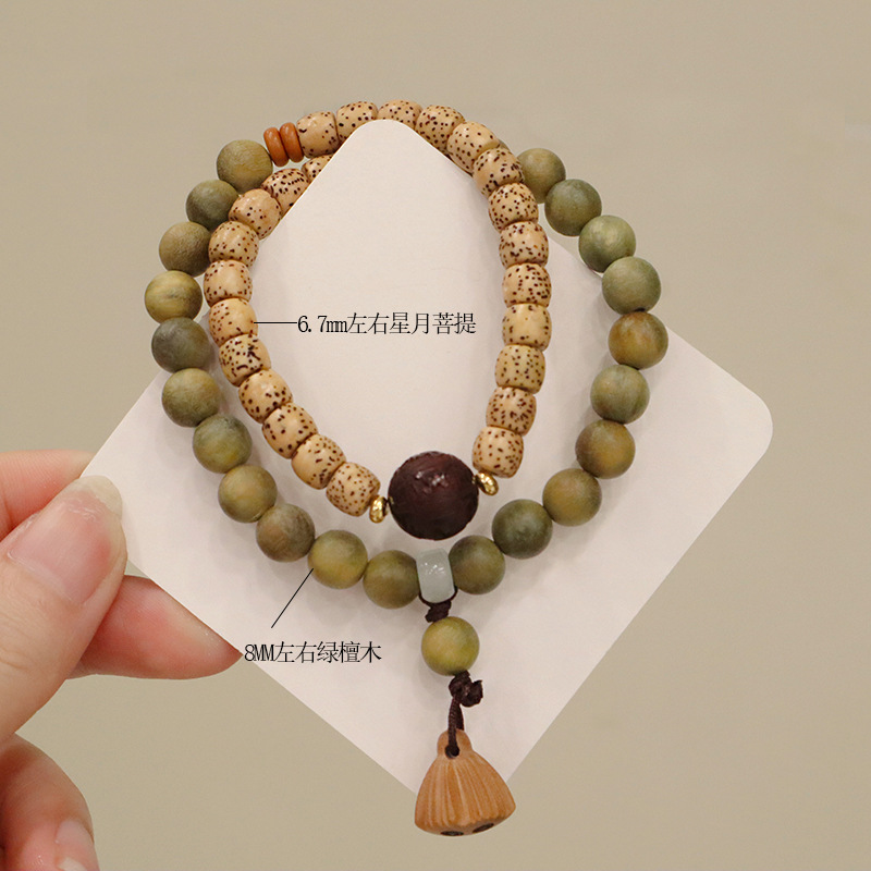 天然绿檀木星月菩提双圈手链莲蓬吊坠男女手串文玩复古手饰品