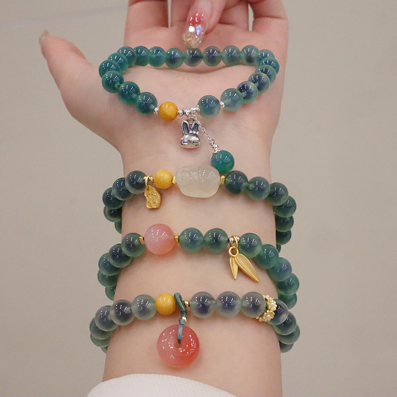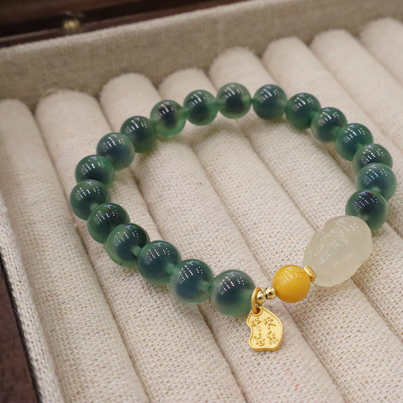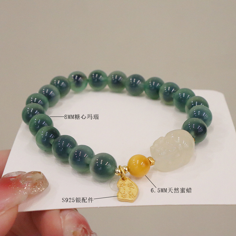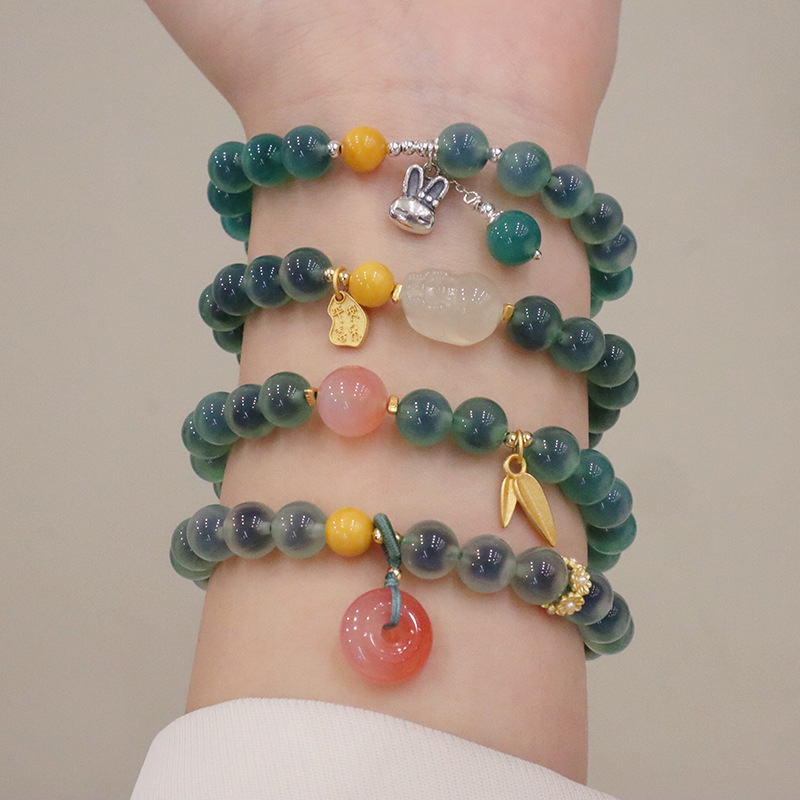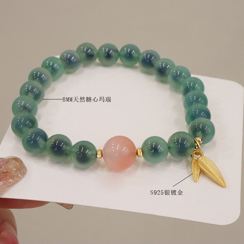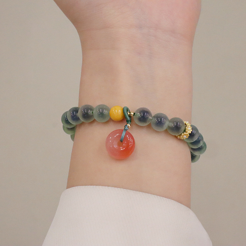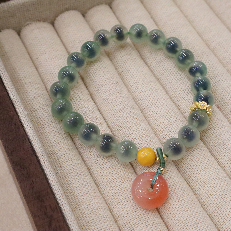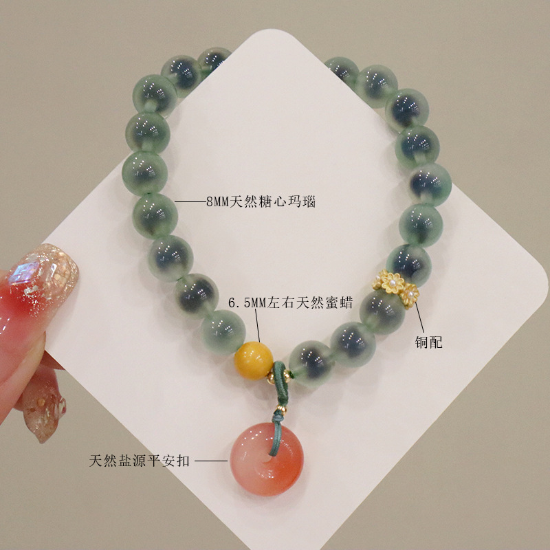 天然绿糖心玛瑙手链女纯银吊坠平安扣手串小清新中国风手饰品