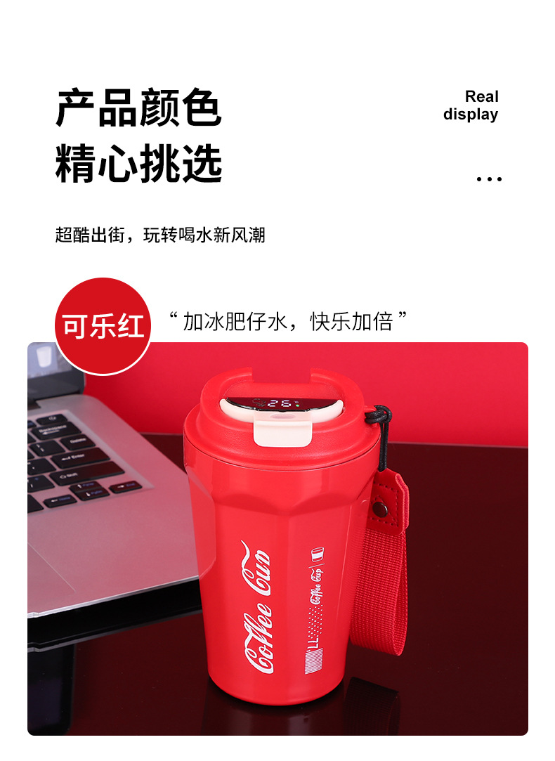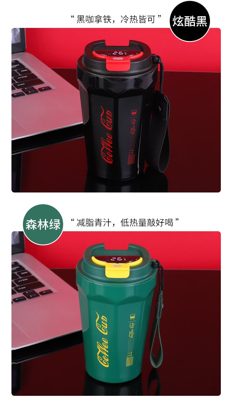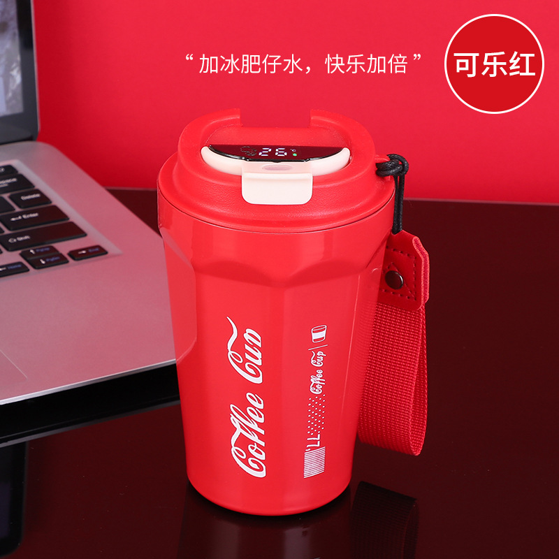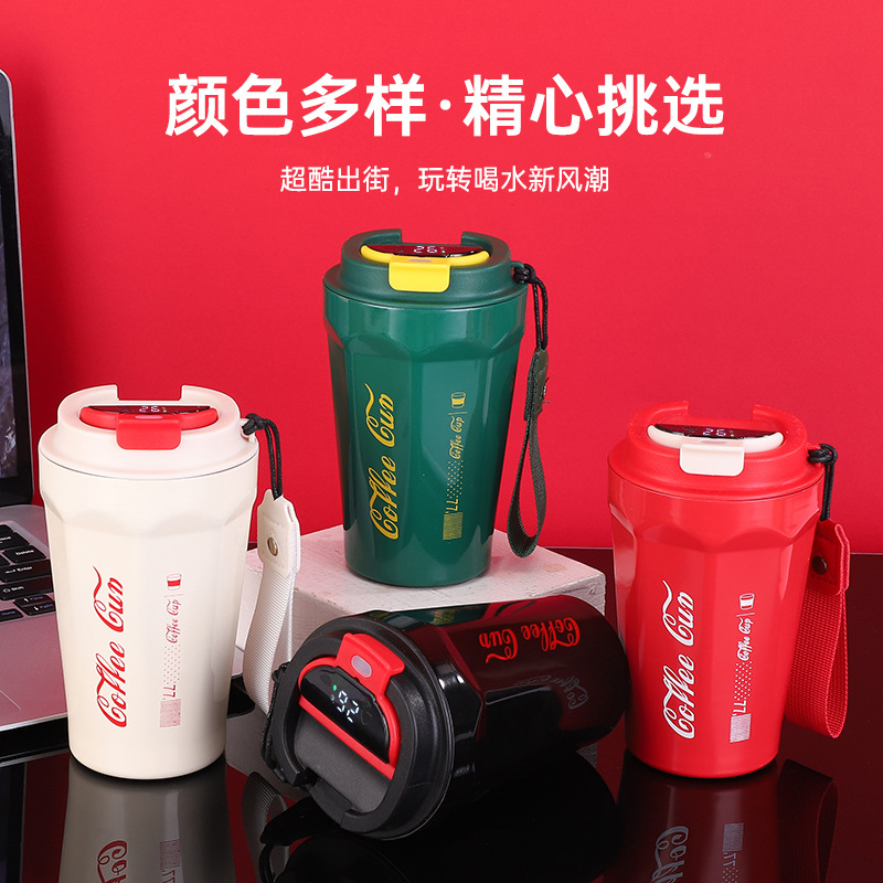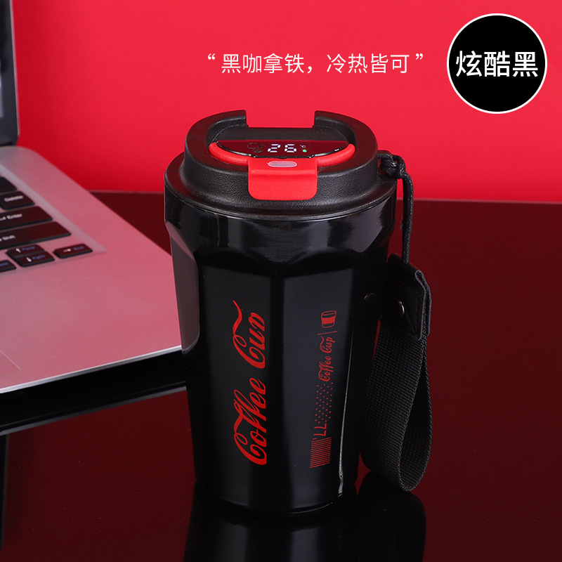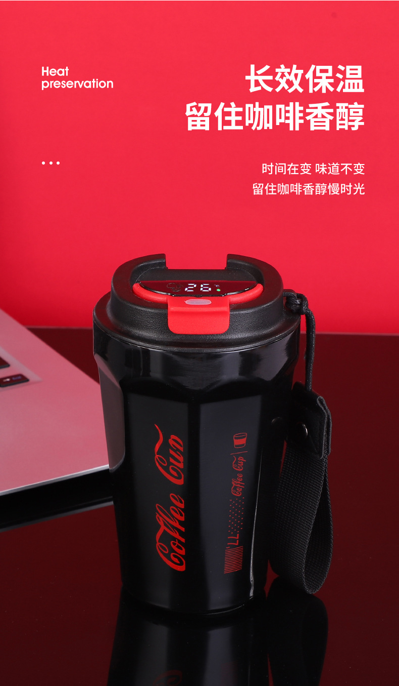 出口热销款智能显温可乐杯八角杯304不锈钢保温杯咖啡杯随行提绳