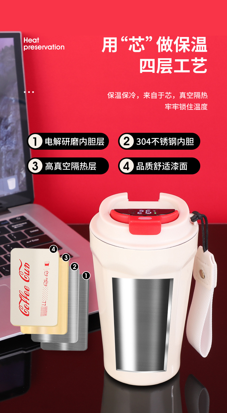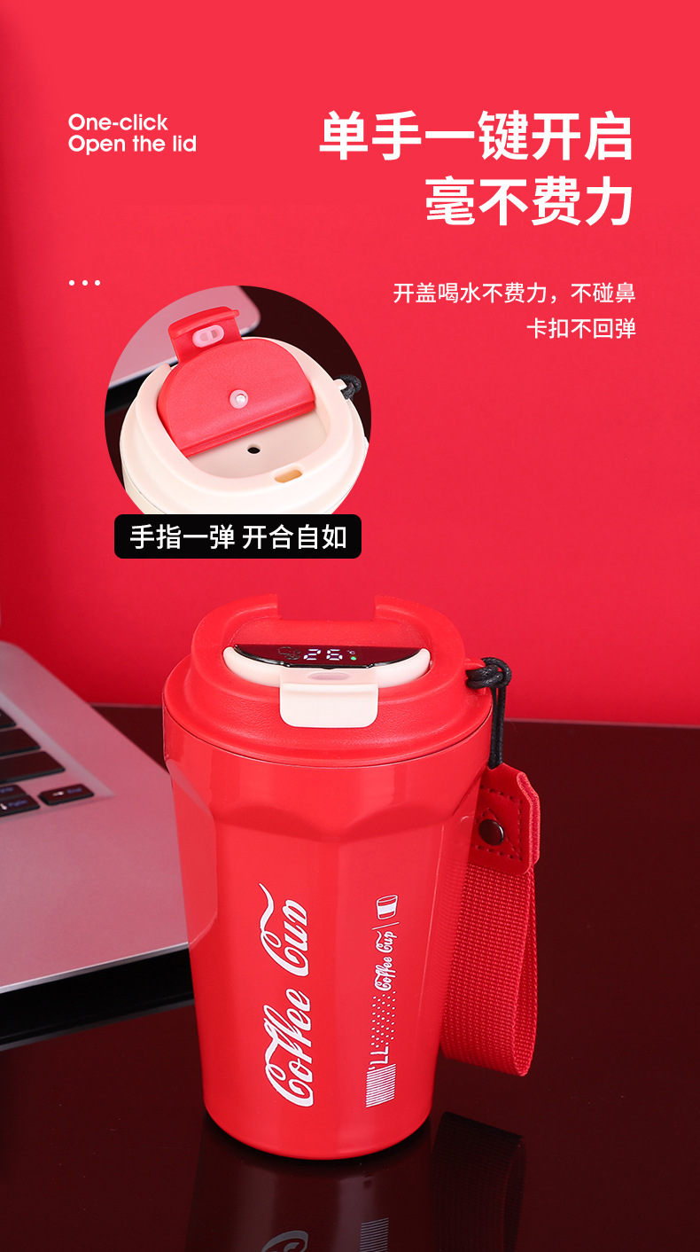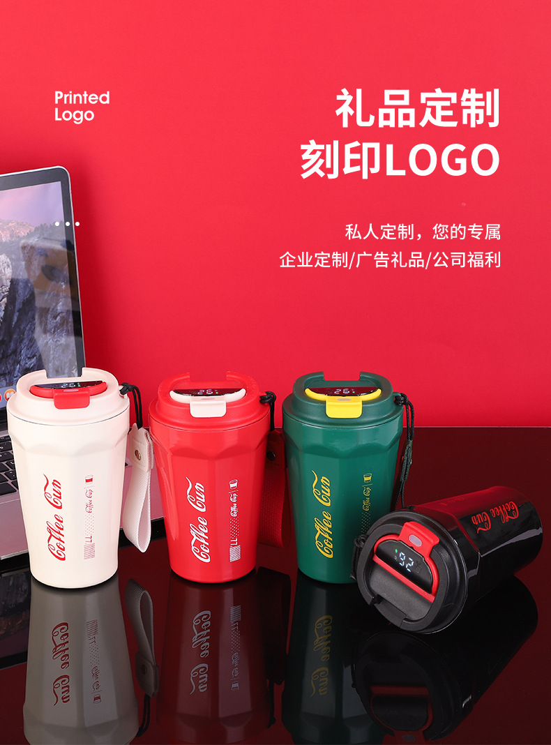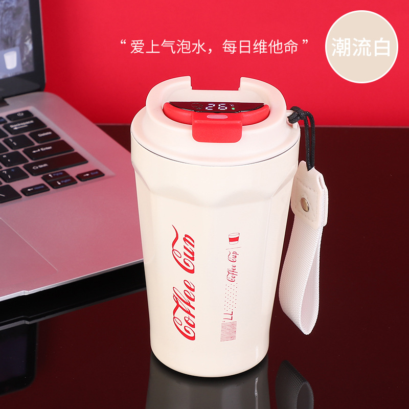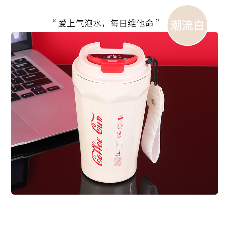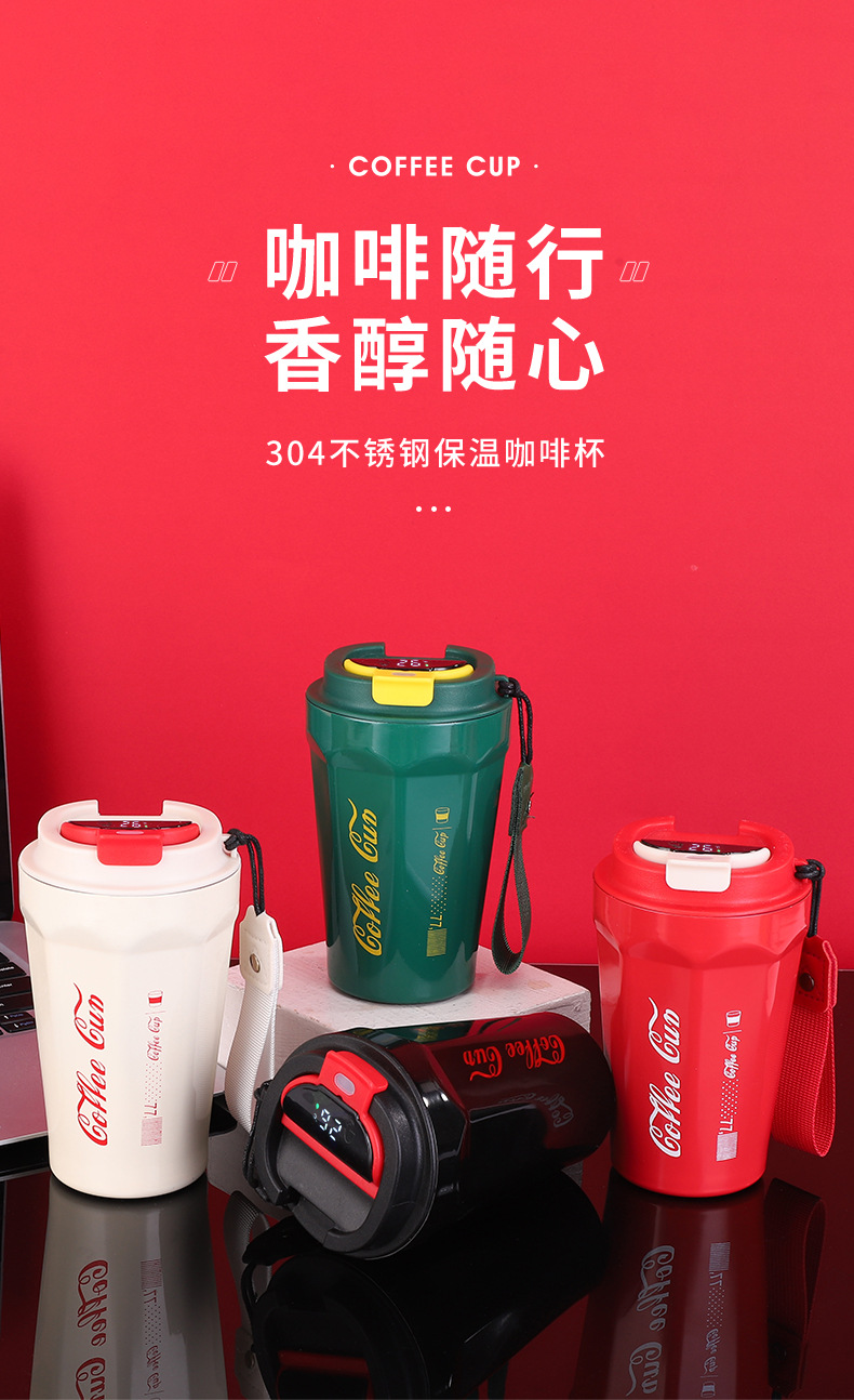 出口热销款智能显温可乐杯八角杯304不锈钢保温杯咖啡杯随行提绳