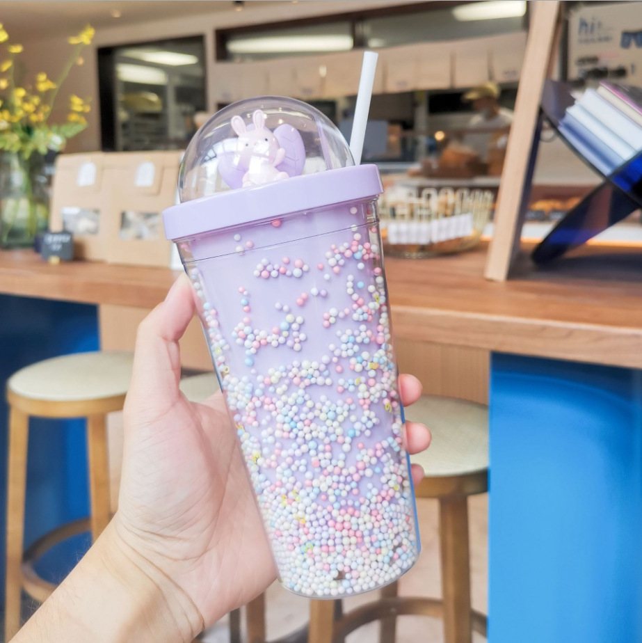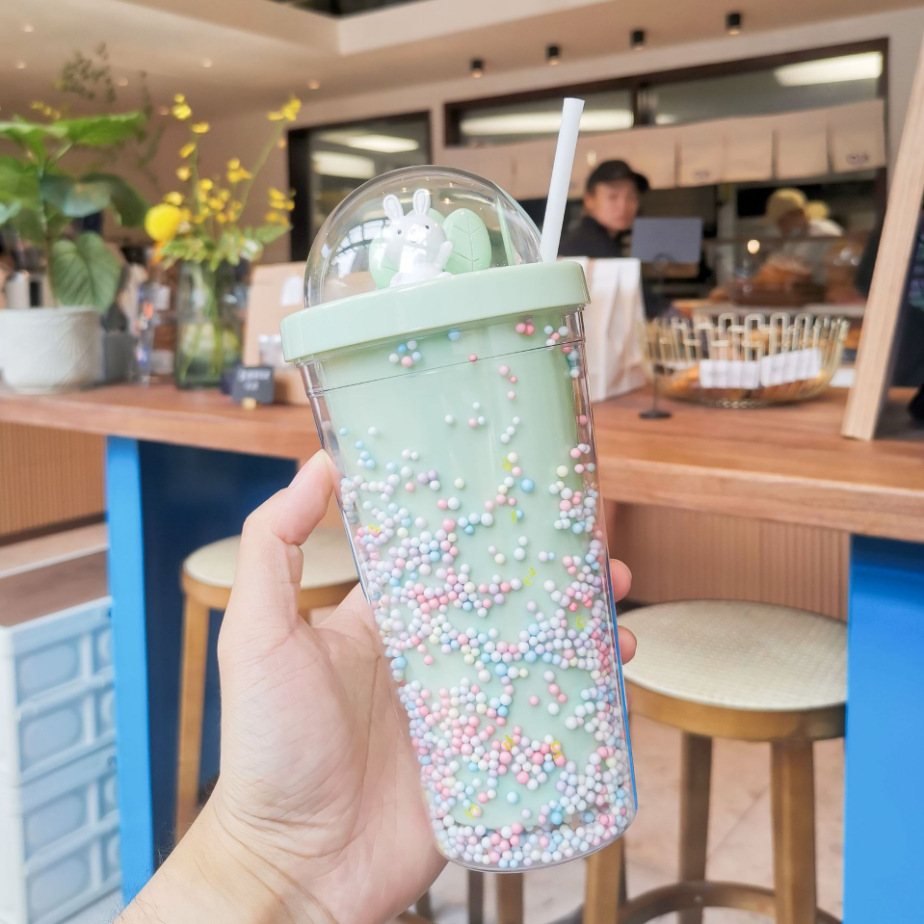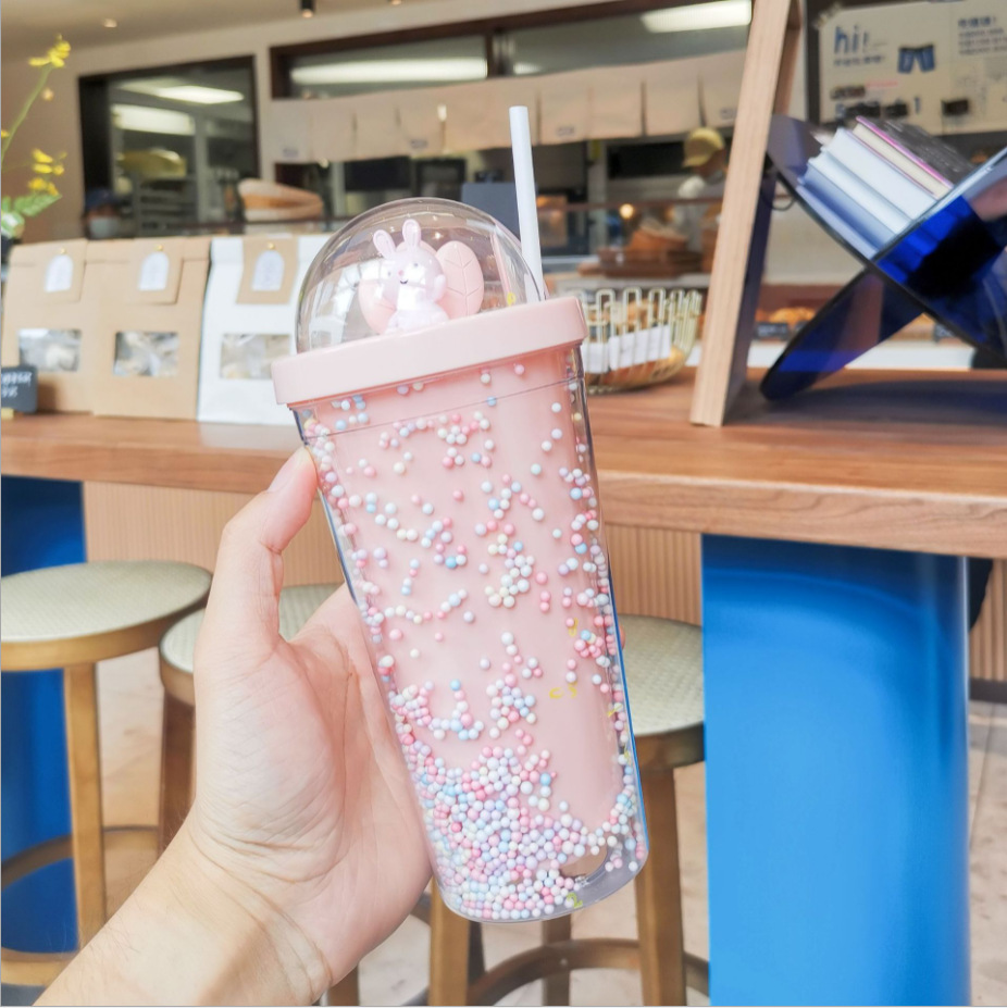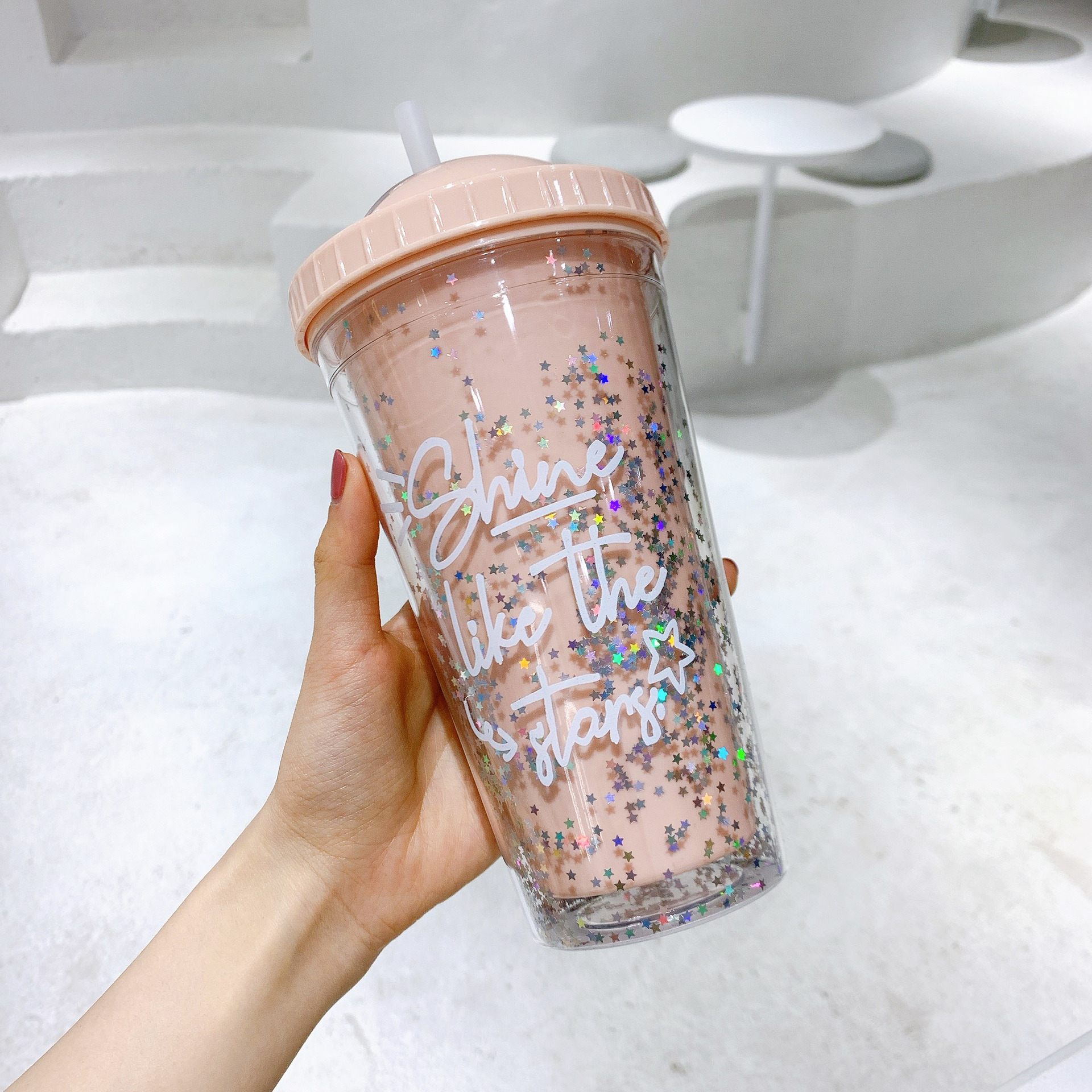 韩版塑料杯双层带吸管网红ins水杯少女家用办公早餐牛奶果汁杯子