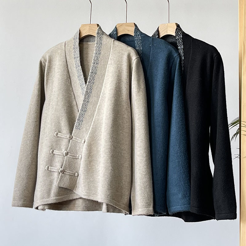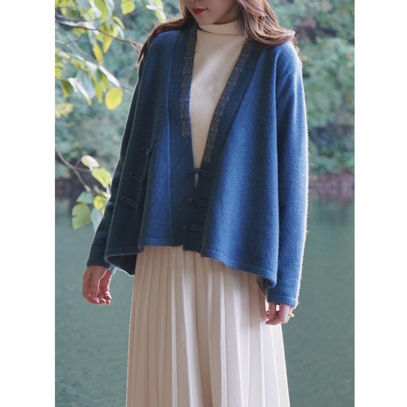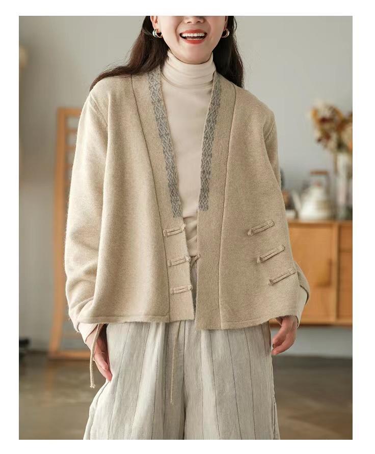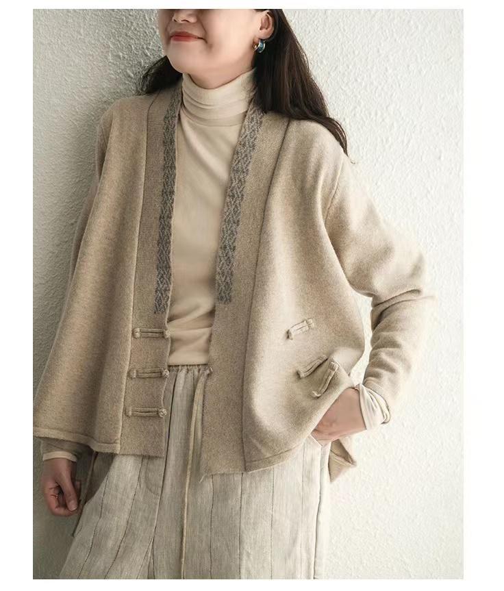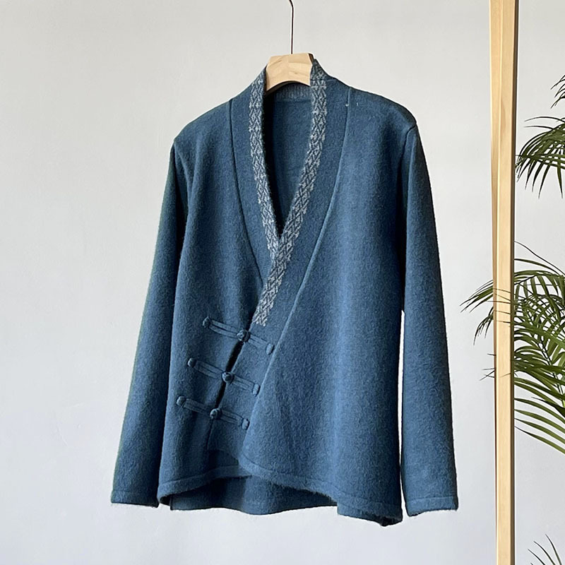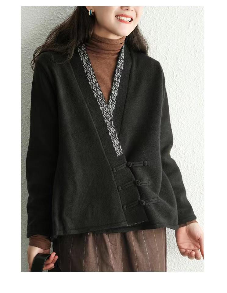 国风毛衣 V领针织外套新款冬季女装中式斜襟盘扣毛衣开衫50869
