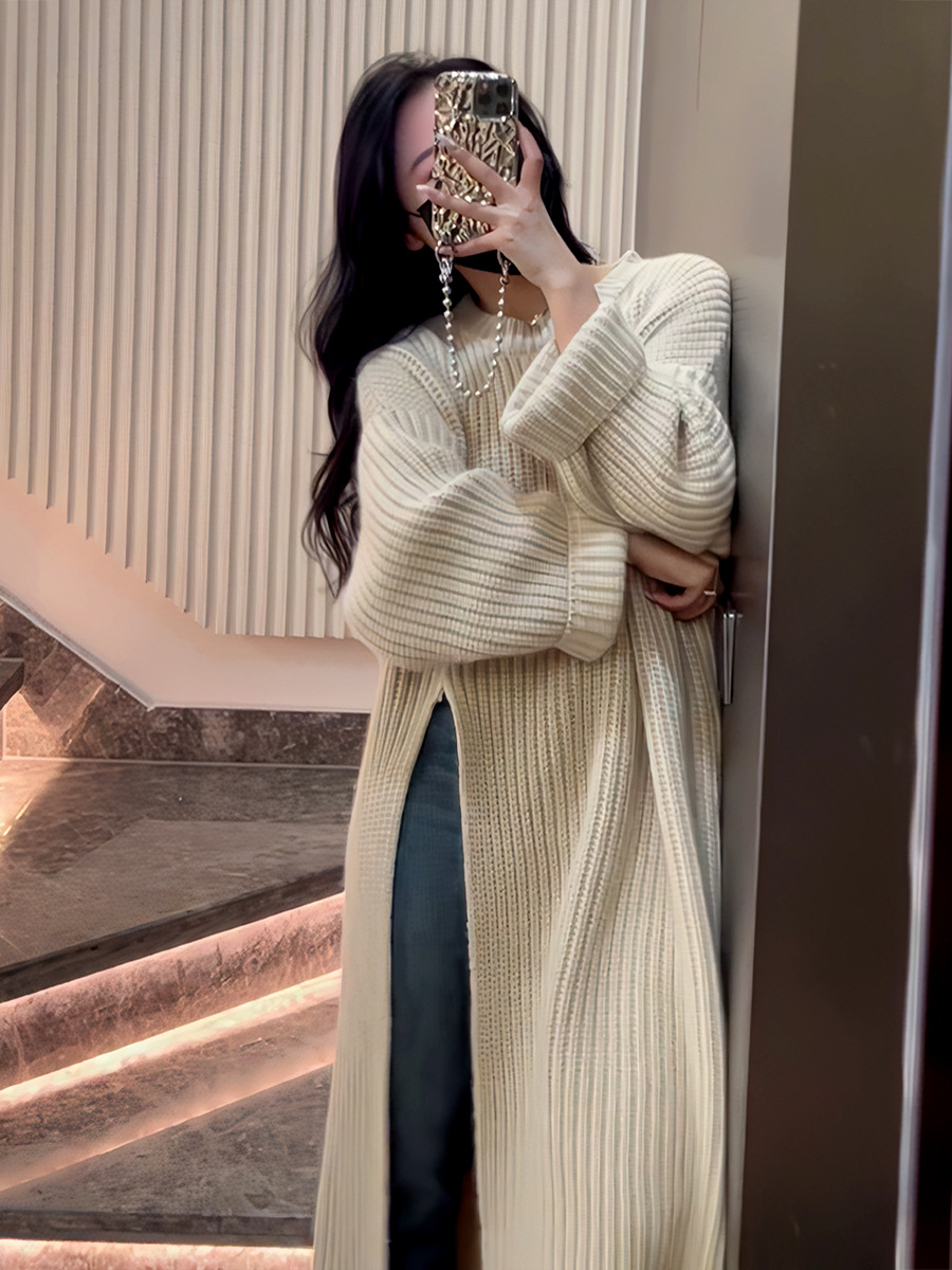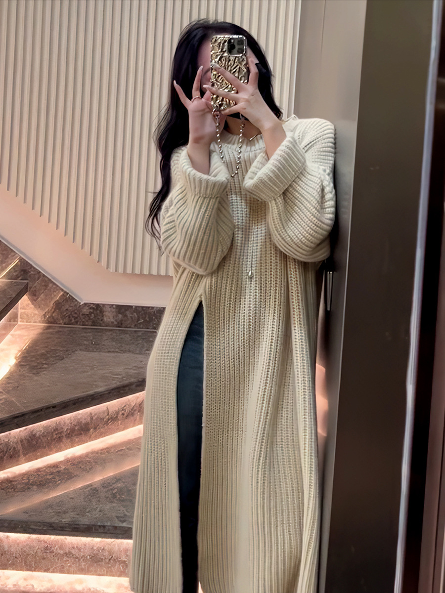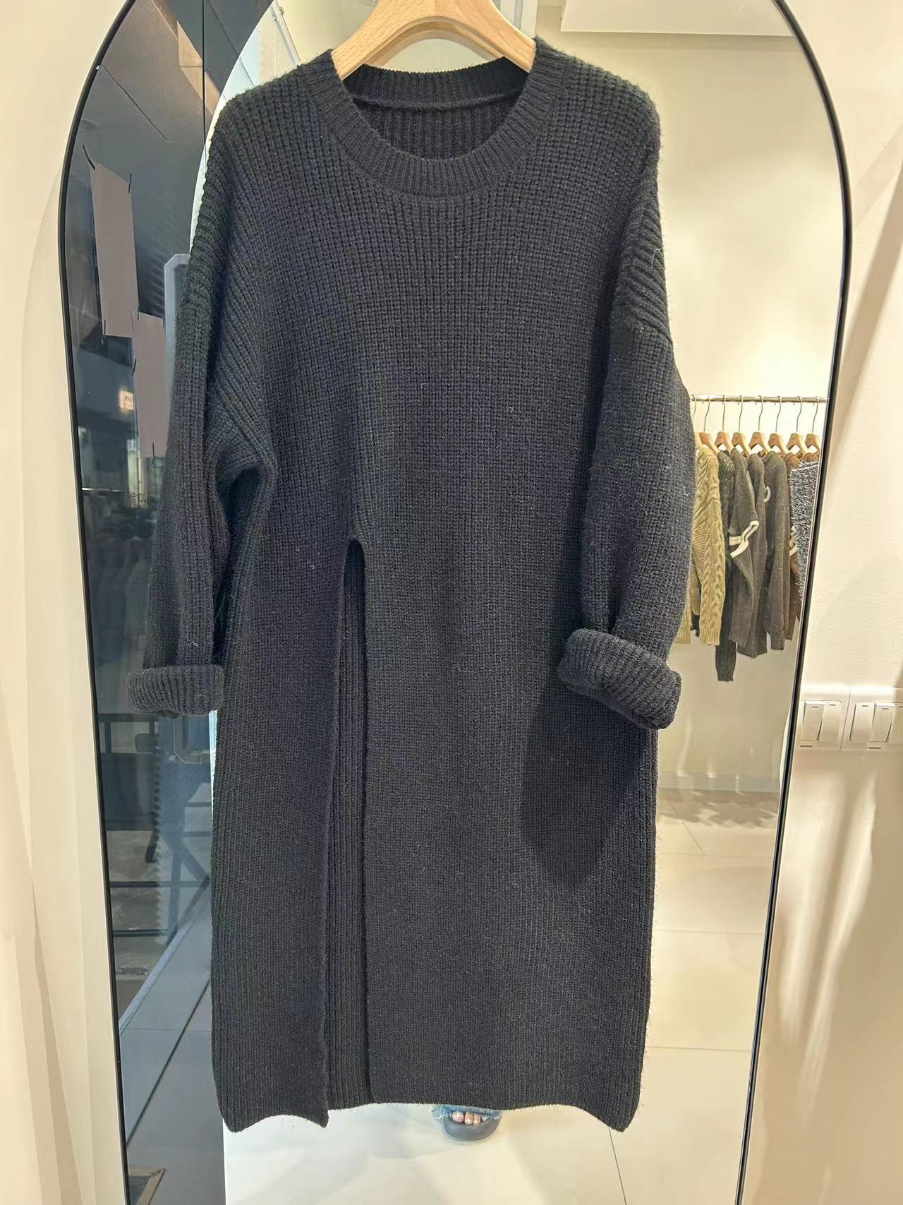 韩版慵懒风宽松针织连衣裙女秋冬新款侧开叉设计感中长款套头毛衣