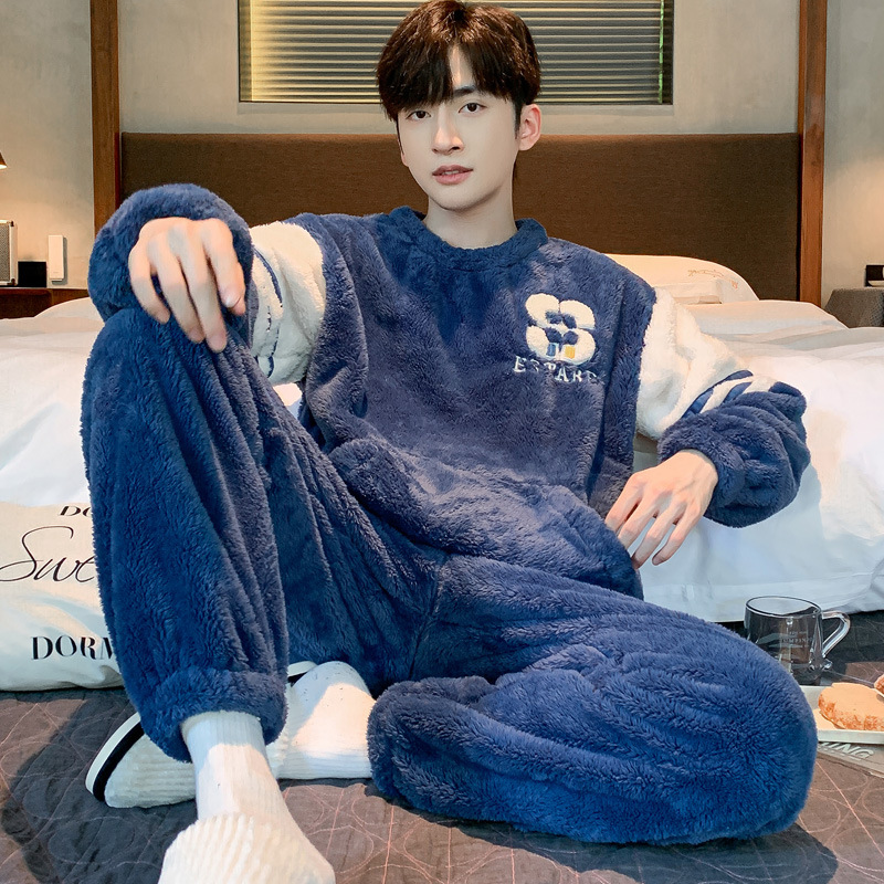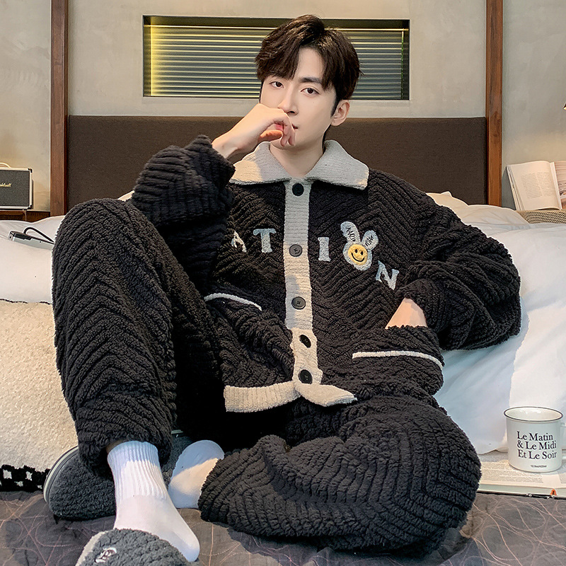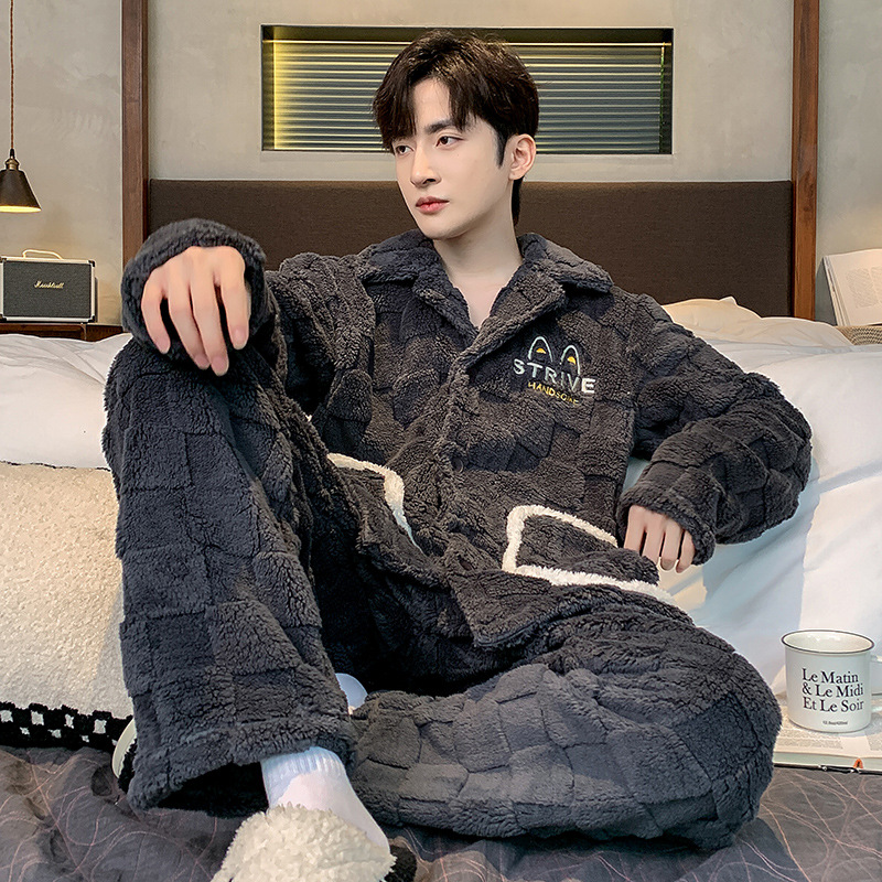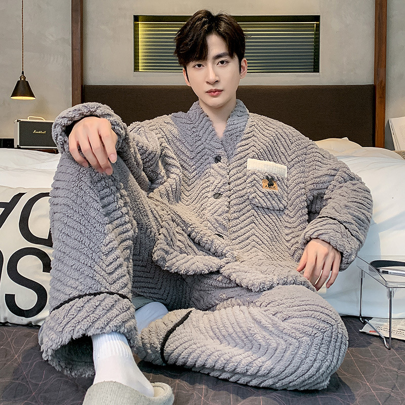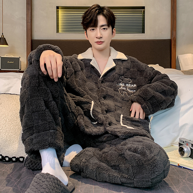 珊瑚绒睡衣男秋冬季加绒加厚套装男士韩版拉链法兰绒开衫家居服男