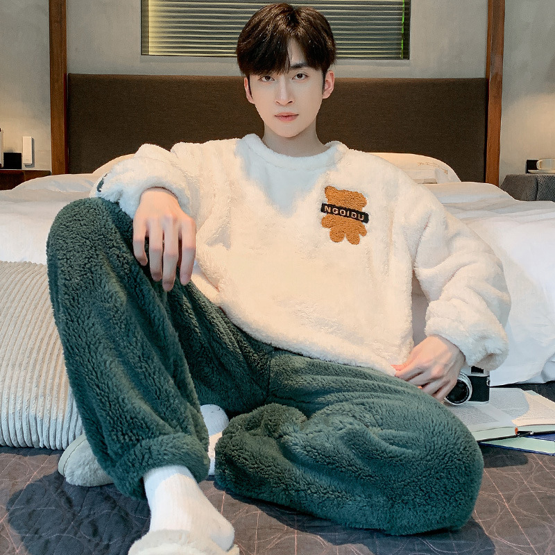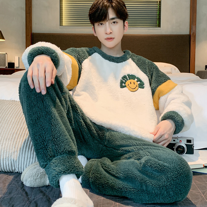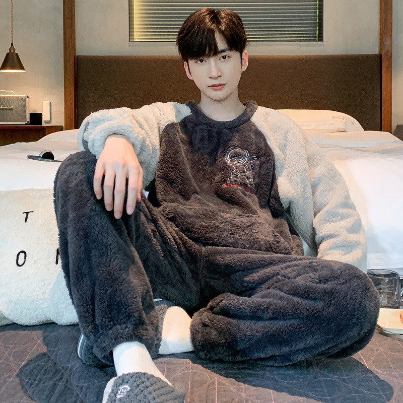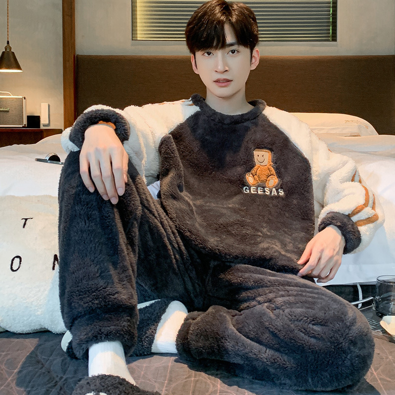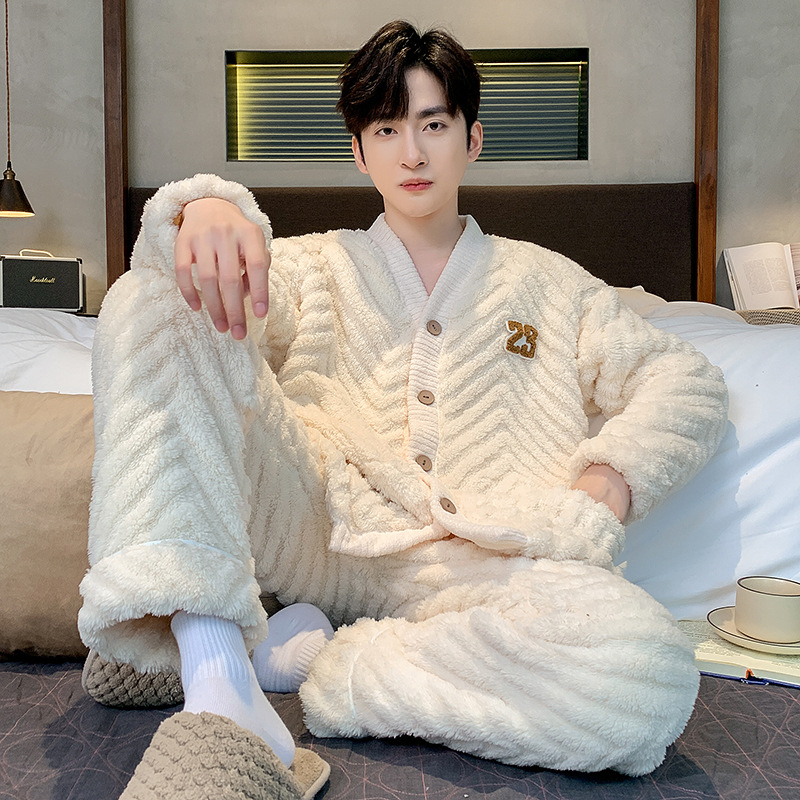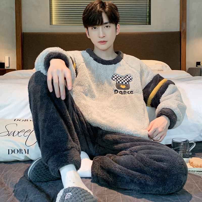 珊瑚绒睡衣男秋冬季加绒加厚套装男士韩版拉链法兰绒开衫家居服男