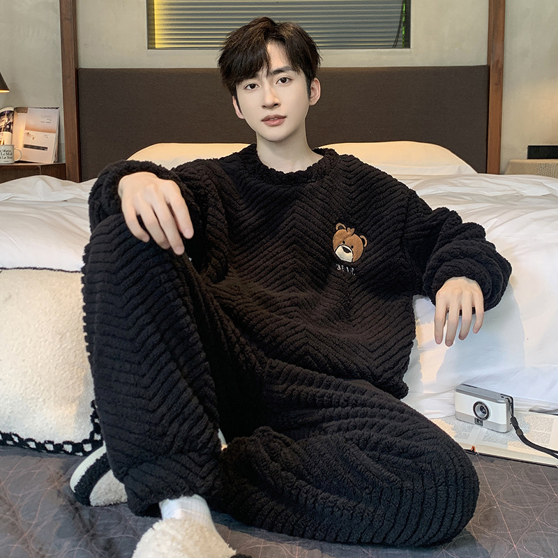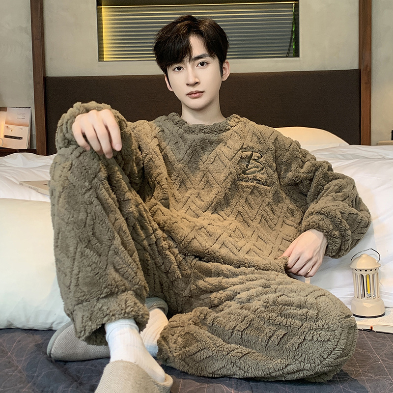 冬季新款男士青年珊瑚绒睡衣感保暖提花加厚家居服可外穿套装