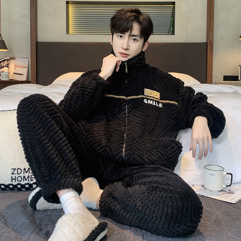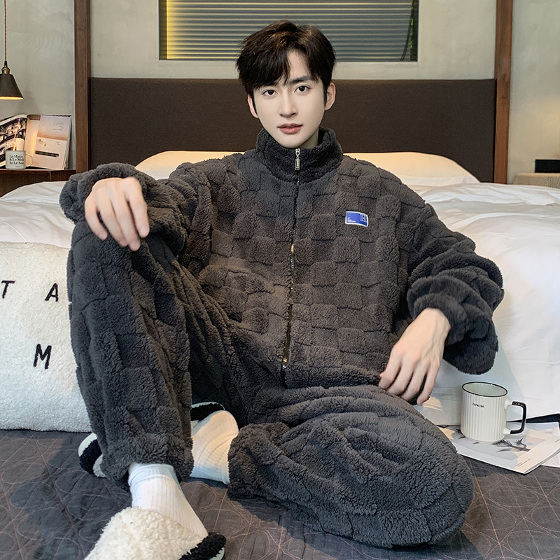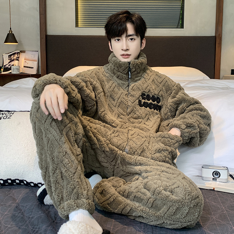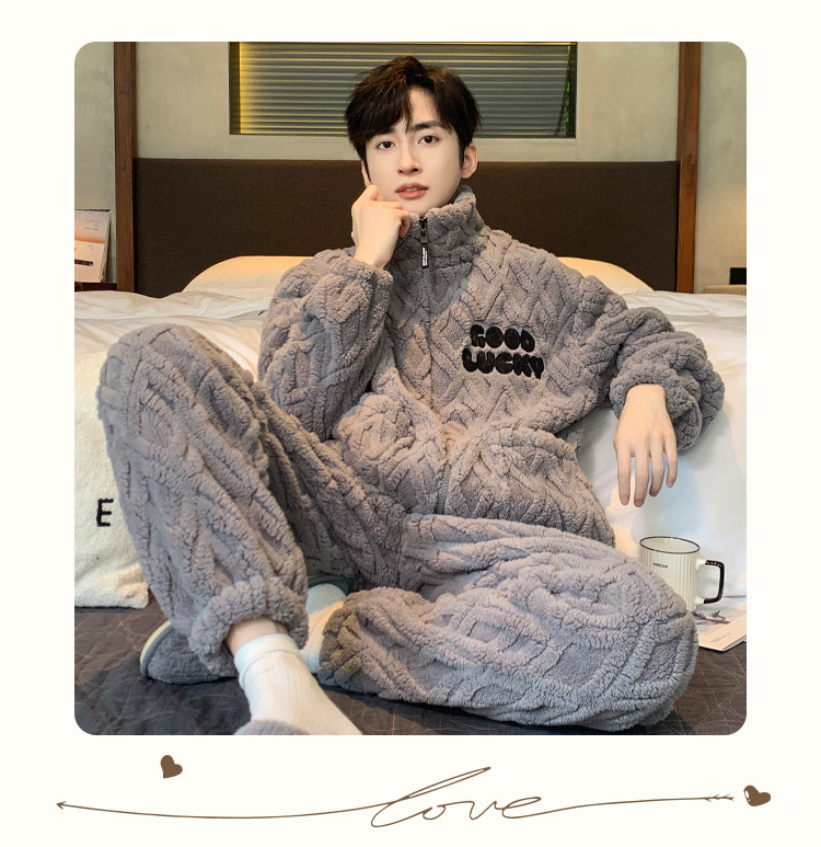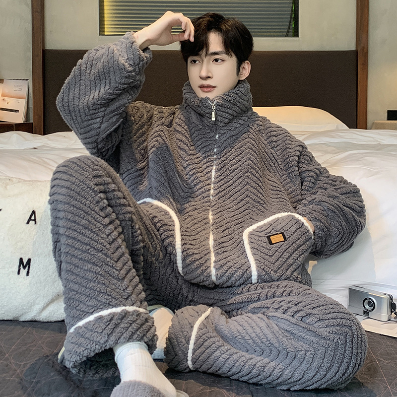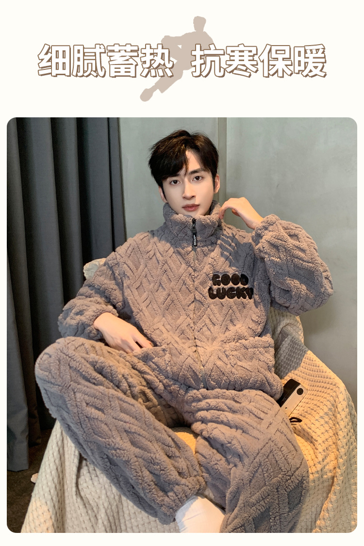2023年冬季新款珊瑚绒青年睡衣男拉链款加厚法兰绒家居服套装