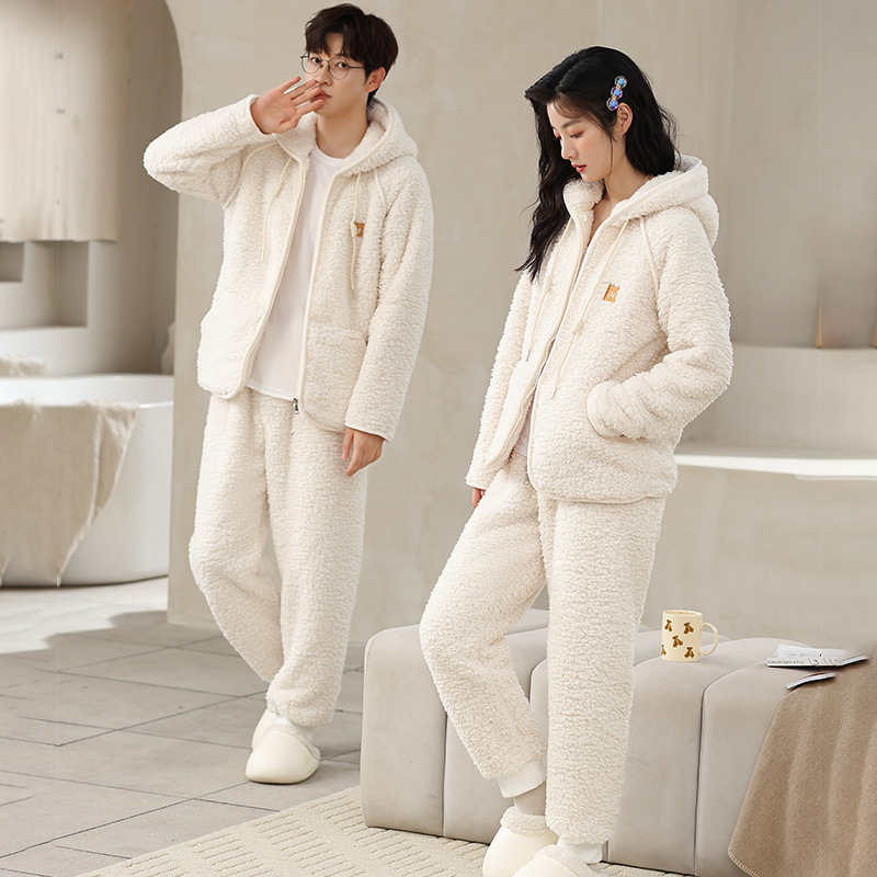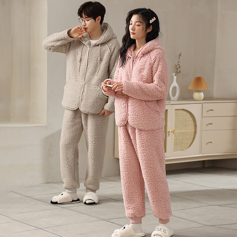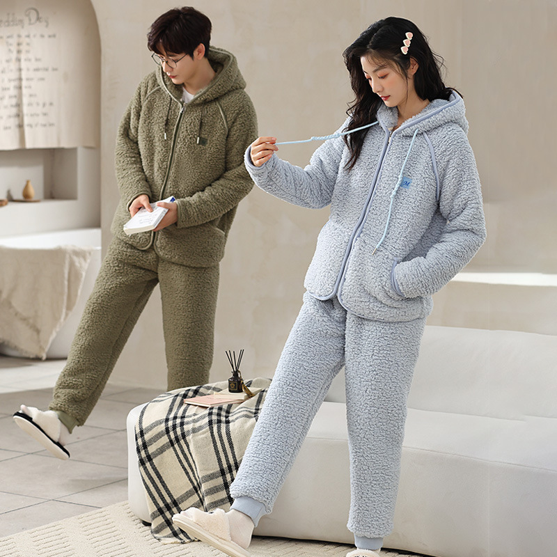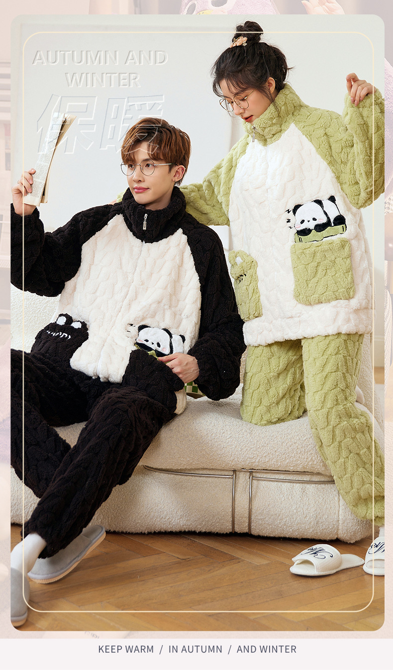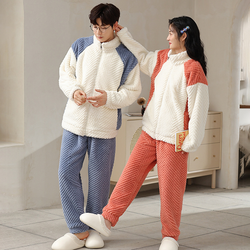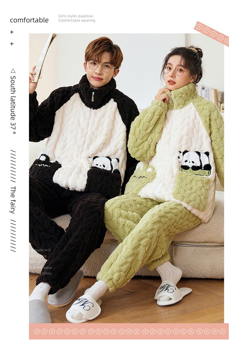 冬季新款情侣珊瑚绒睡衣可爱舒适感法兰绒家居服套装拉链款可外穿