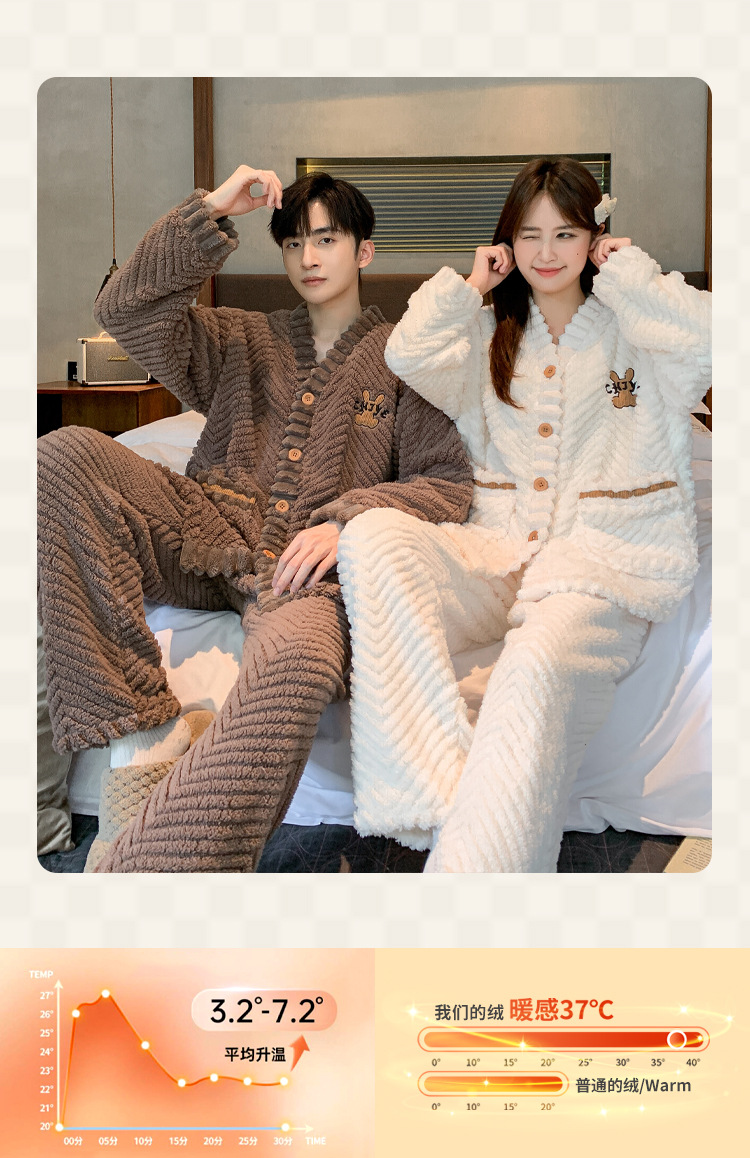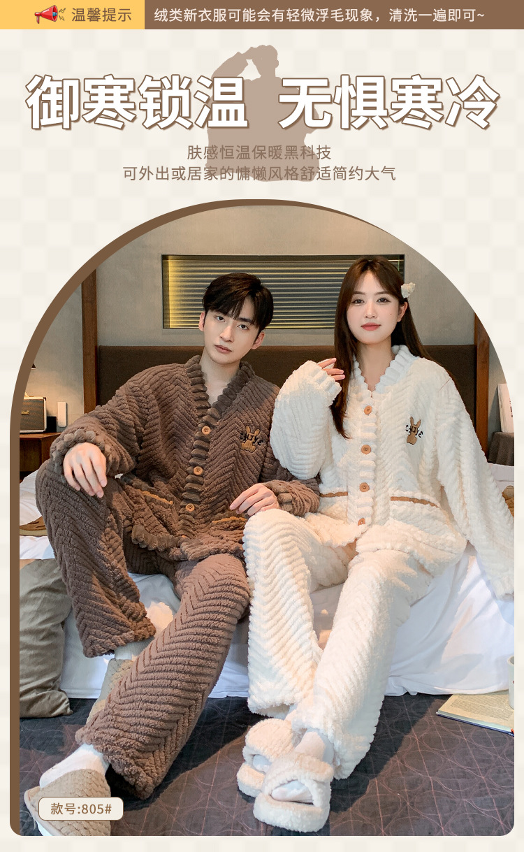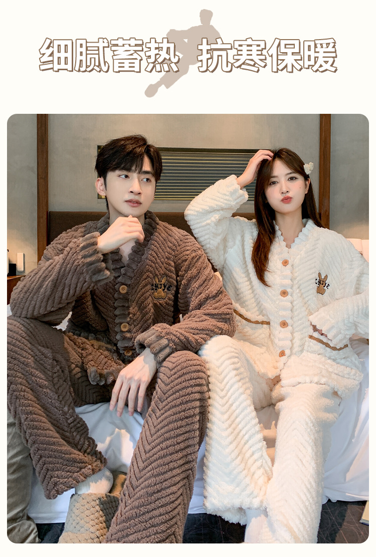 新款冬季珊瑚绒情侣开衫睡衣时尚感加厚法兰绒家居服套装