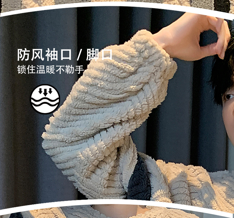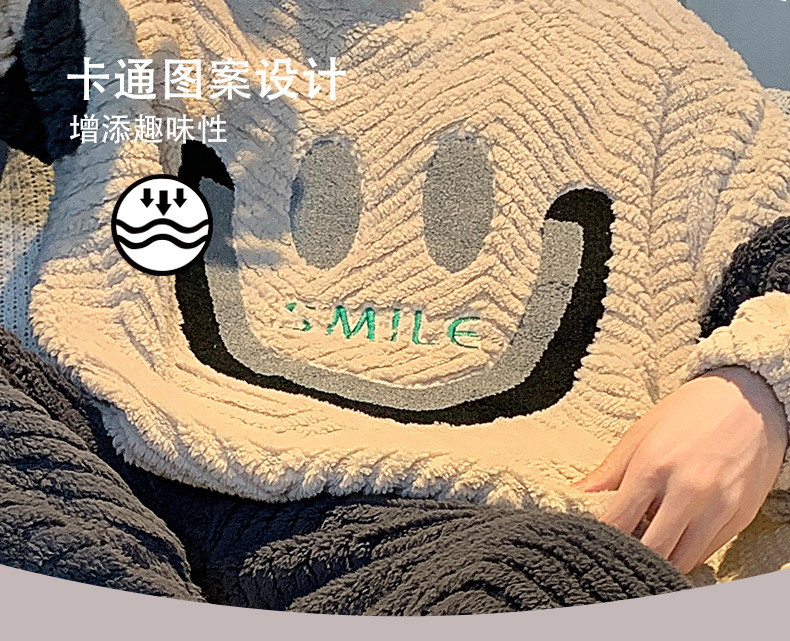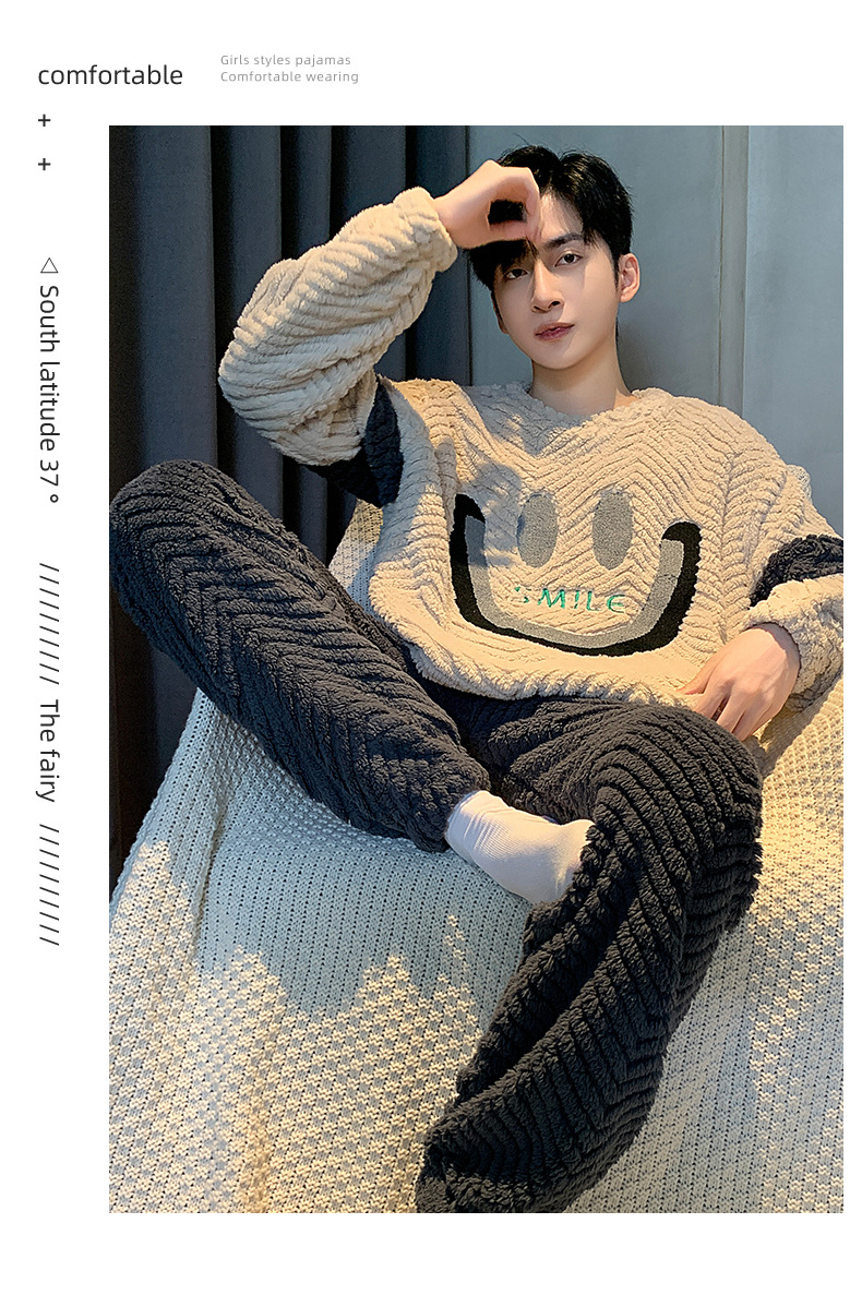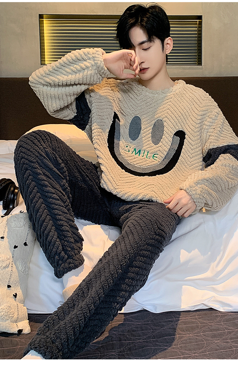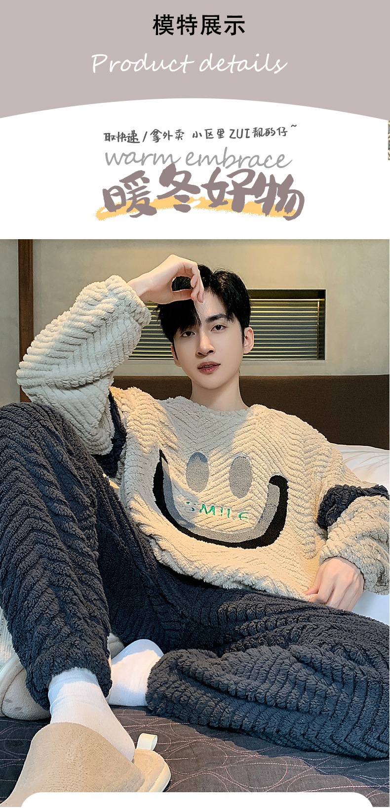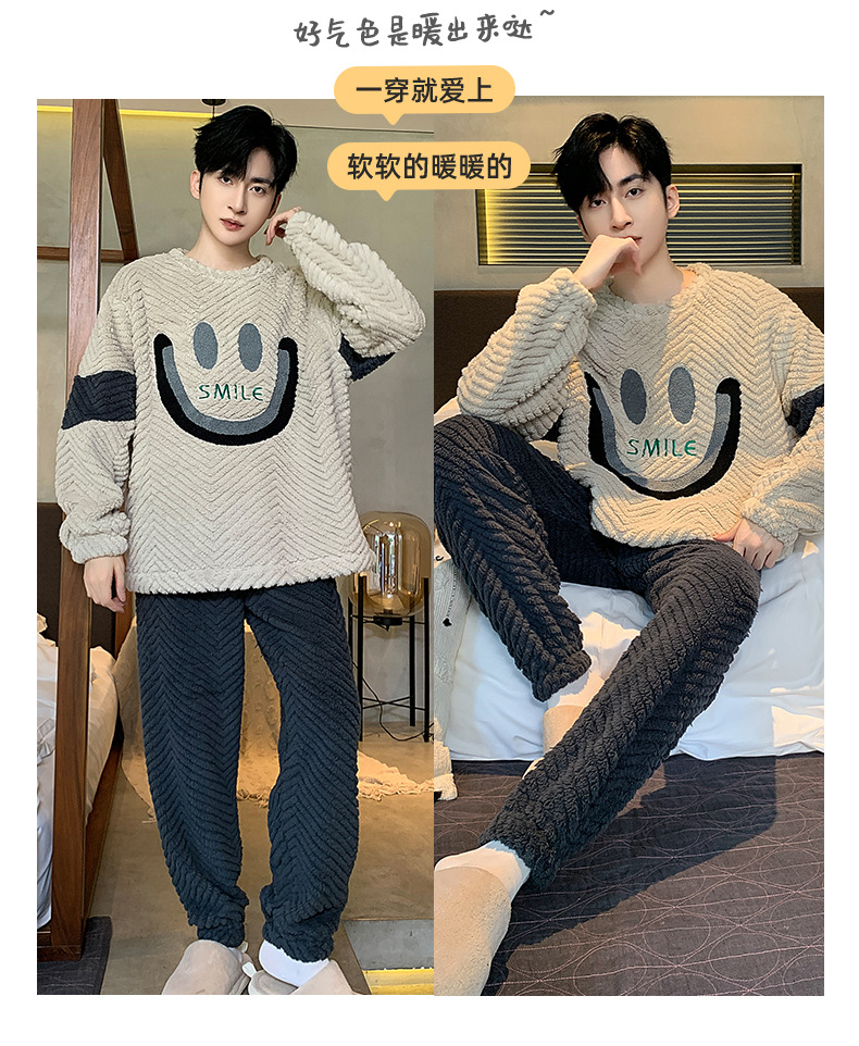 2023年冬季新款男士珊瑚绒睡衣笑脸青年法兰绒舒适加厚家居服套装