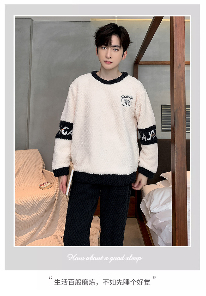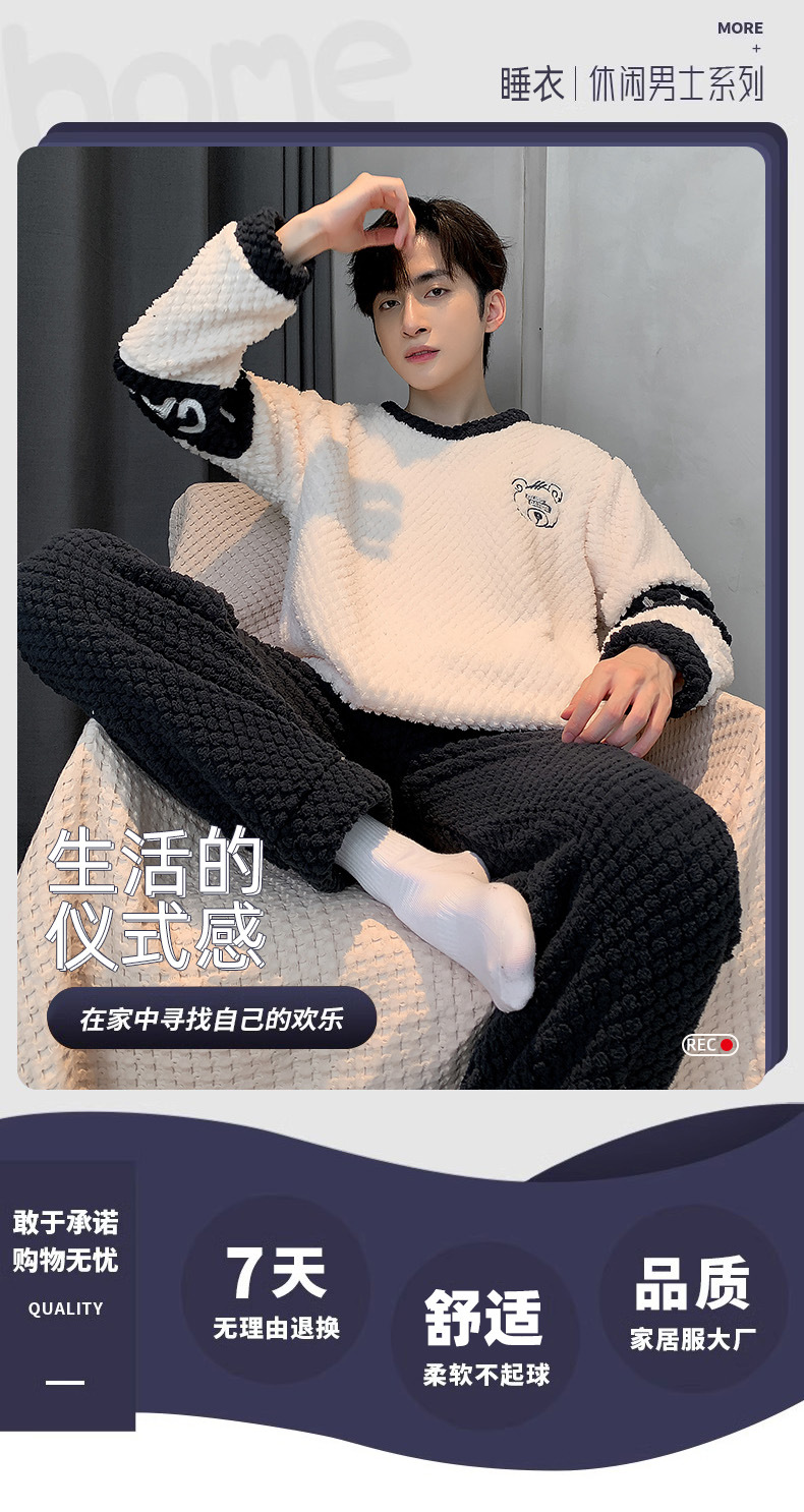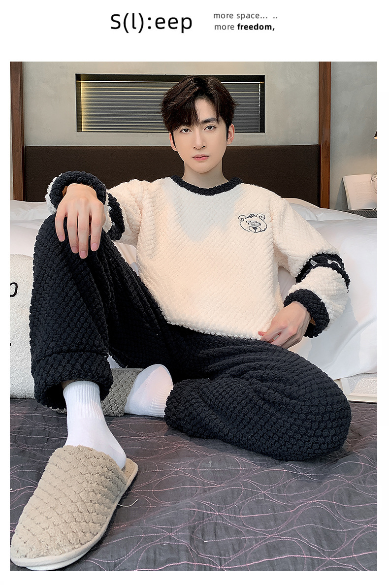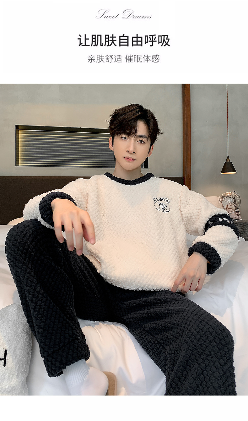 青少年冬季珊瑚绒睡衣男新款卡通时尚加厚法兰绒家居服可外穿套装