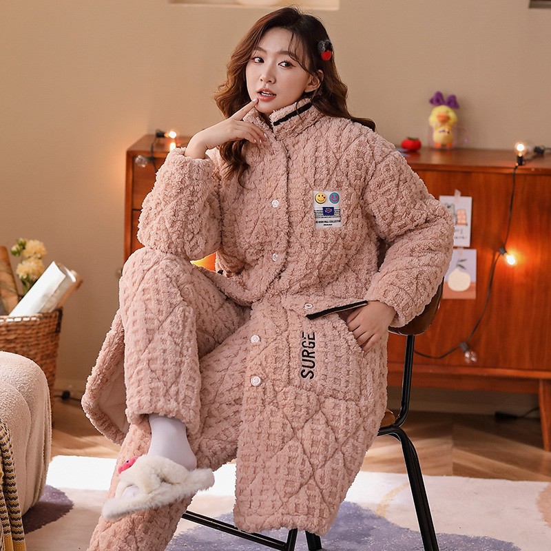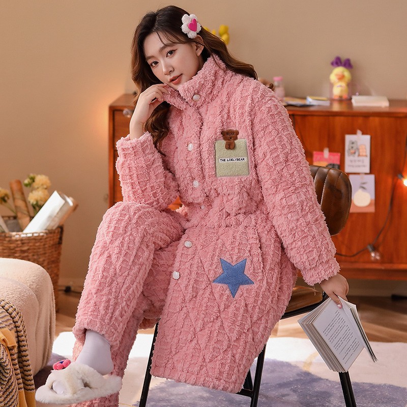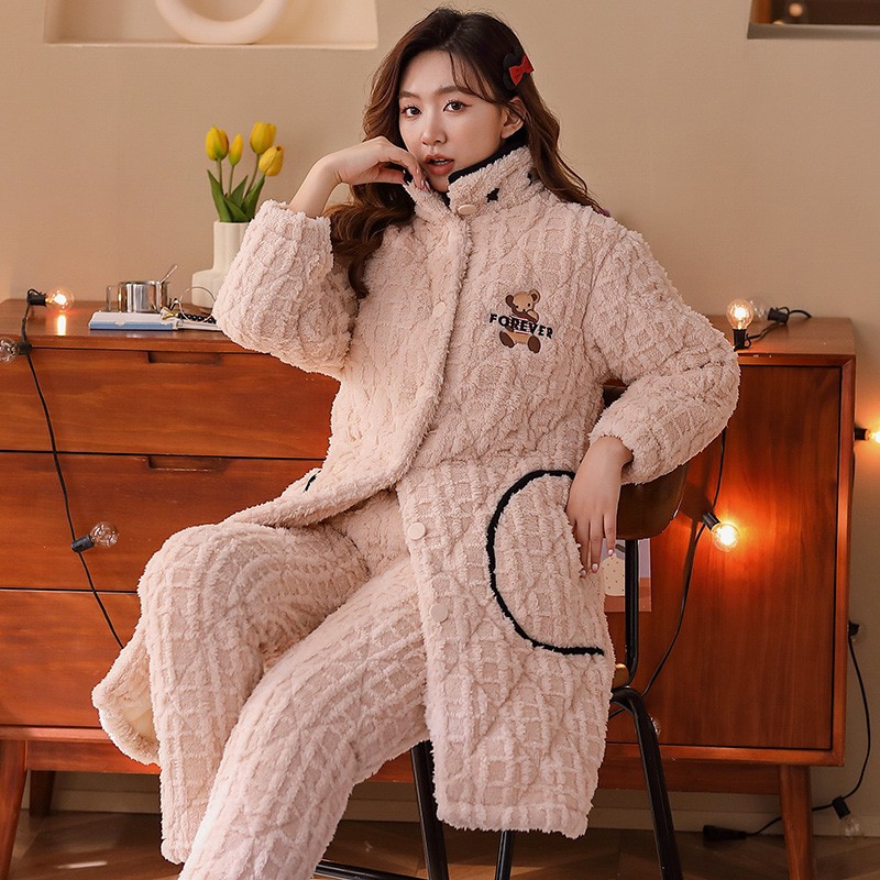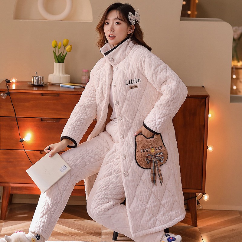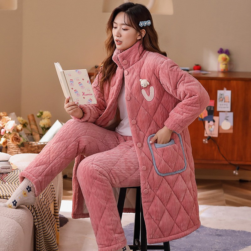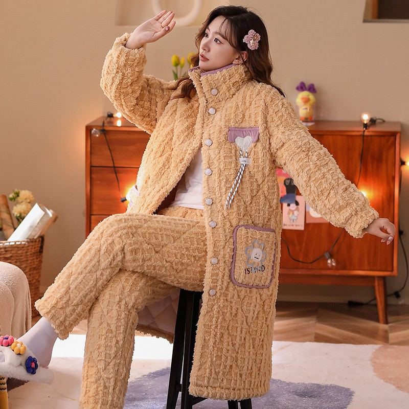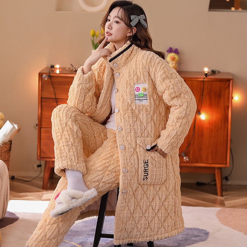 长款睡袍女士秋冬季珊瑚绒加绒加厚三层夹棉袄2022年新款睡衣套装