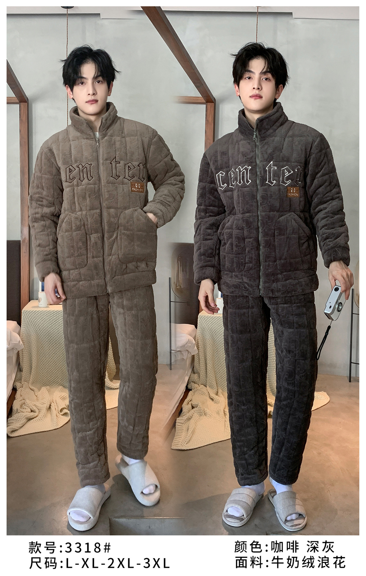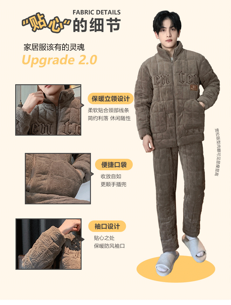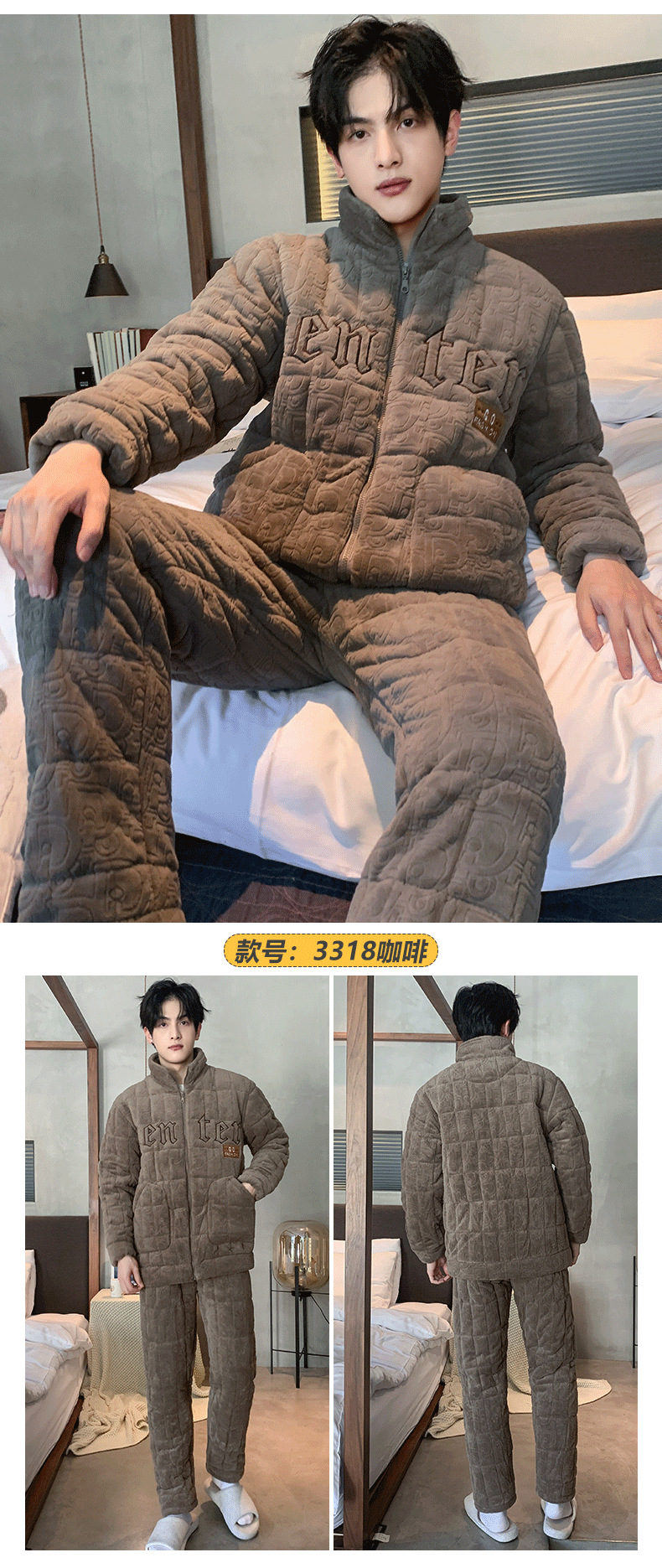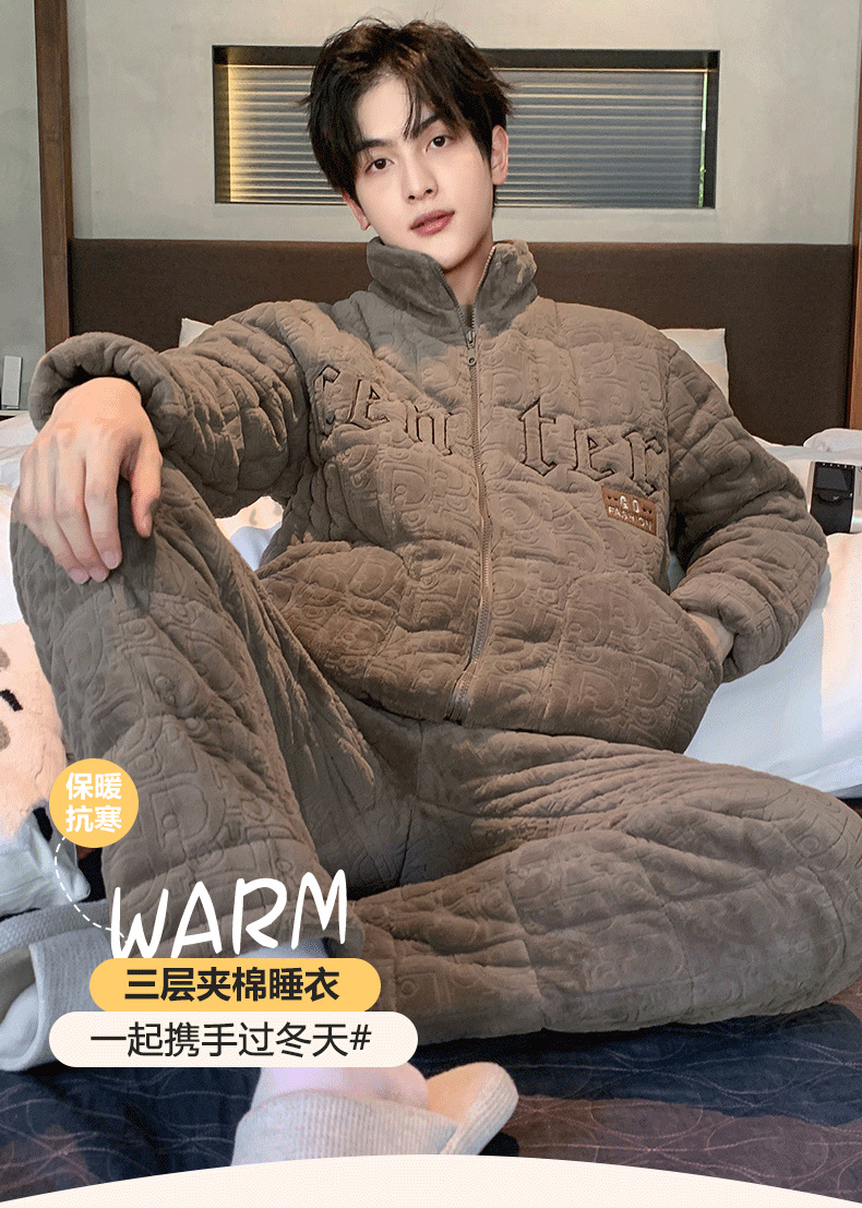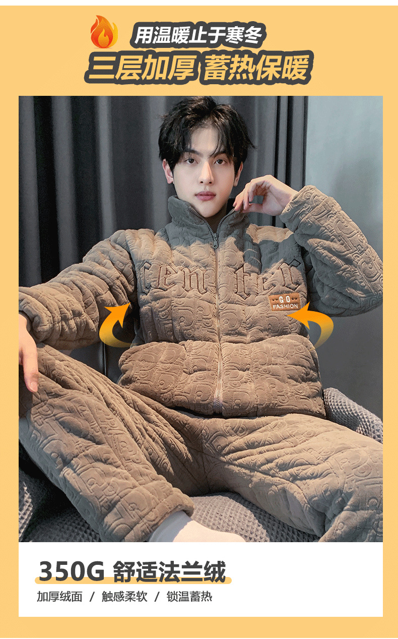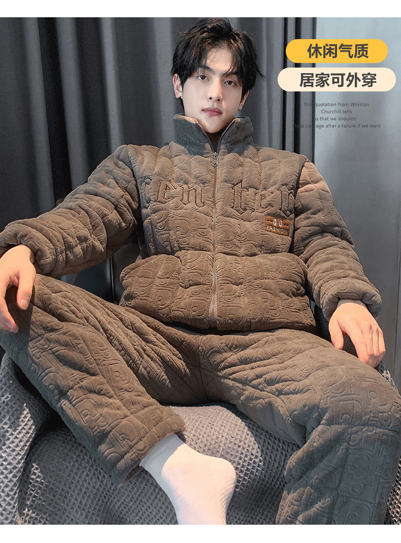 秋冬款男士睡衣珊瑚绒三层夹棉袄男款冬季加厚加绒拉链家居服套装