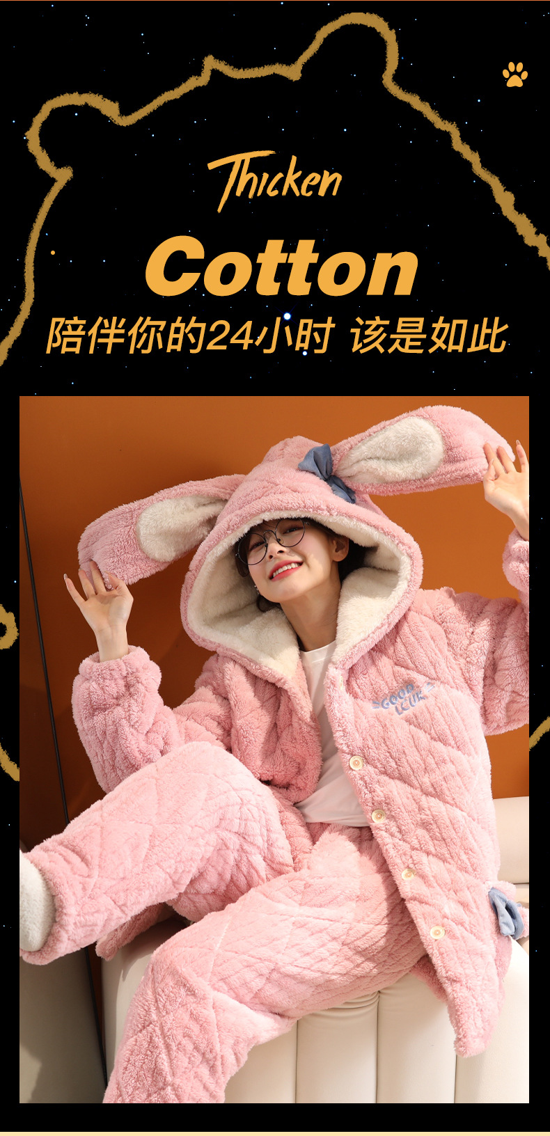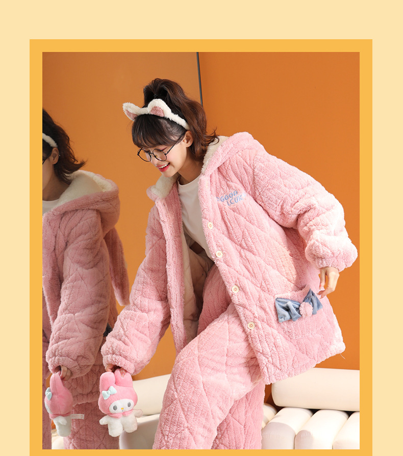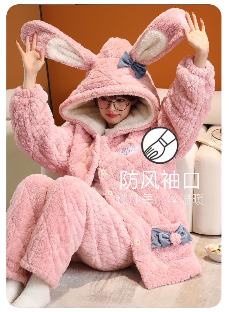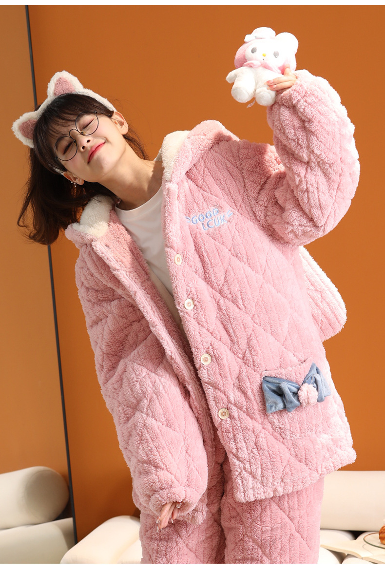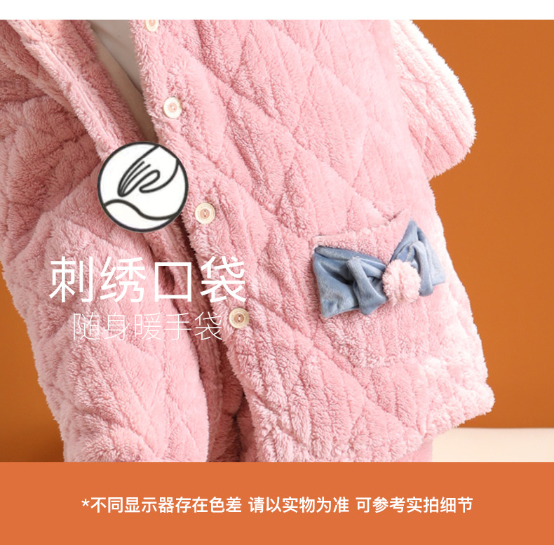 2023年冬季三层夹棉可爱睡衣女珊瑚绒开衫连帽加厚加绒套装家居服