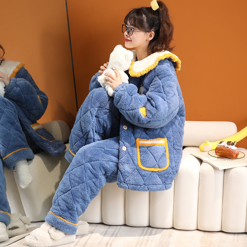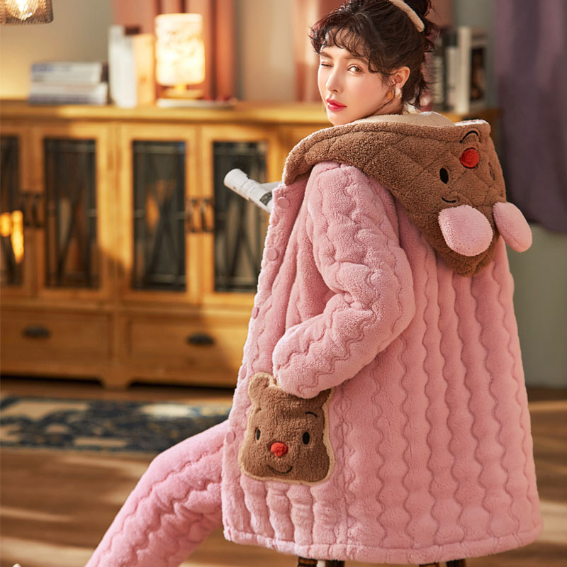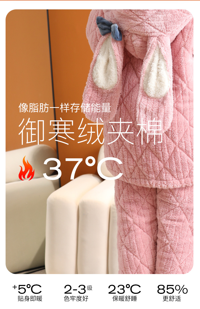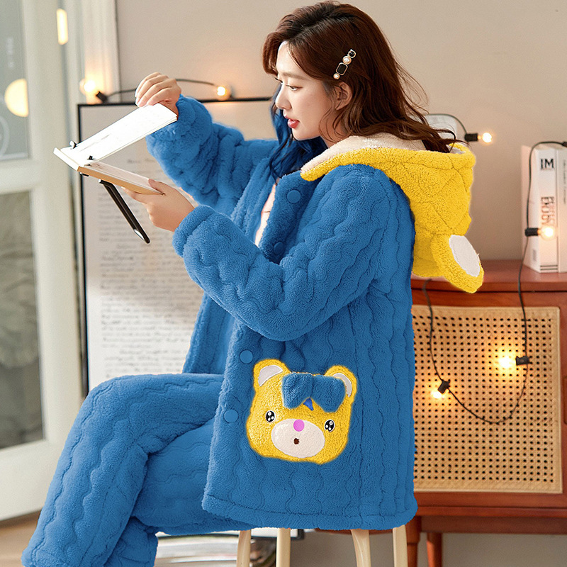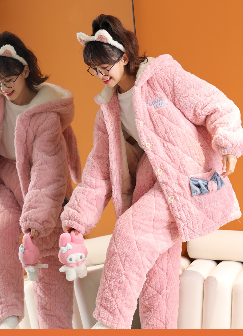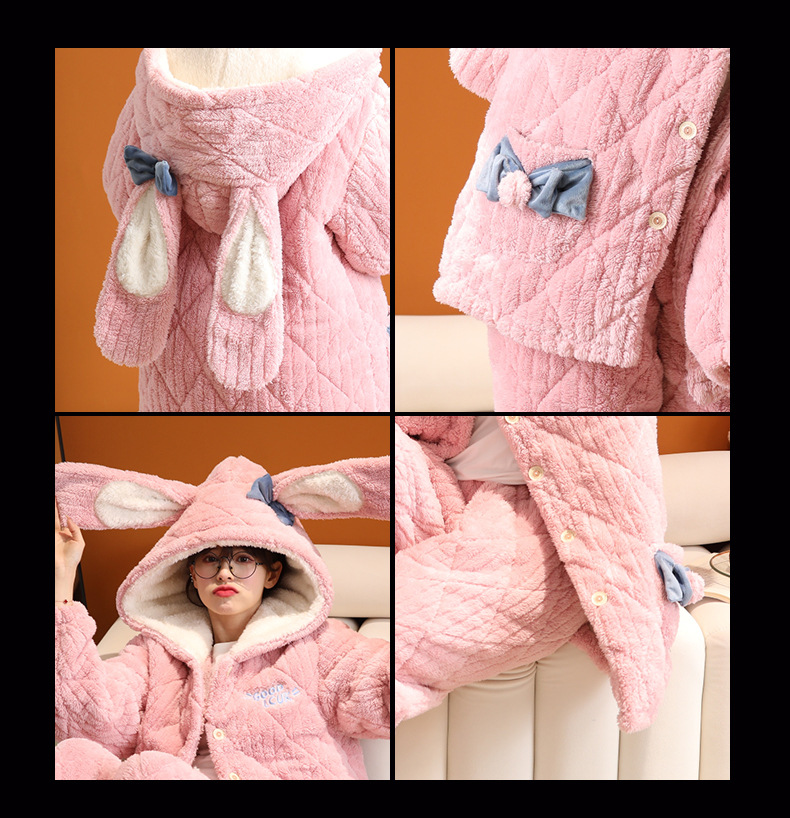 2023年冬季三层夹棉可爱睡衣女珊瑚绒开衫连帽加厚加绒套装家居服
