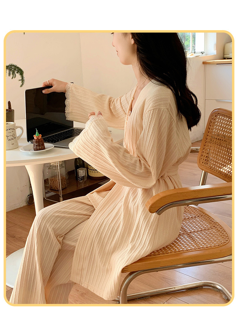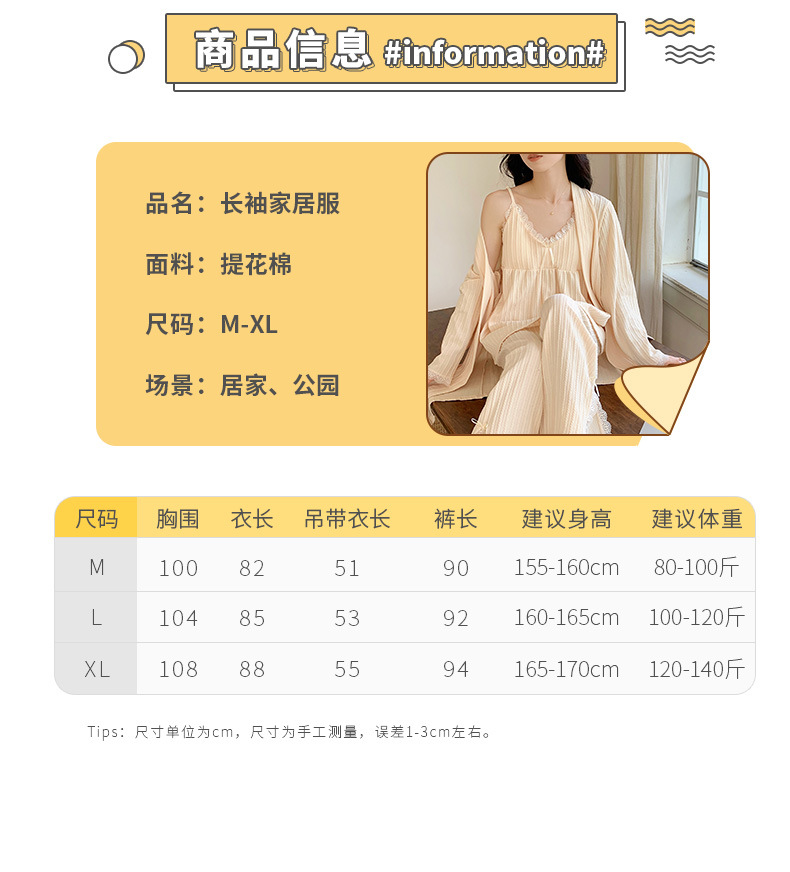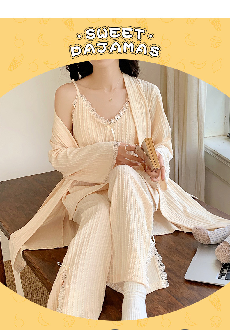 秋季新款棉质睡衣女吊带长裤睡袍三件套可爱清新纯色家居服带胸垫