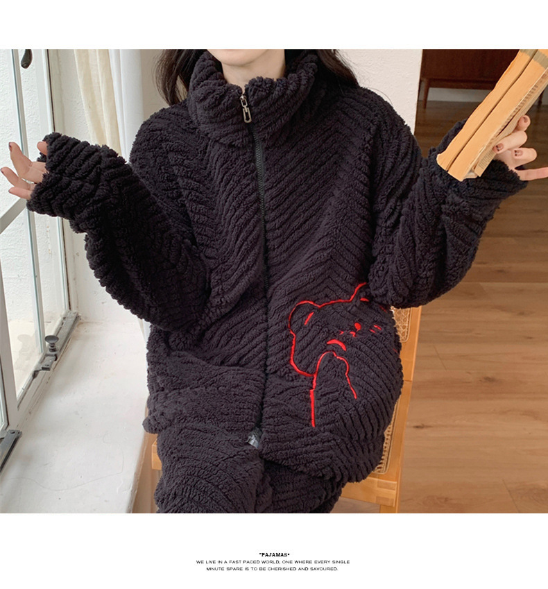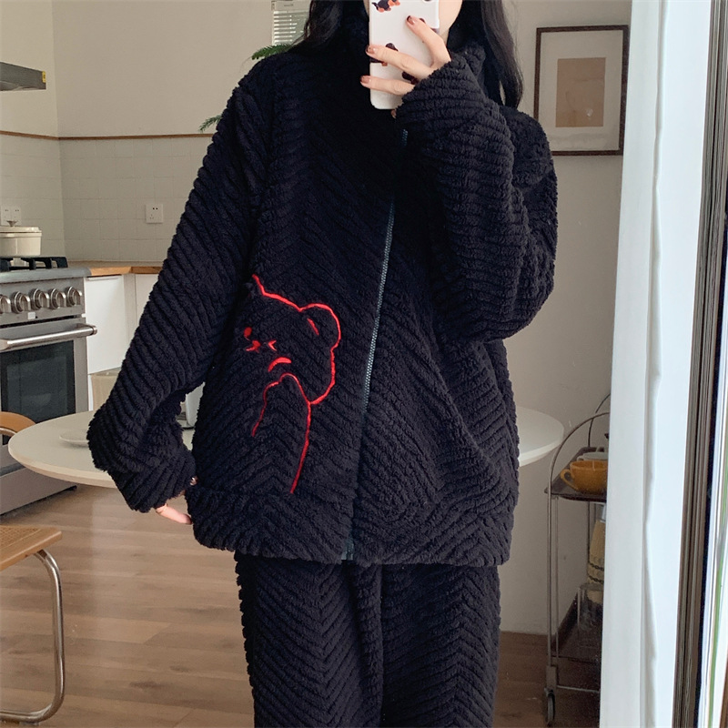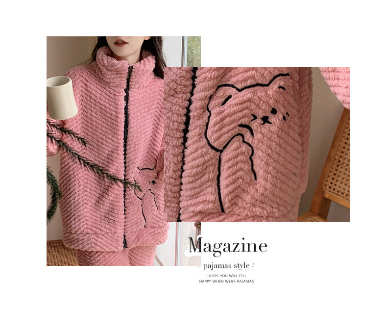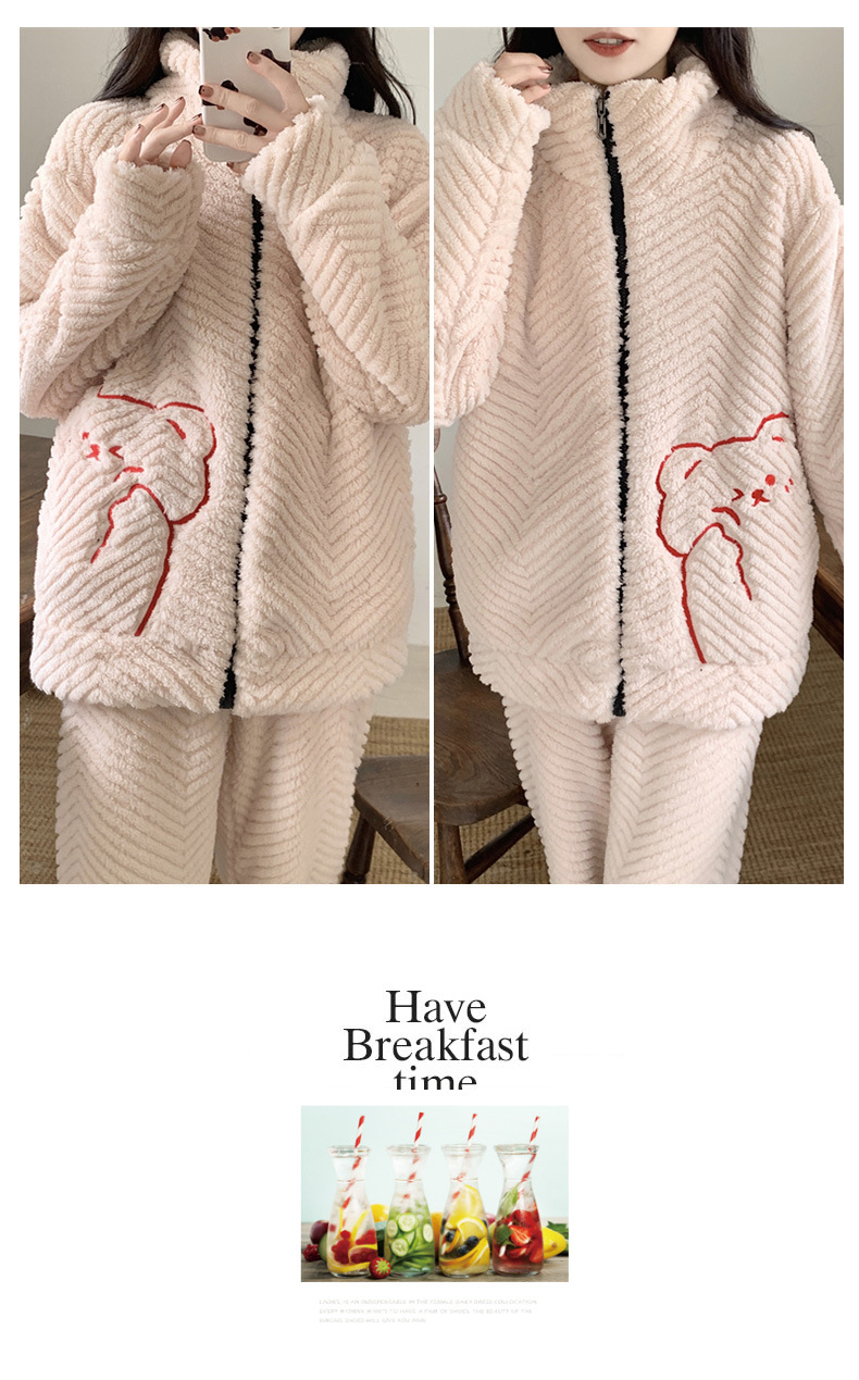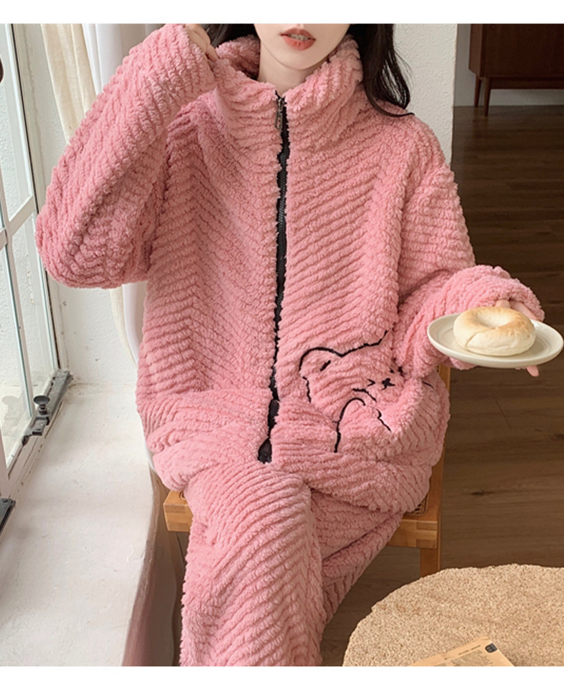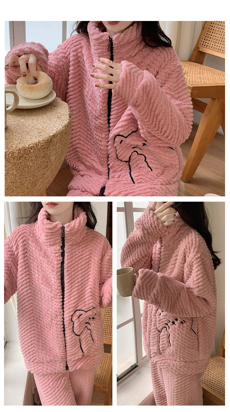 冬季珊瑚绒睡衣女2023年新款可爱小熊开衫拉链法兰绒家居服两件套