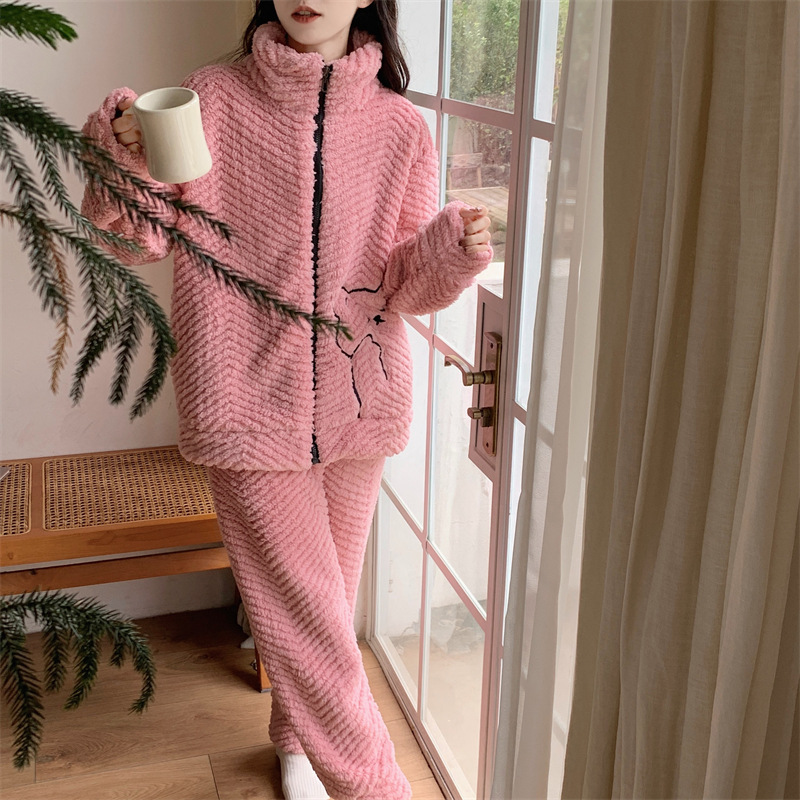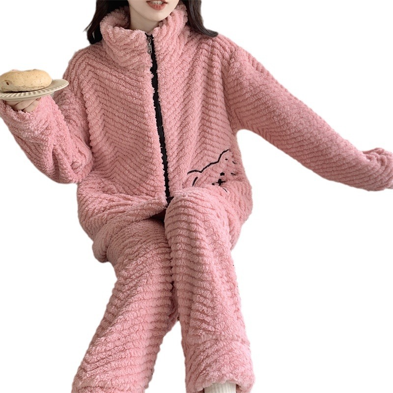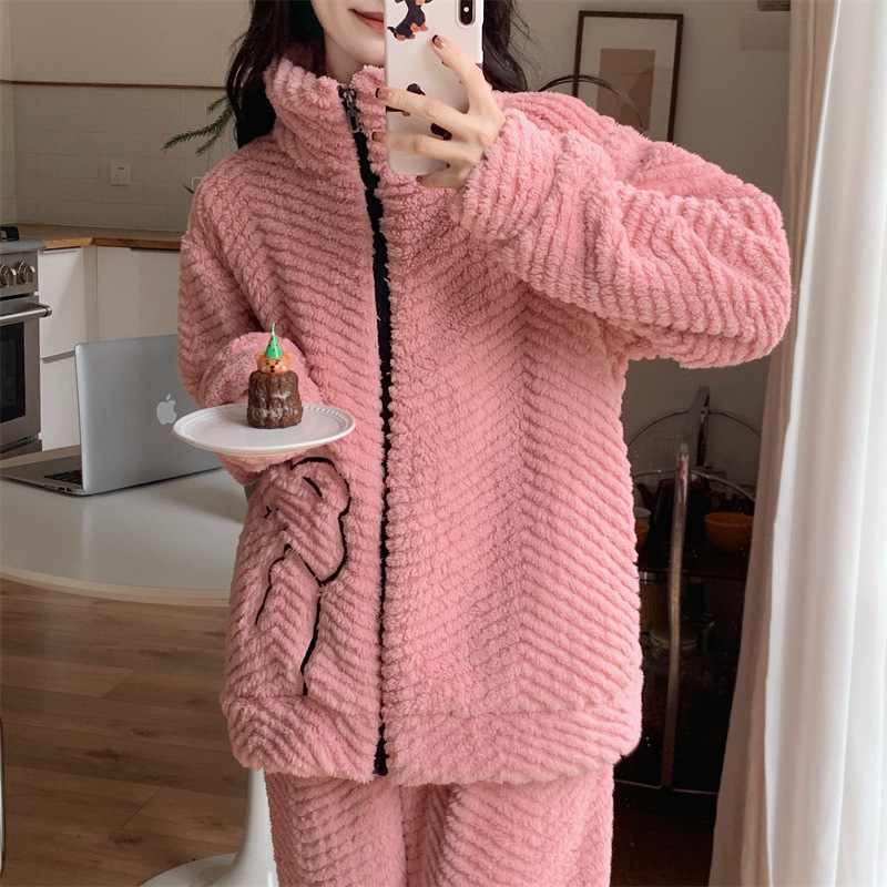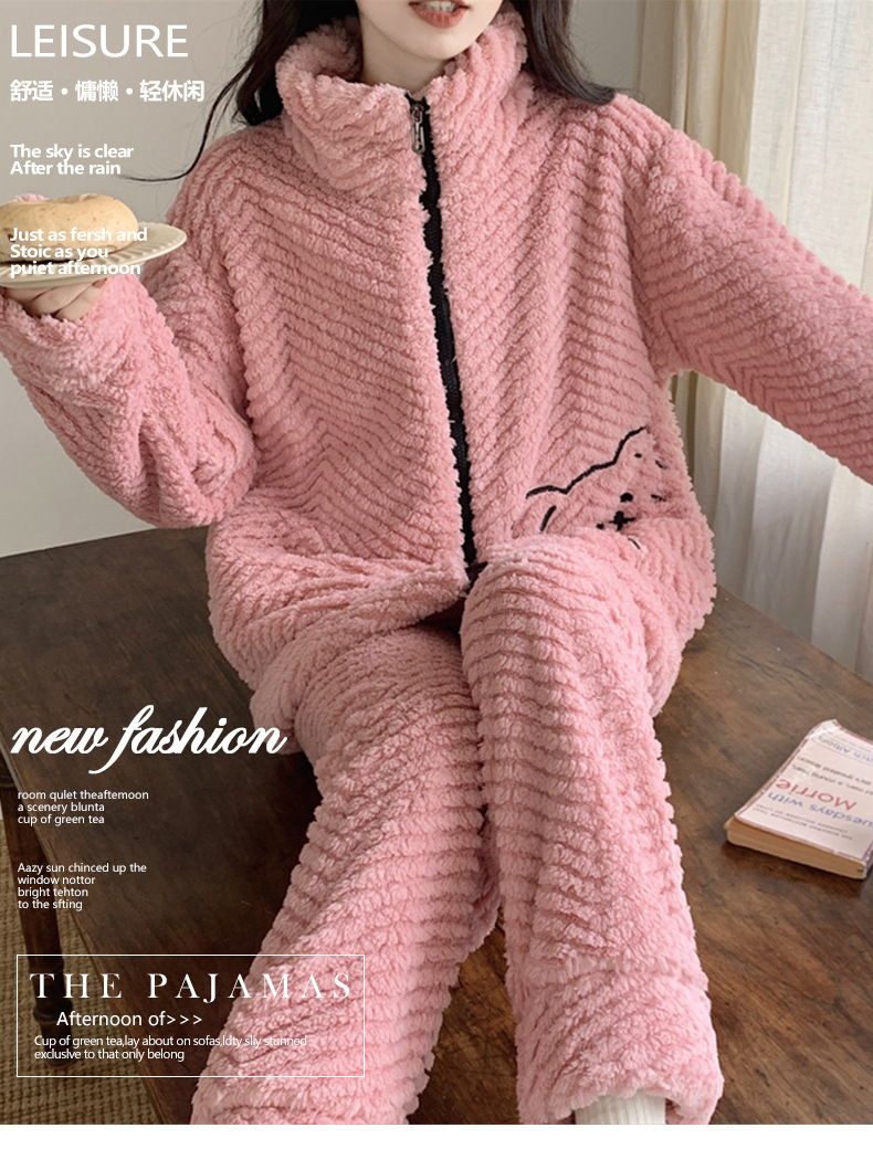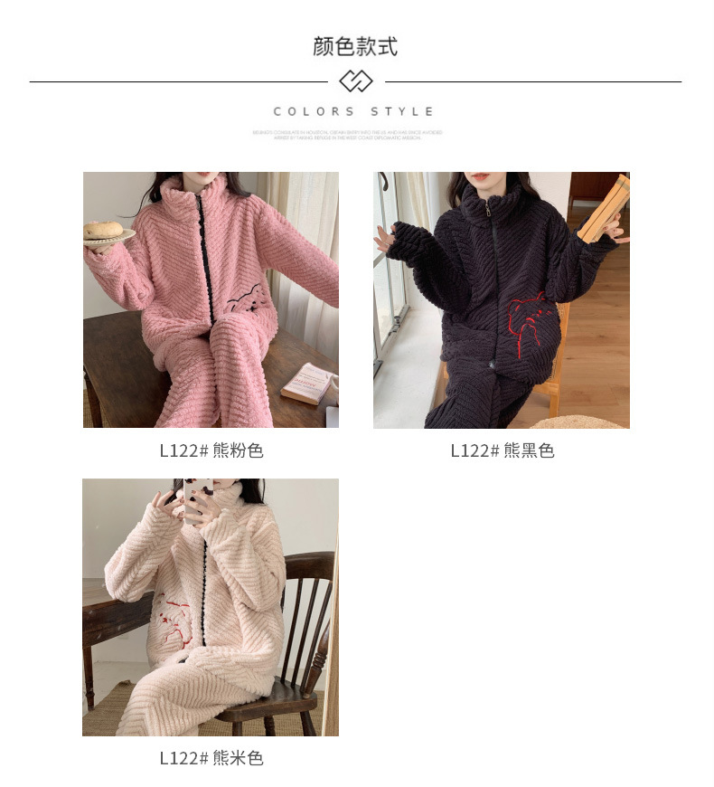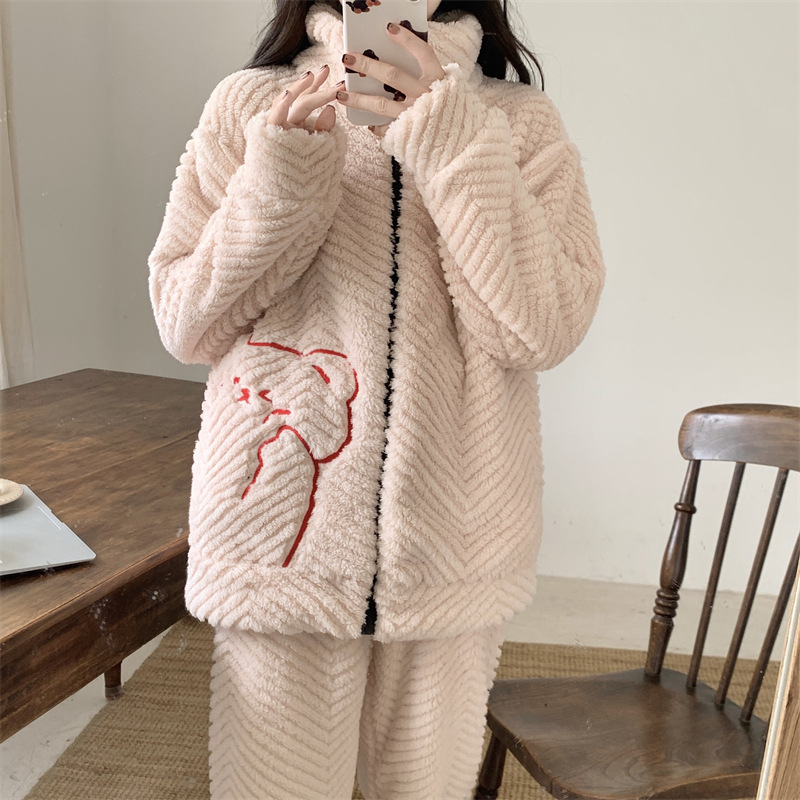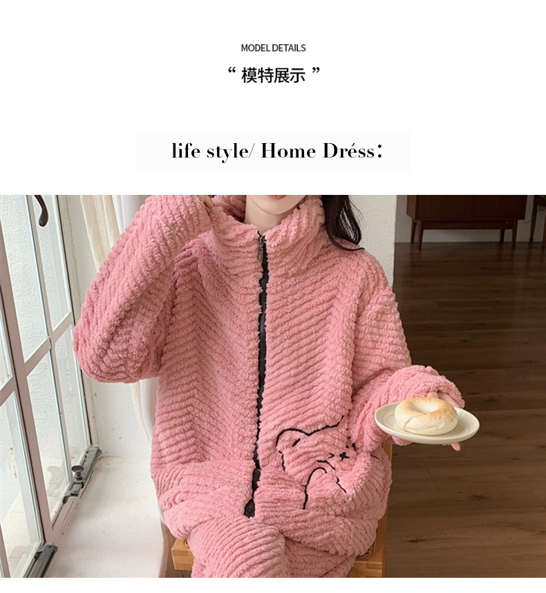冬季珊瑚绒睡衣女2023年新款可爱小熊开衫拉链法兰绒家居服两件套