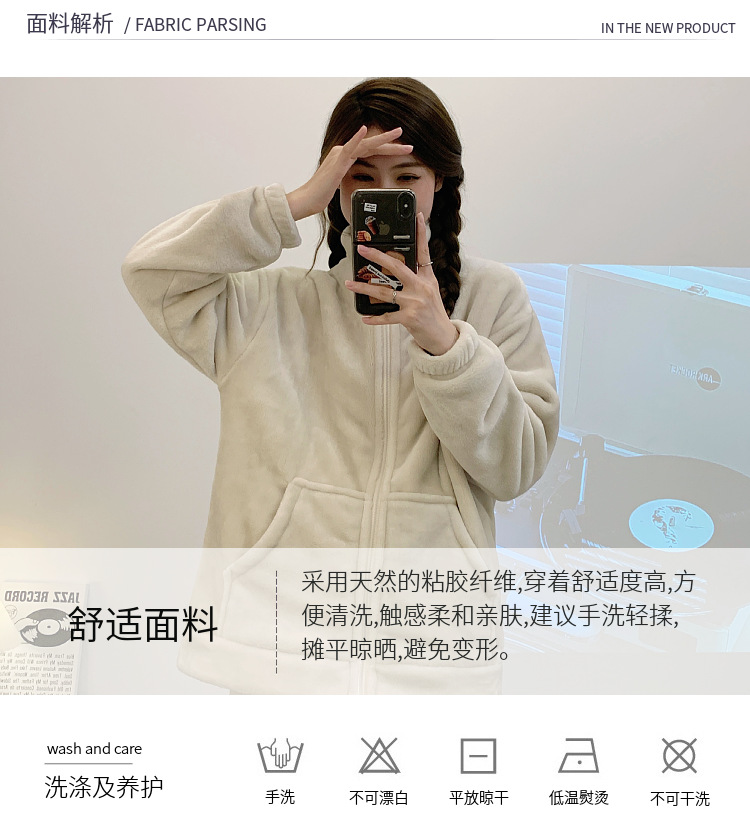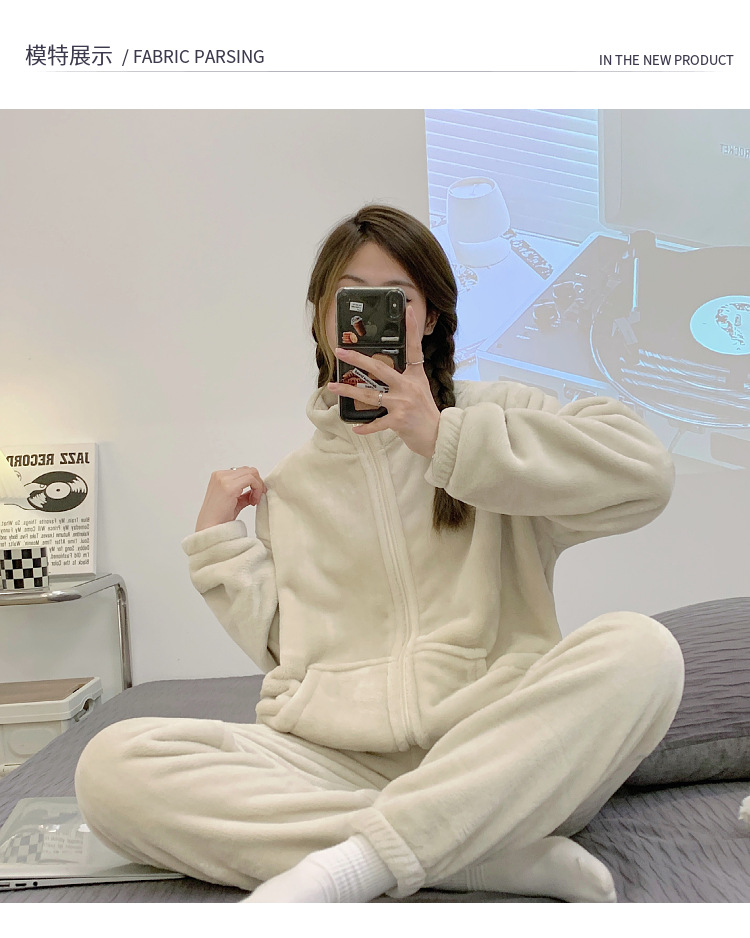 秋冬新款2023年法兰绒睡衣女纯色休闲简约保暖拉链开衫家居服套装