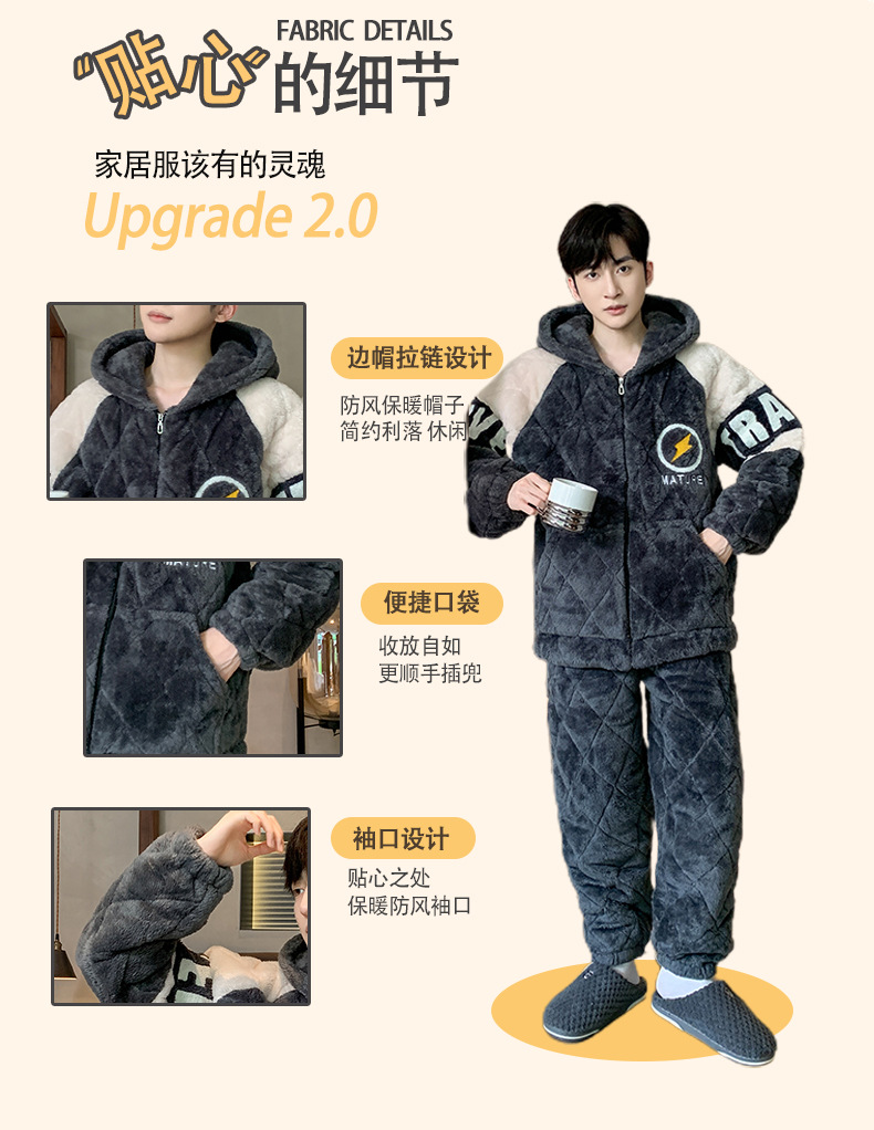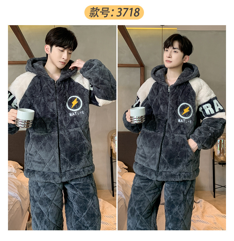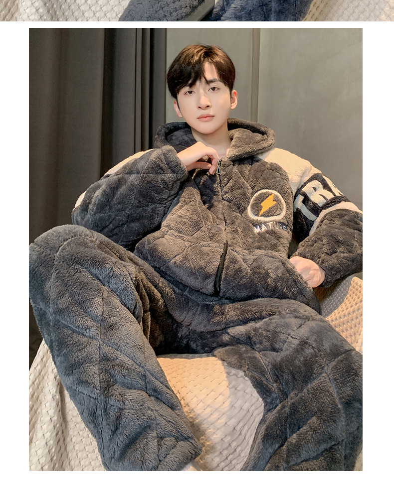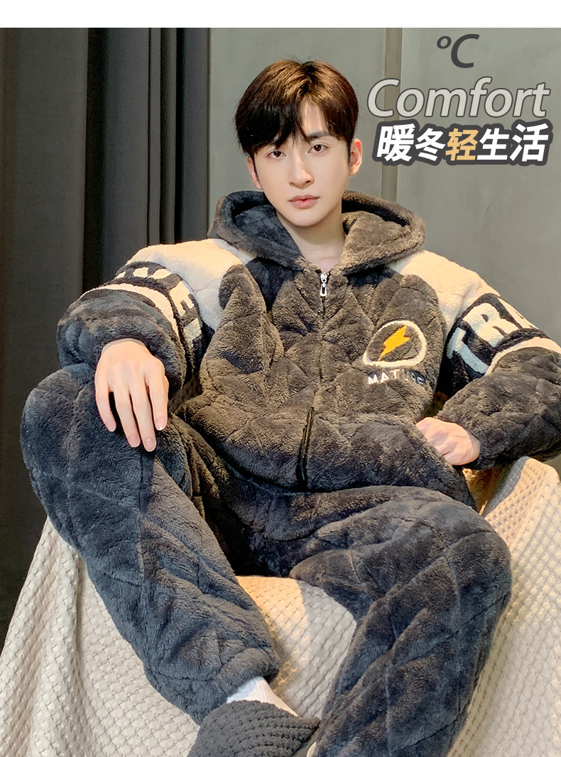 三层夹棉睡衣男秋冬季加厚加绒男士珊瑚绒保暖款法兰绒冬天家居服