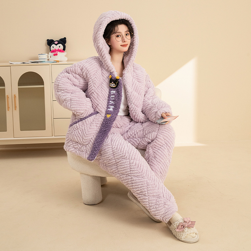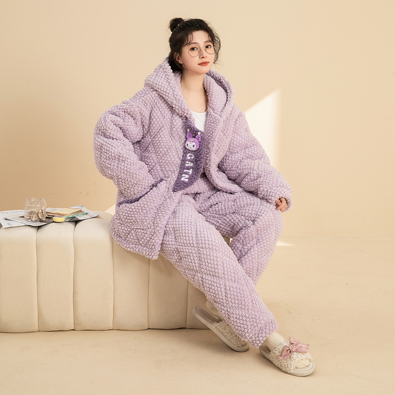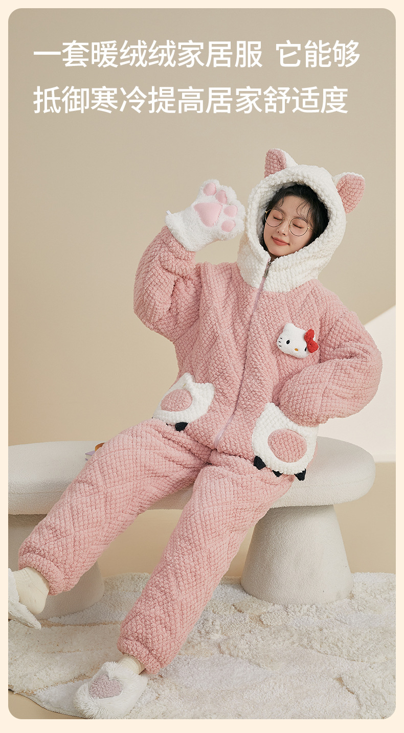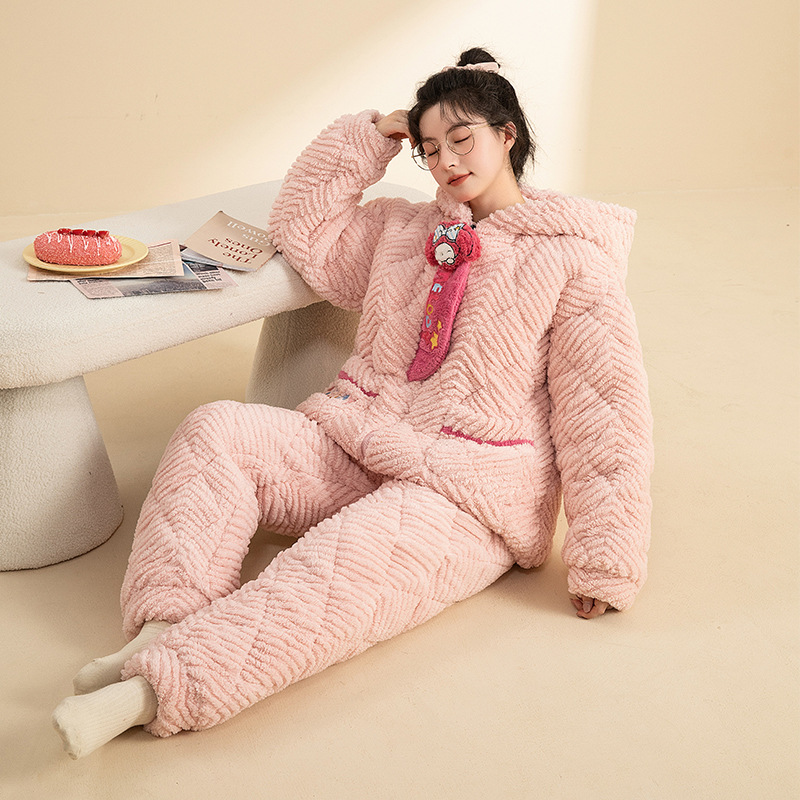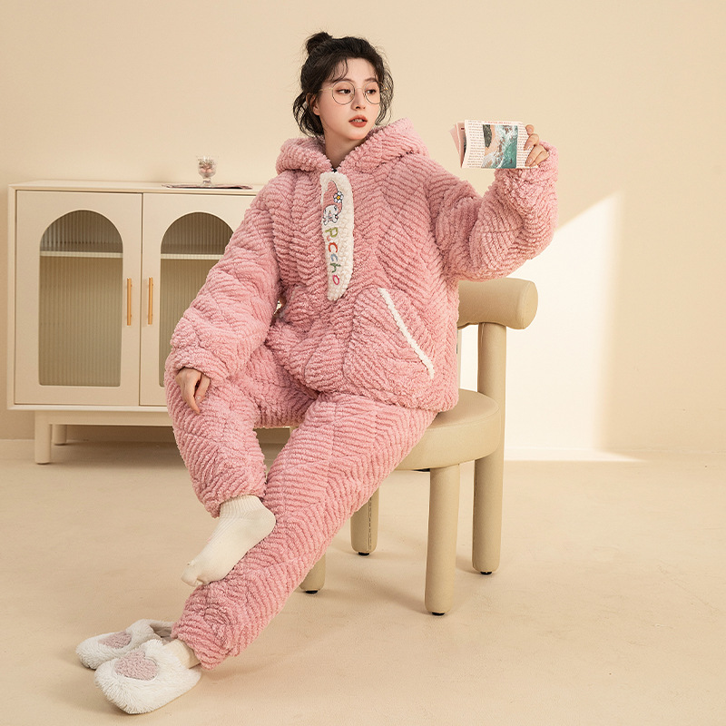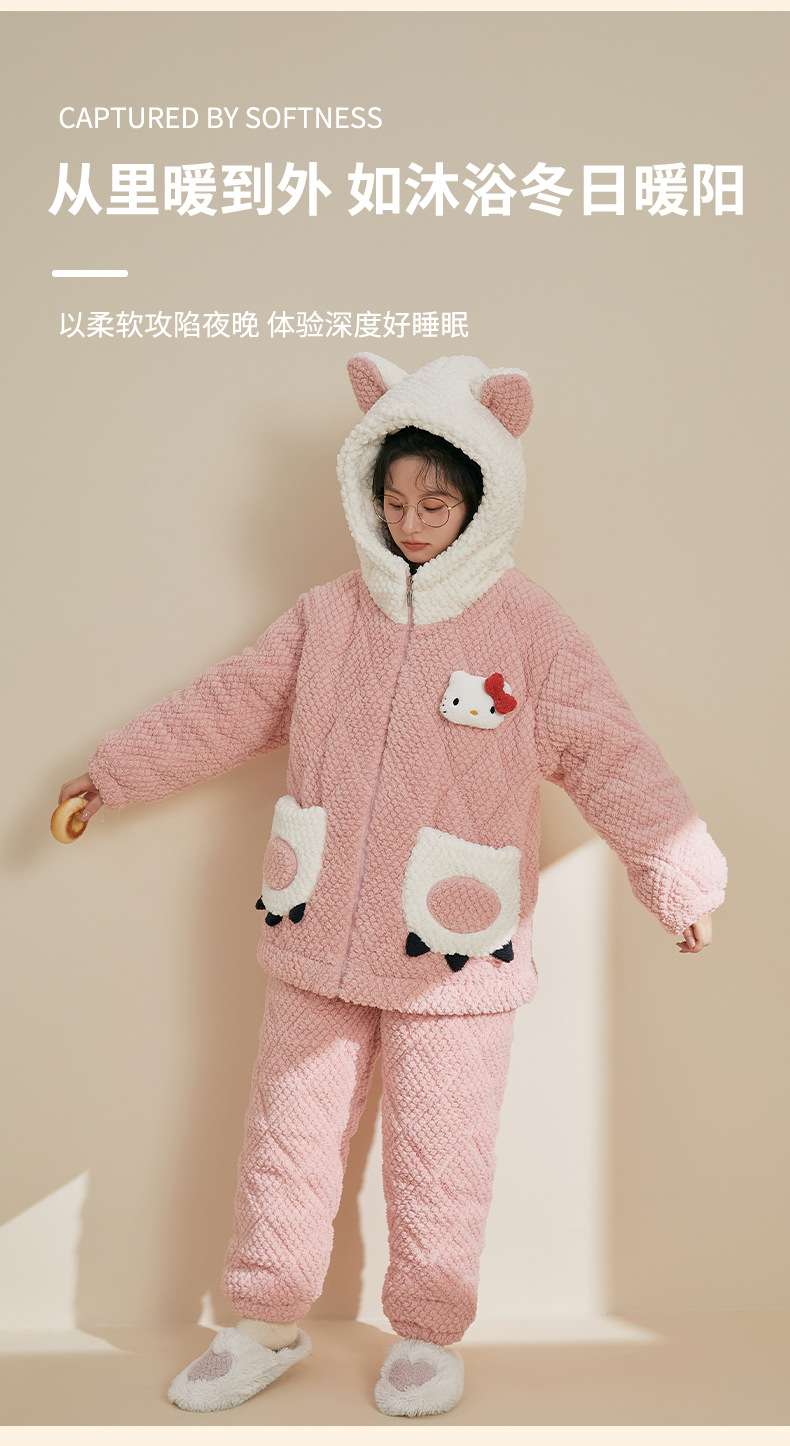 冬季珊瑚绒三层夹棉睡衣女加厚2023年新款卡通连帽少女家居服套装