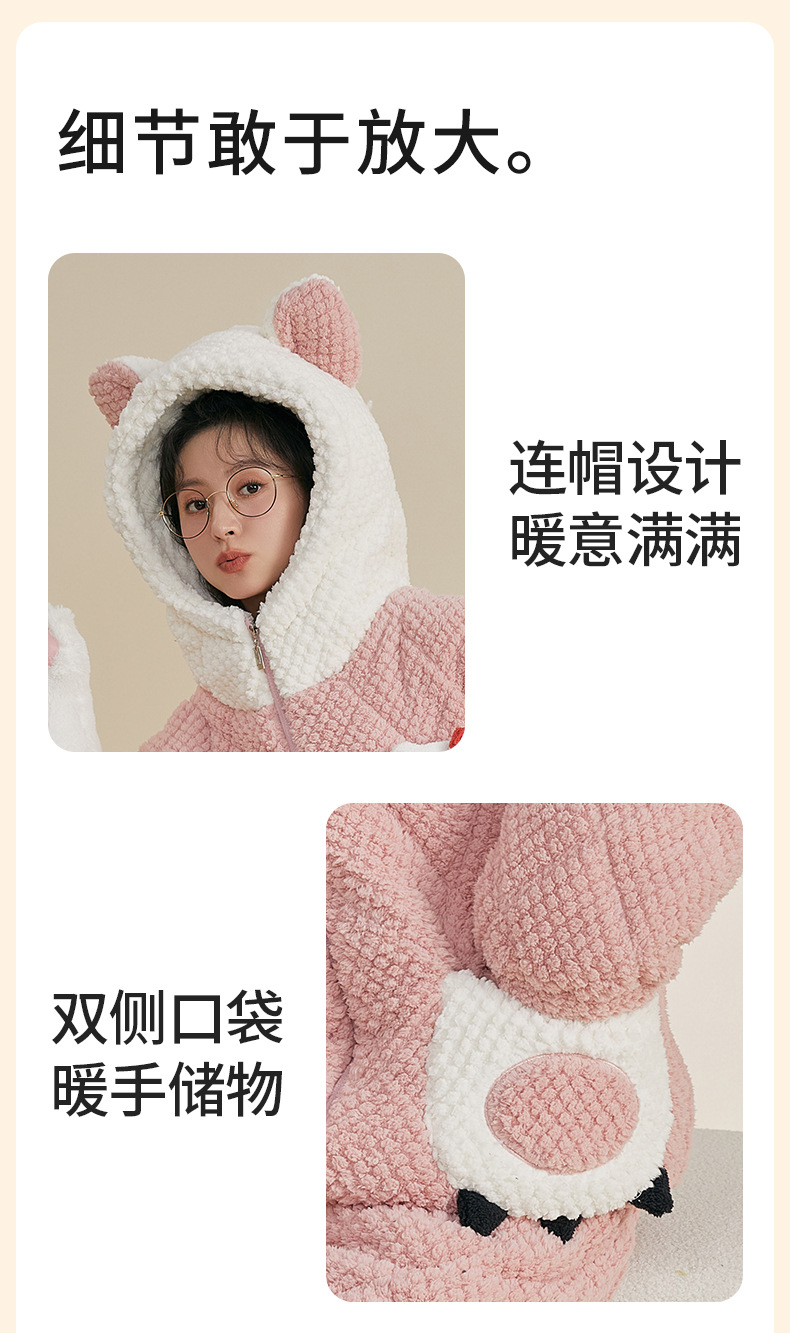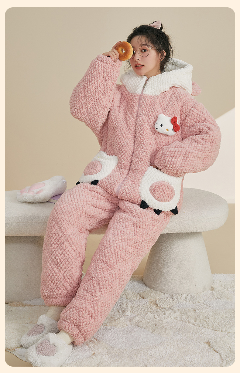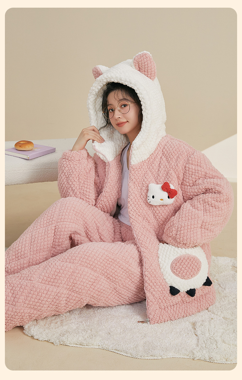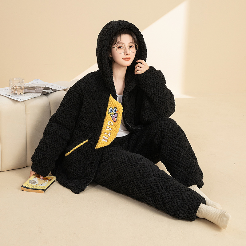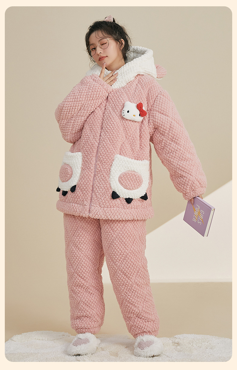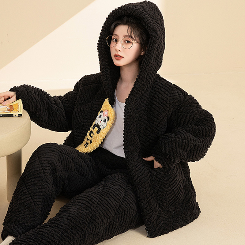 冬季珊瑚绒三层夹棉睡衣女加厚2023年新款卡通连帽少女家居服套装