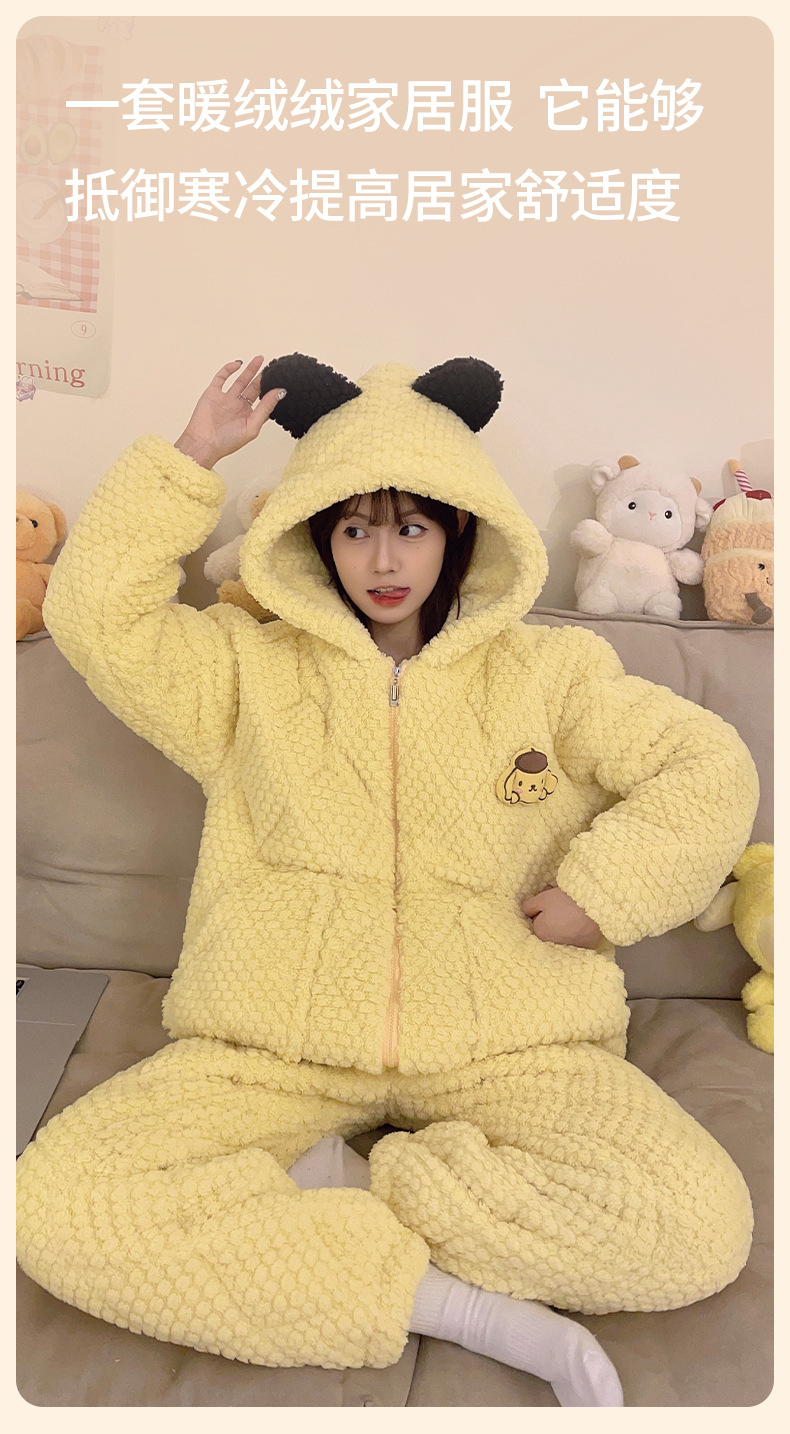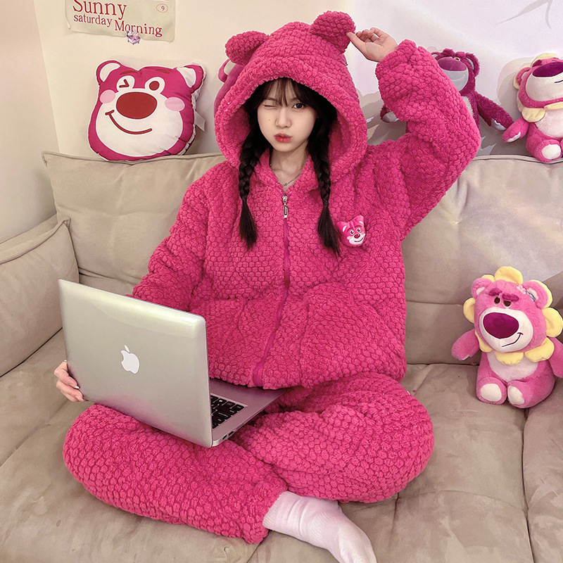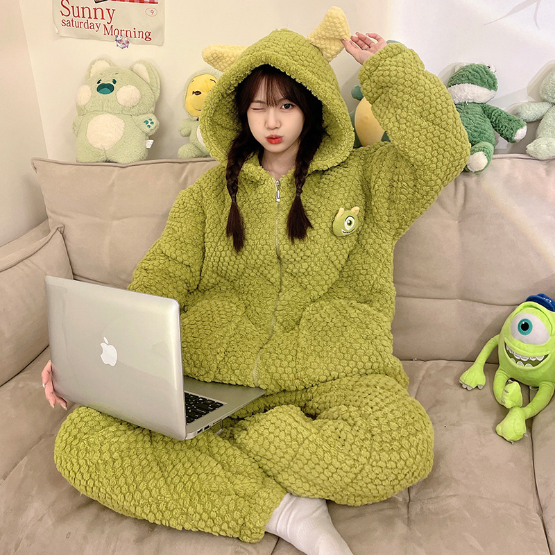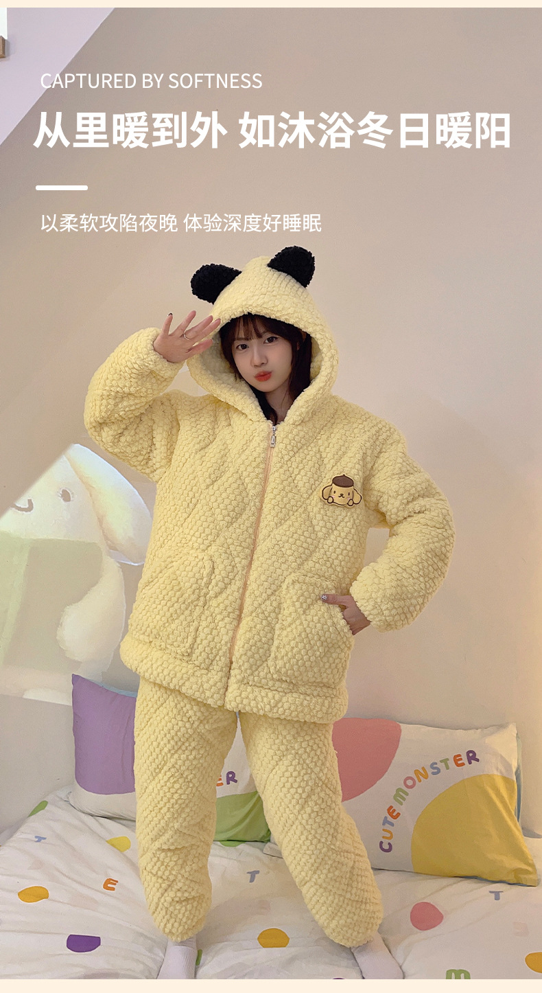 睡衣女士珊瑚绒三层夹棉2023年新款连帽卡通冬天棉袄家居服两件套