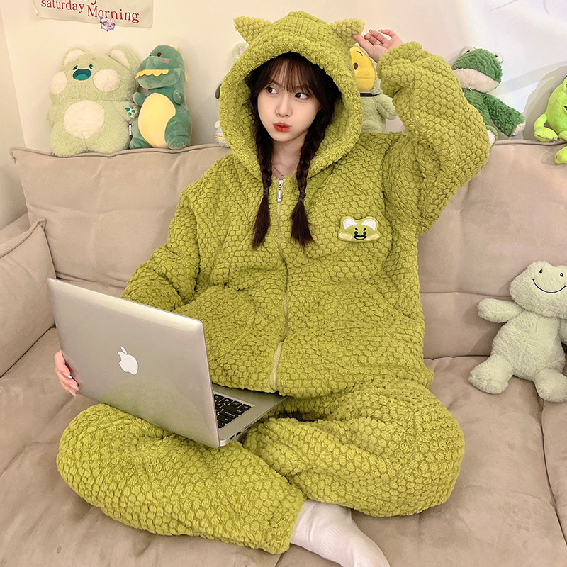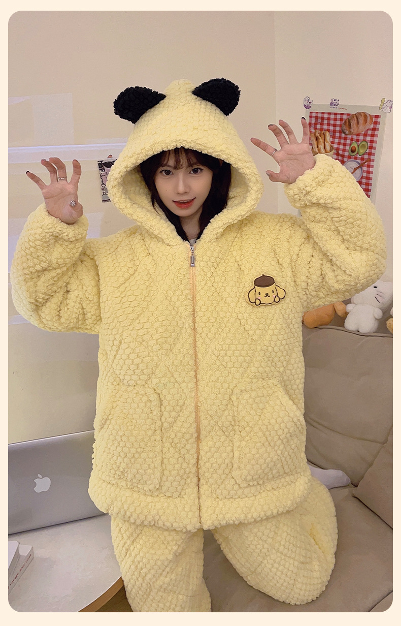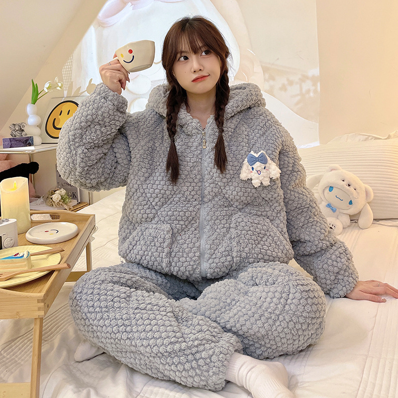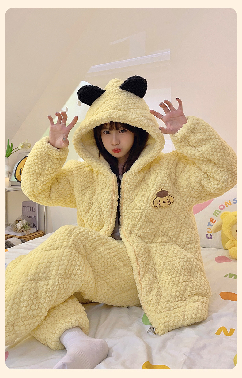 睡衣女士珊瑚绒三层夹棉2023年新款连帽卡通冬天棉袄家居服两件套