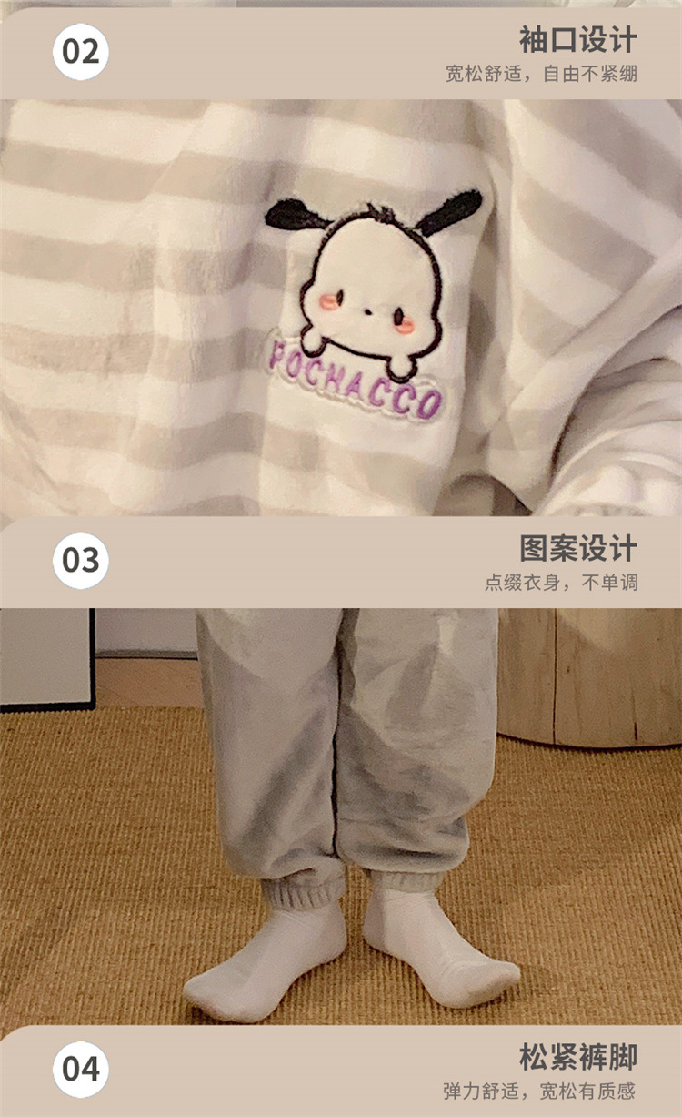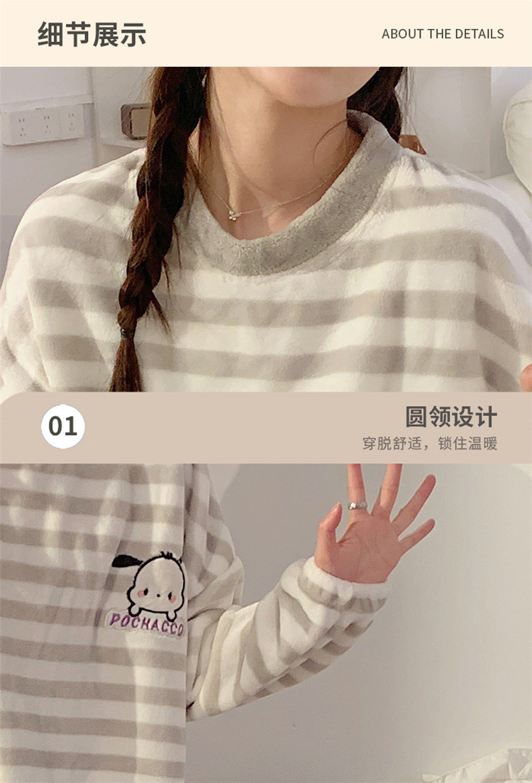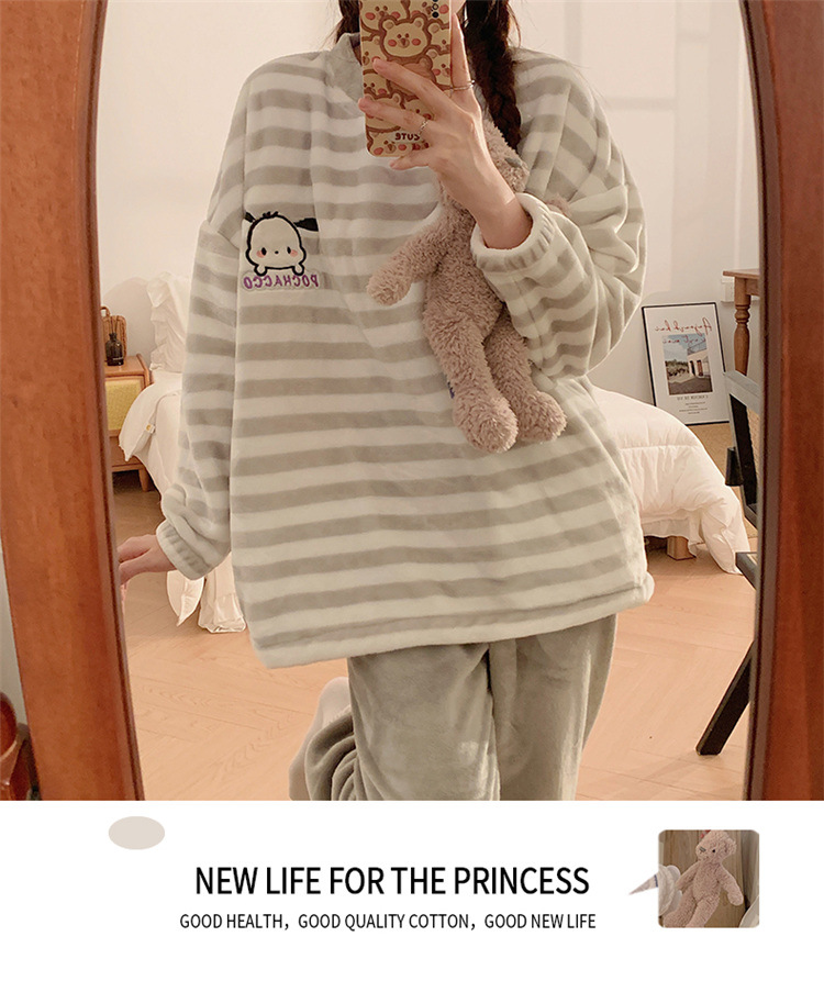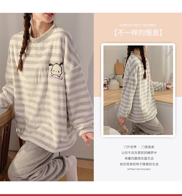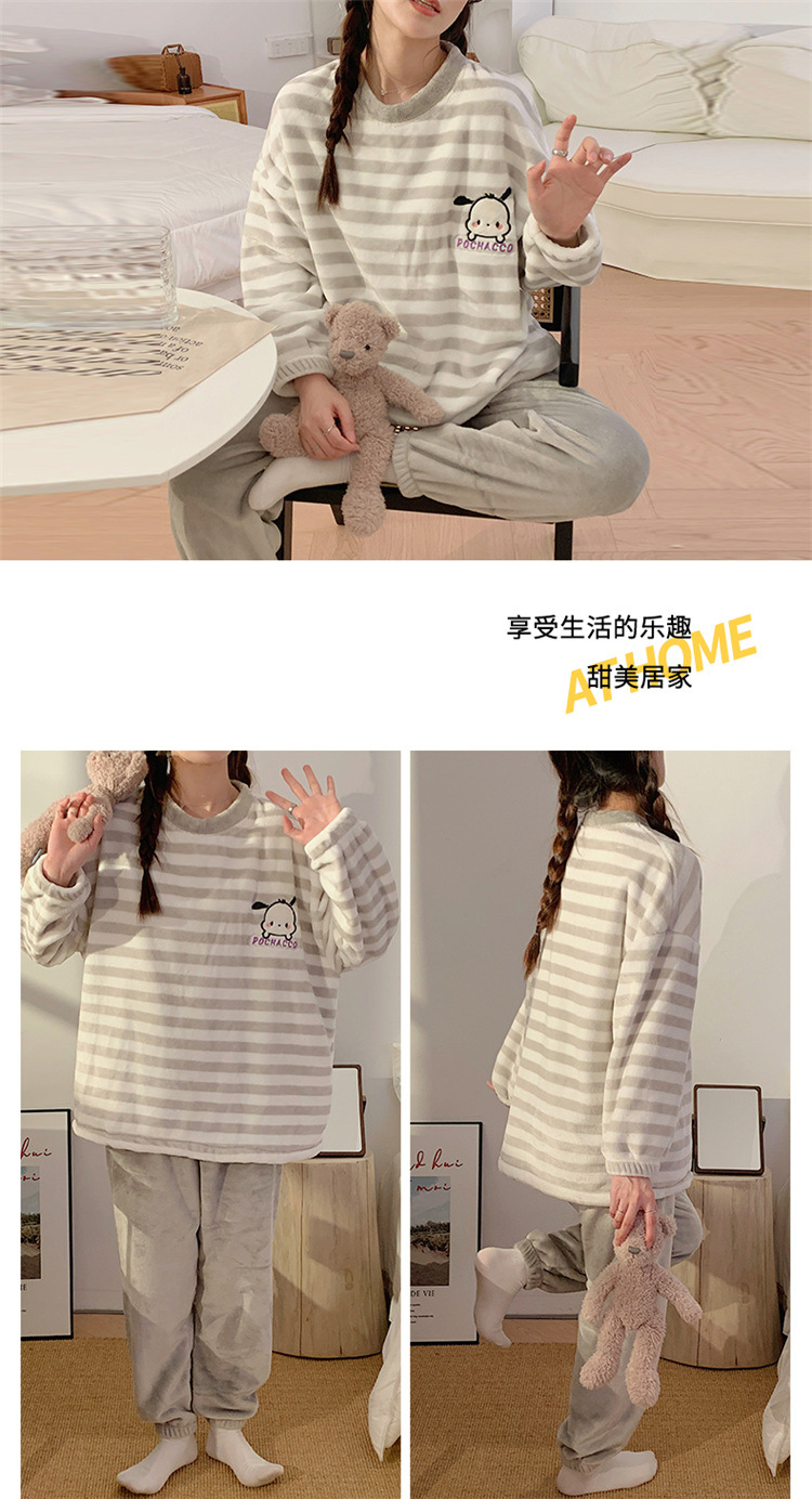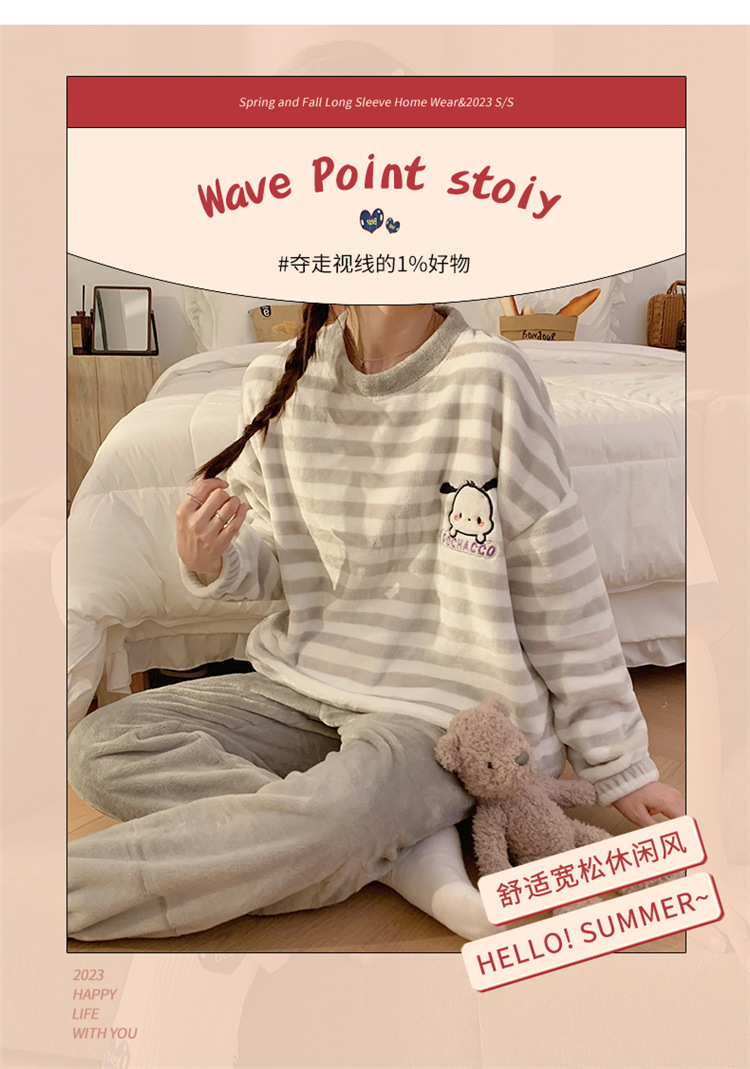 2023年法兰绒睡衣冬季新款可爱条纹卡通舒适珊瑚绒女士家居服套装
