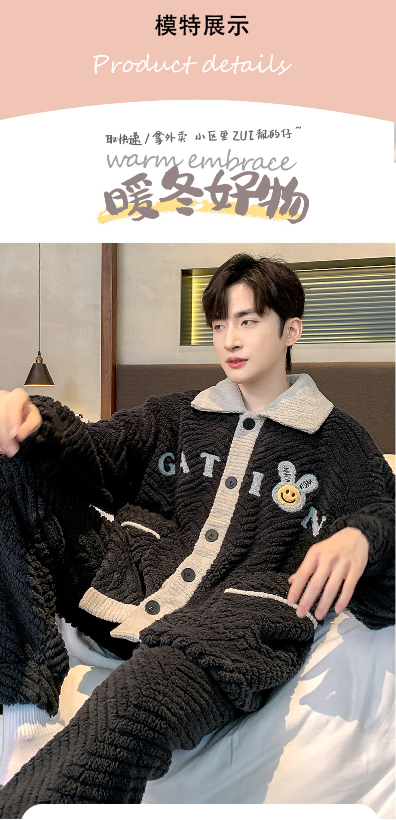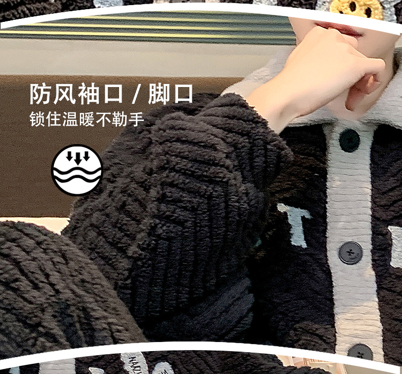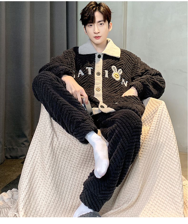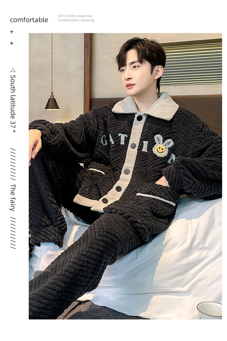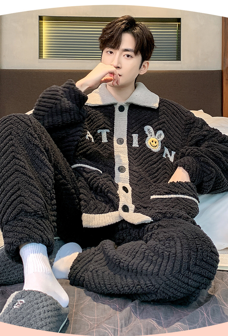 珊瑚绒睡衣男冬季新款加厚保暖开衫法兰绒青少年家居服可外穿套装