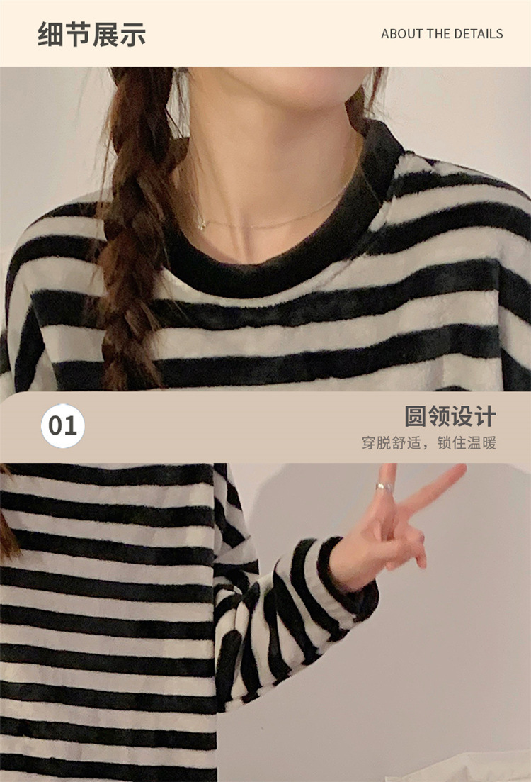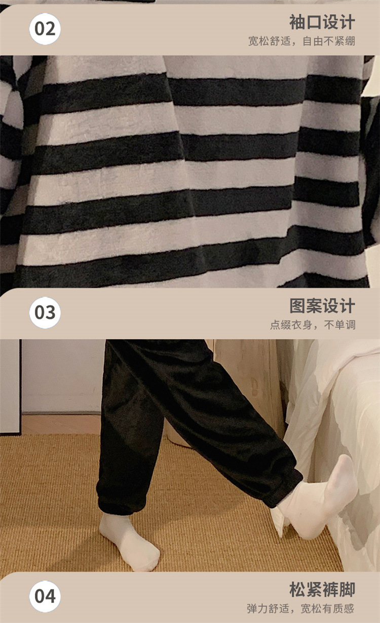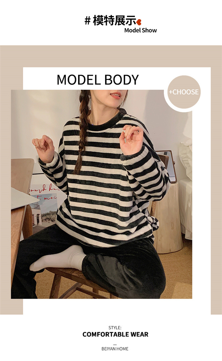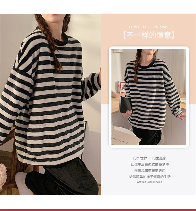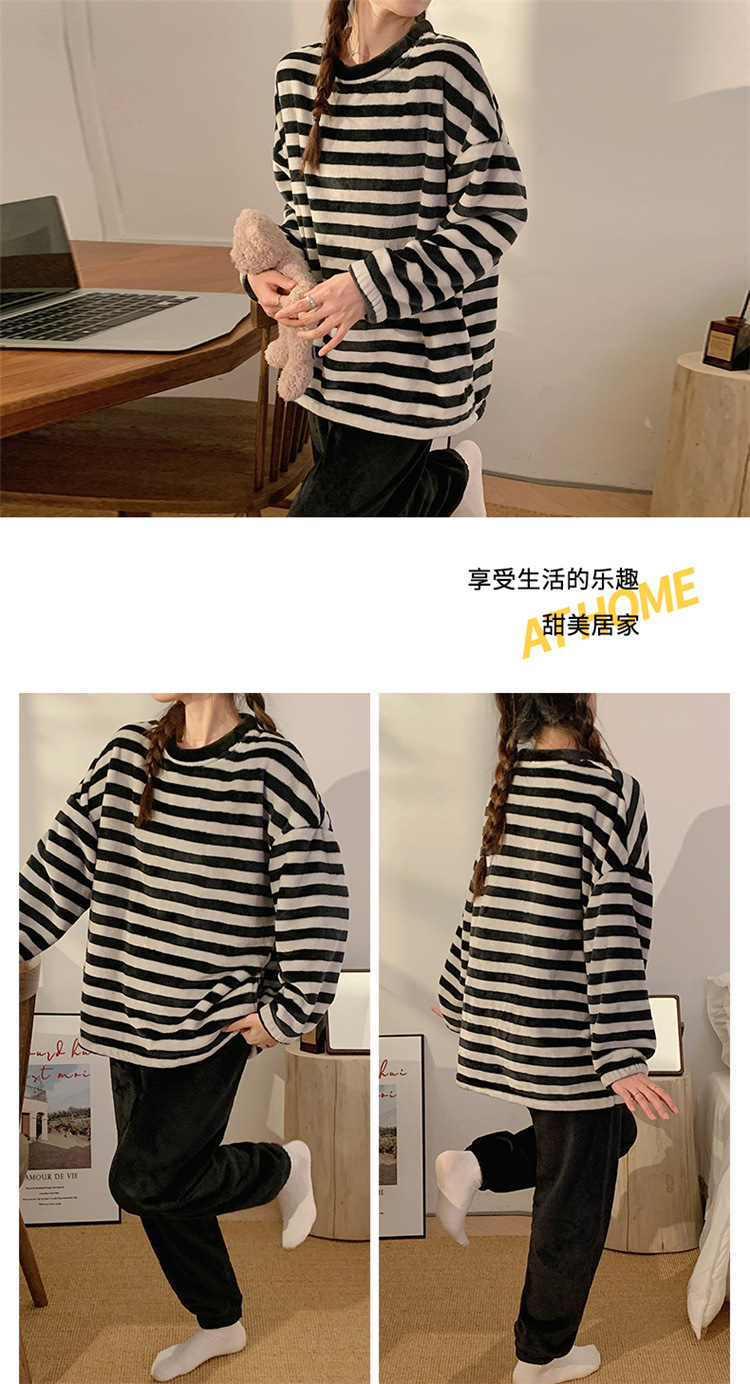 法兰绒睡衣女冬季新款条纹时尚高级感舒适珊瑚绒家居服可外穿套装