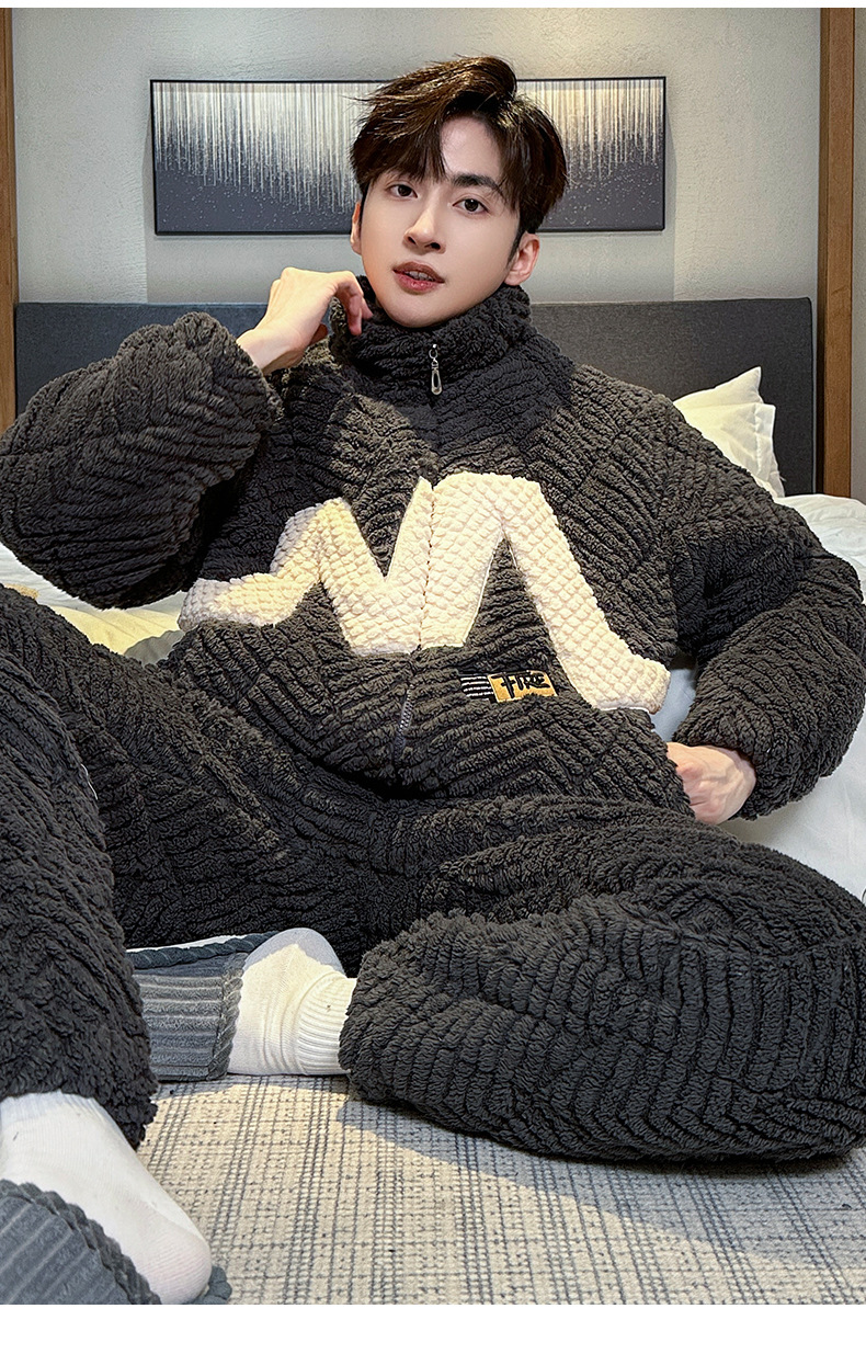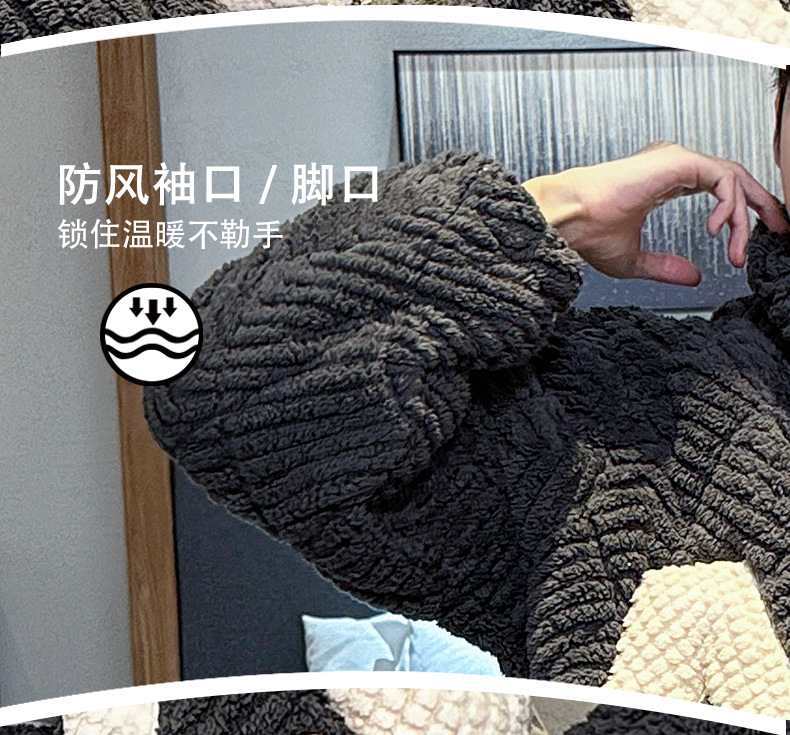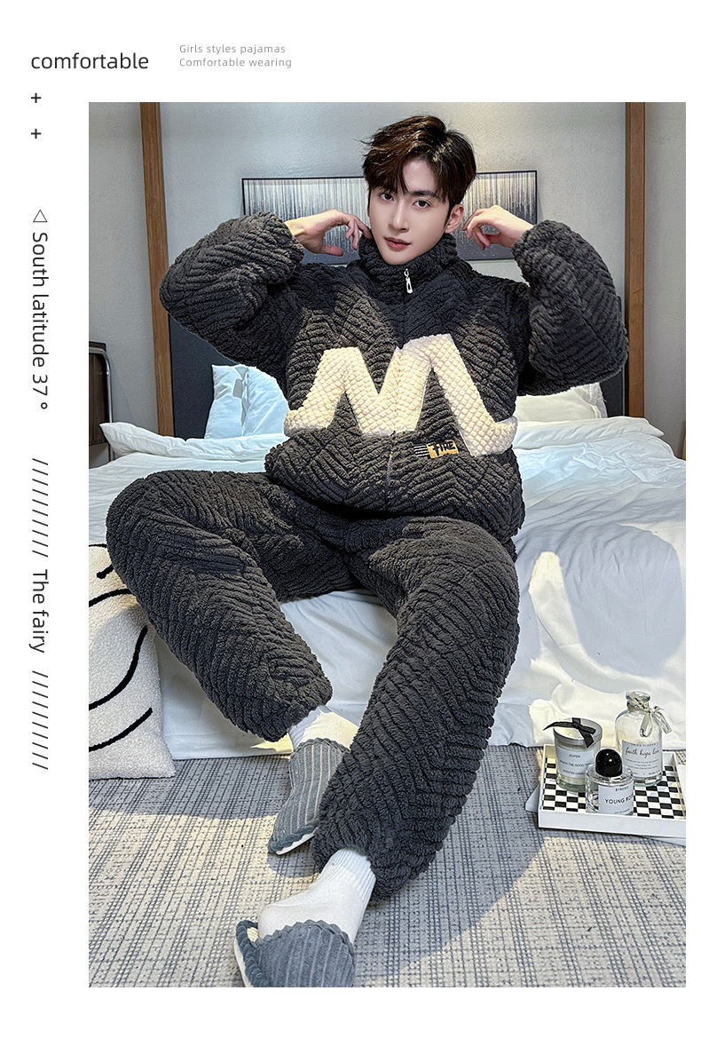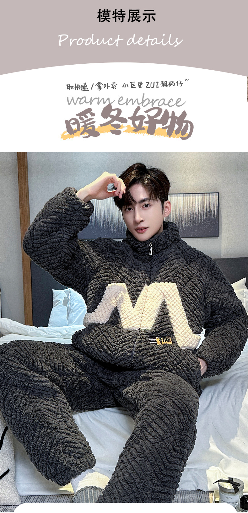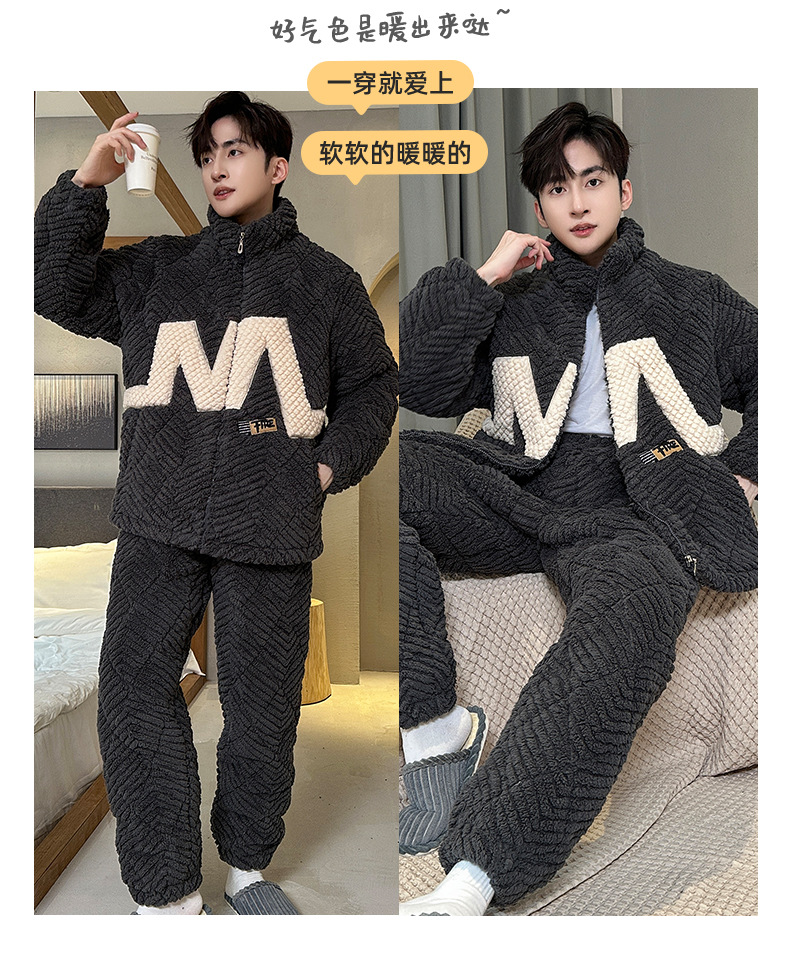 睡衣男士秋冬季三层夹棉加厚加绒保暖珊瑚绒超厚棉袄冬款家居服