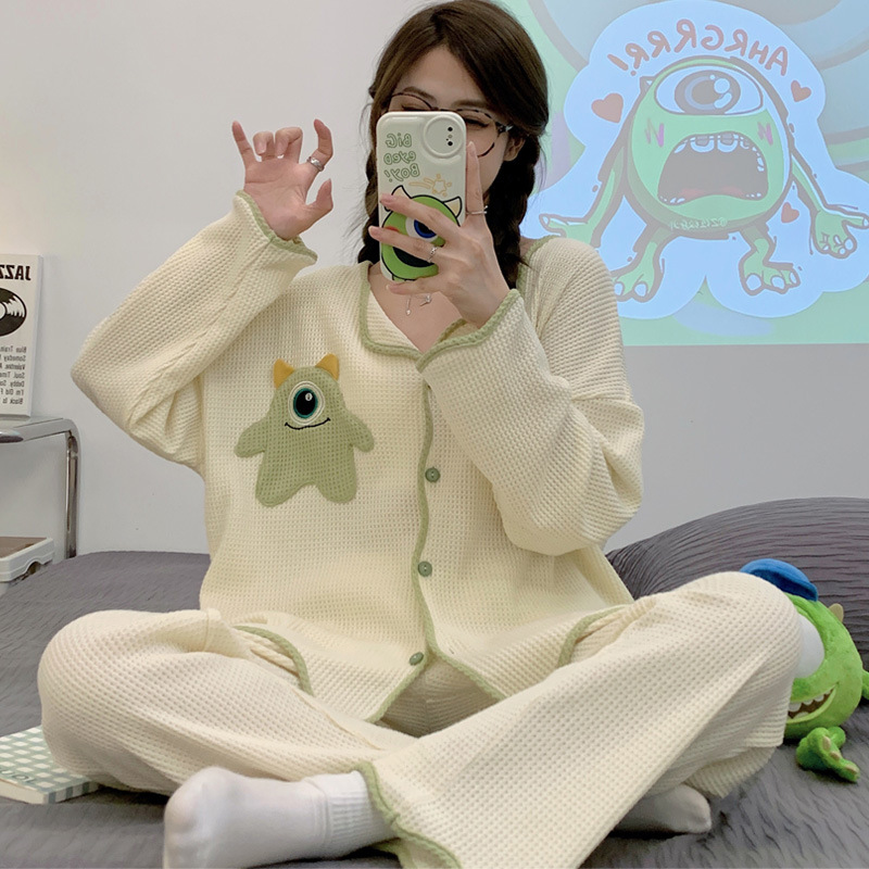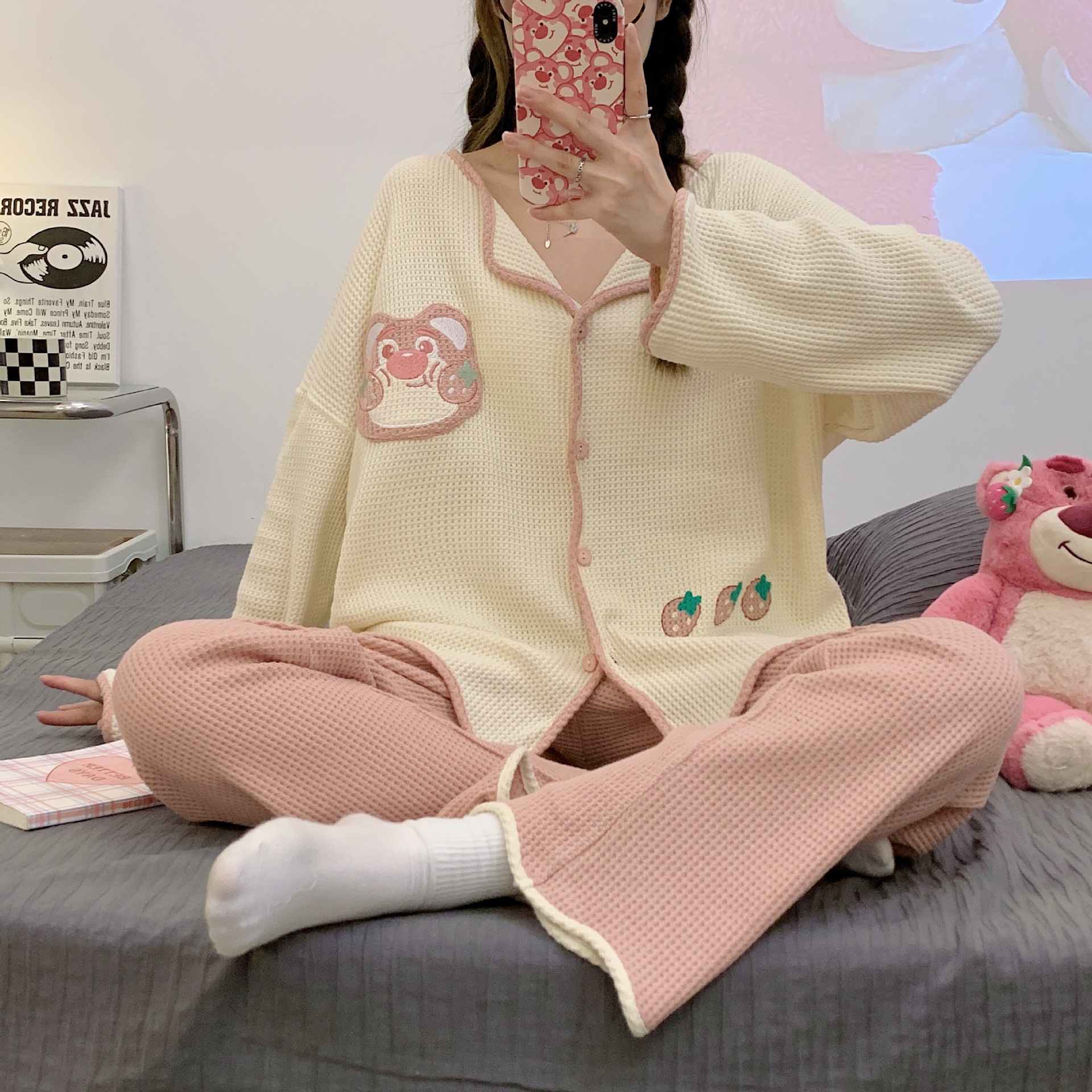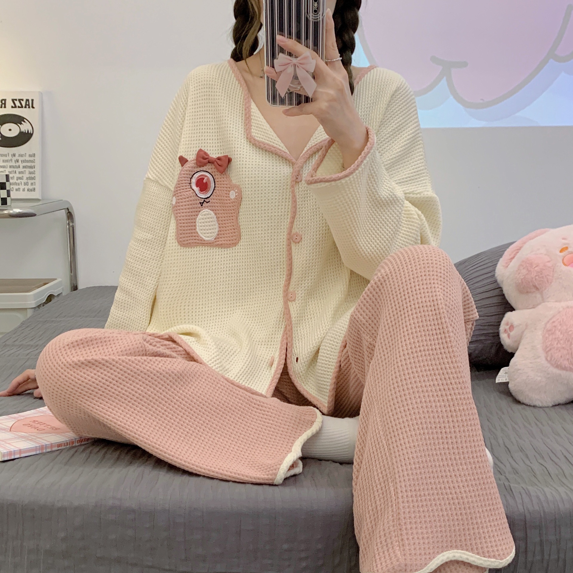 睡衣女春秋冬季纯色棉可外穿2022年新款卡通华夫格长袖家居服套装