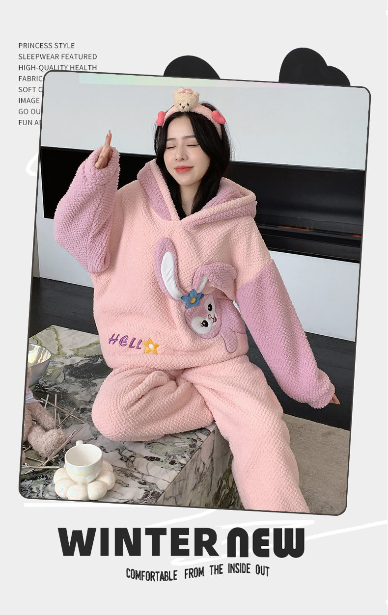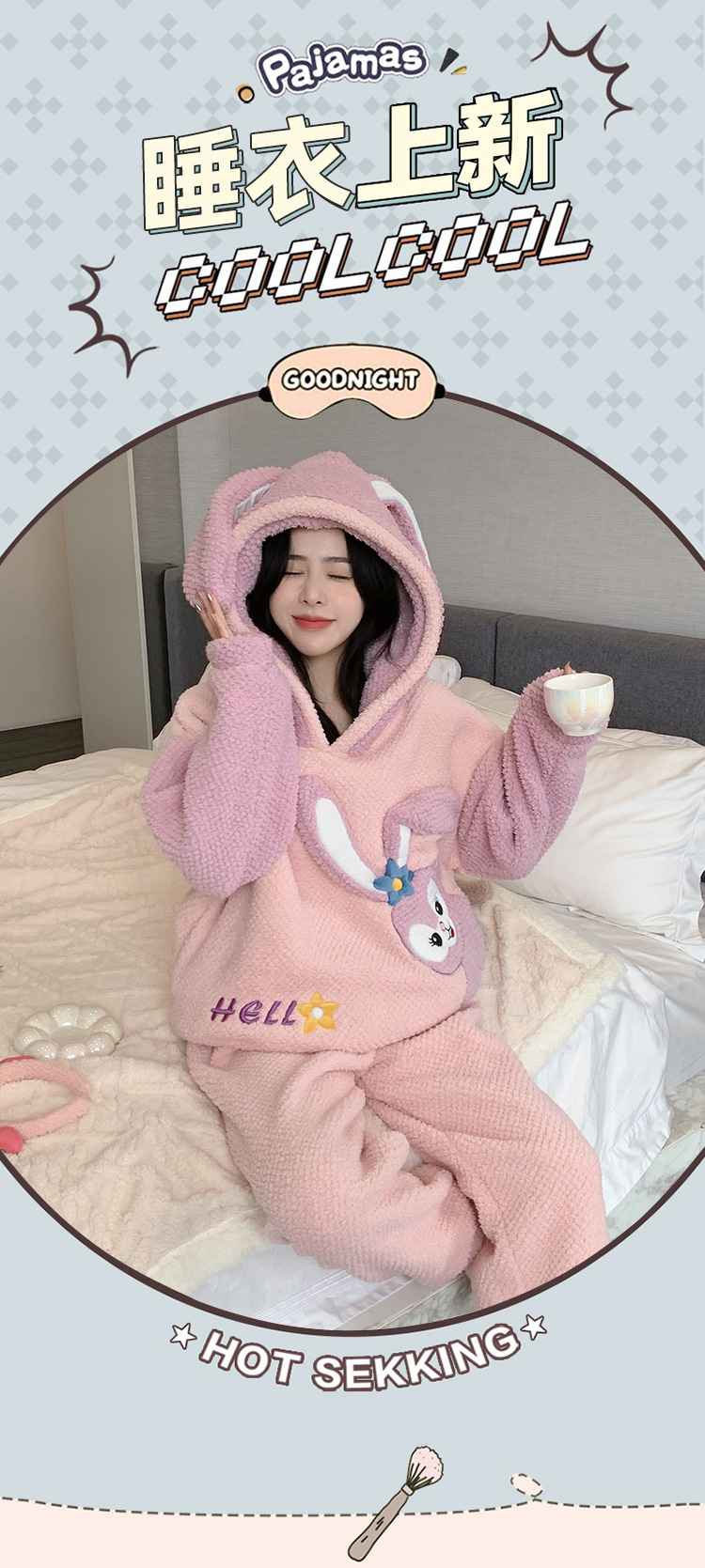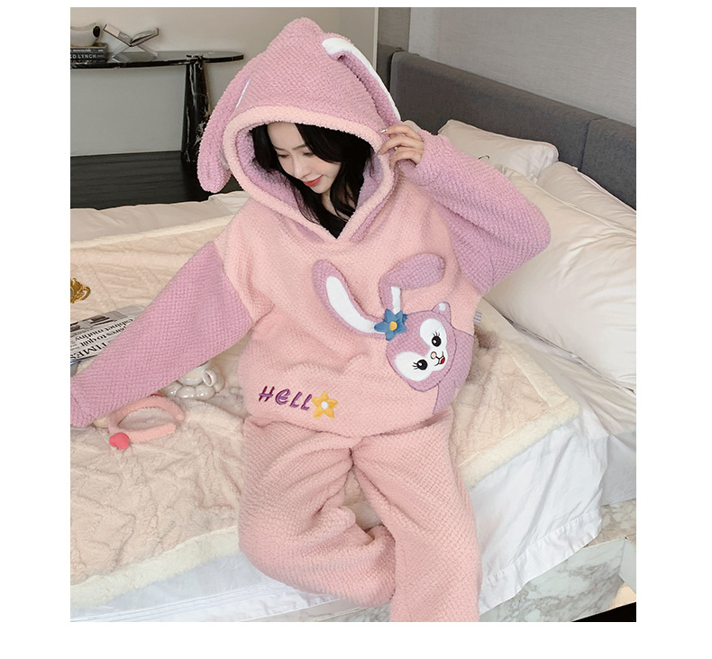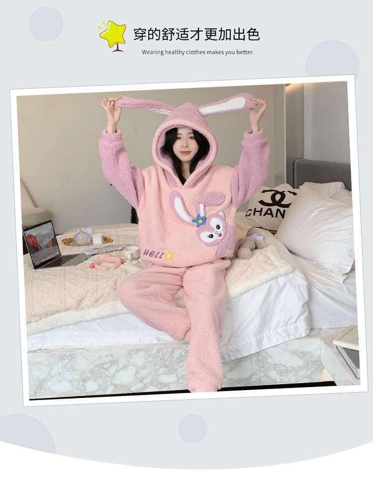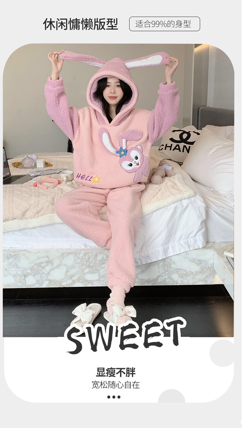 冬季珊瑚绒卡通睡衣女可爱甜美风连帽套头款法兰绒新款家居服套装