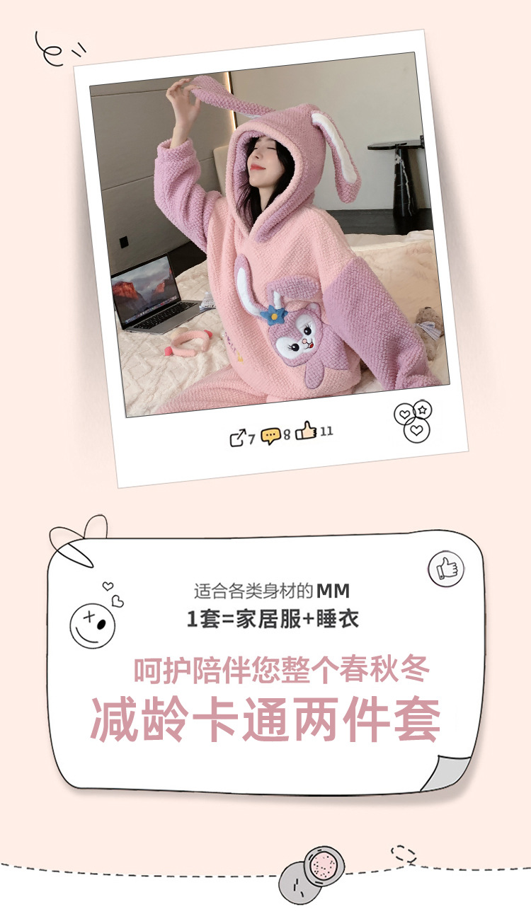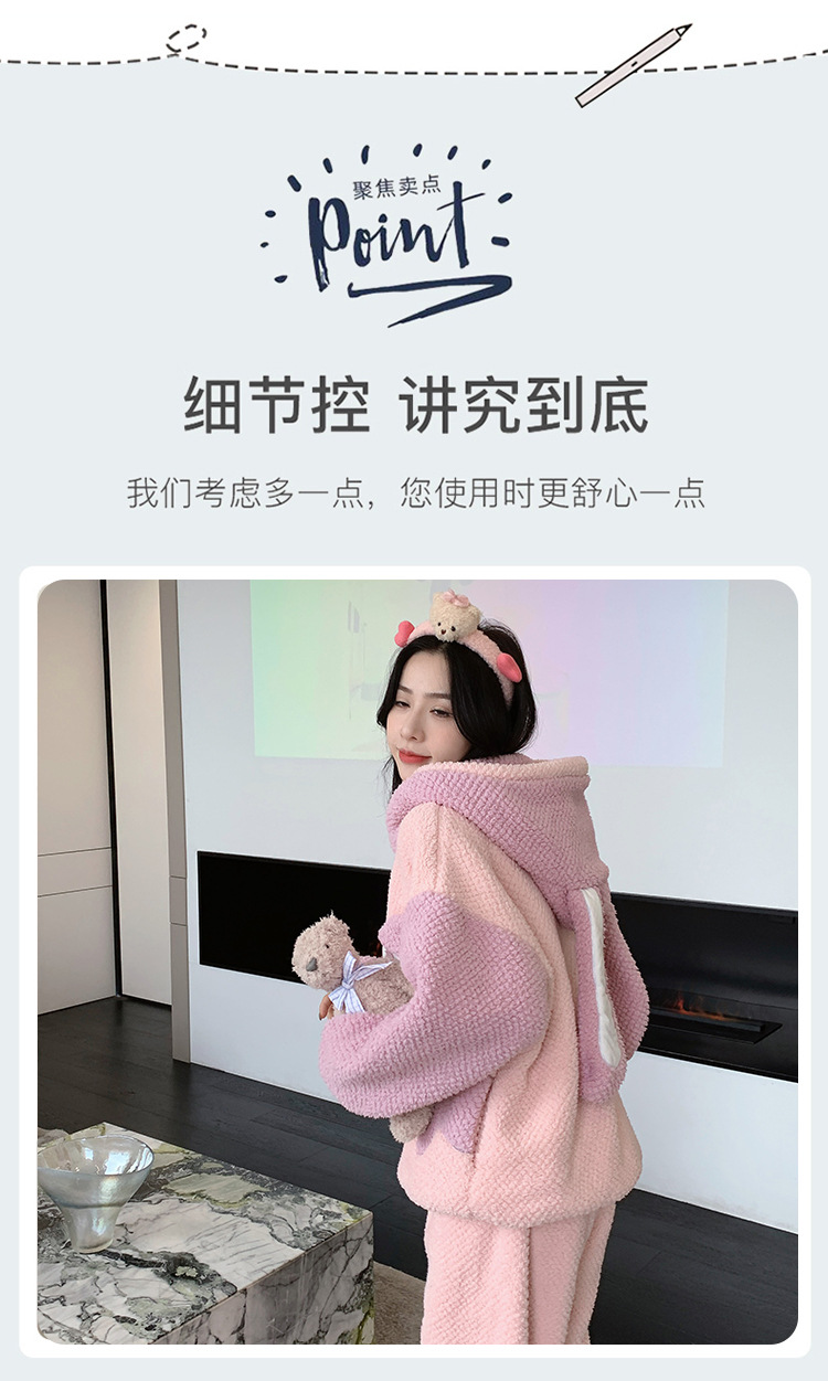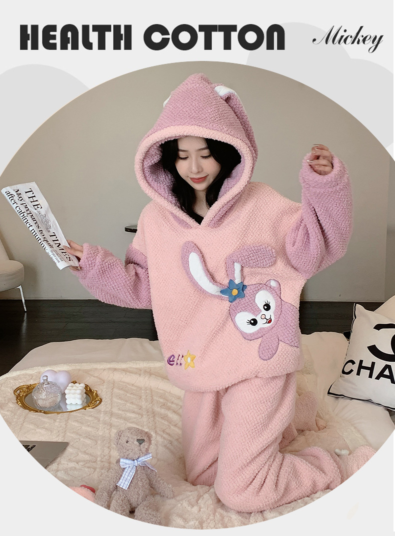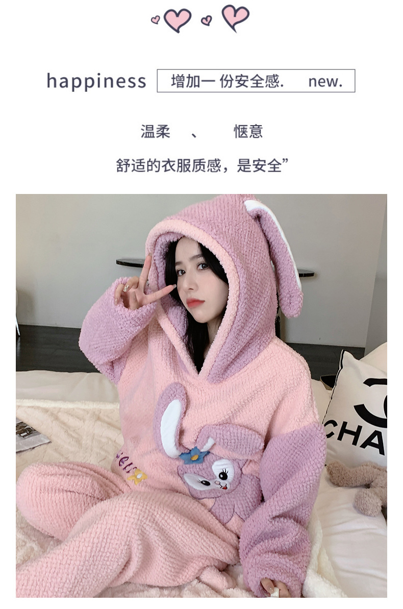 冬季珊瑚绒卡通睡衣女可爱甜美风连帽套头款法兰绒新款家居服套装