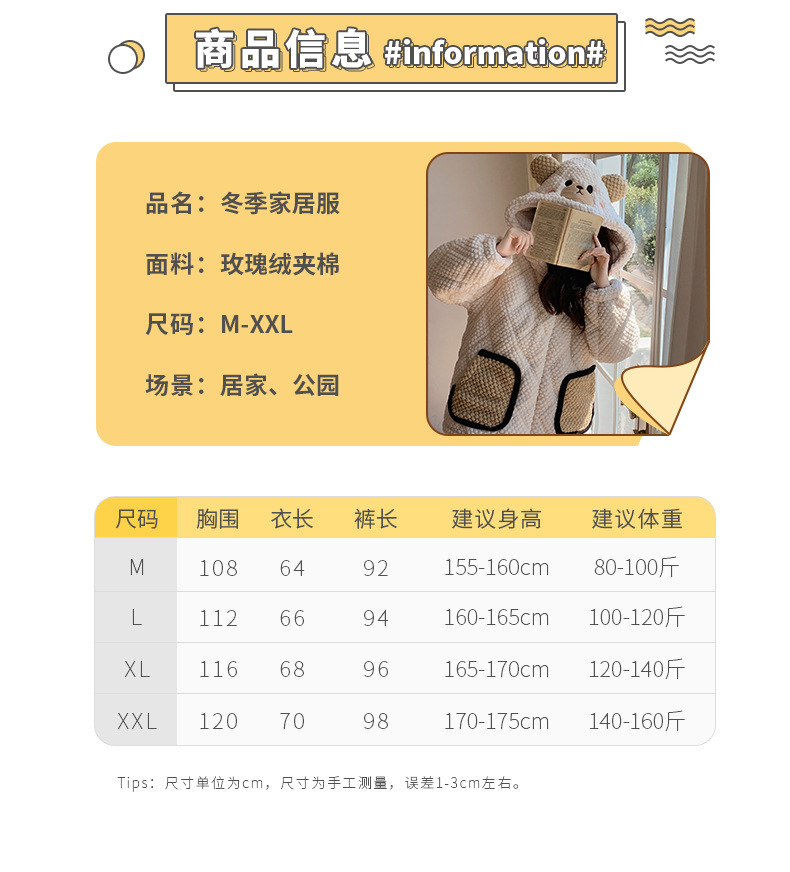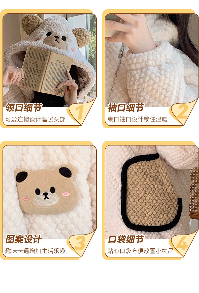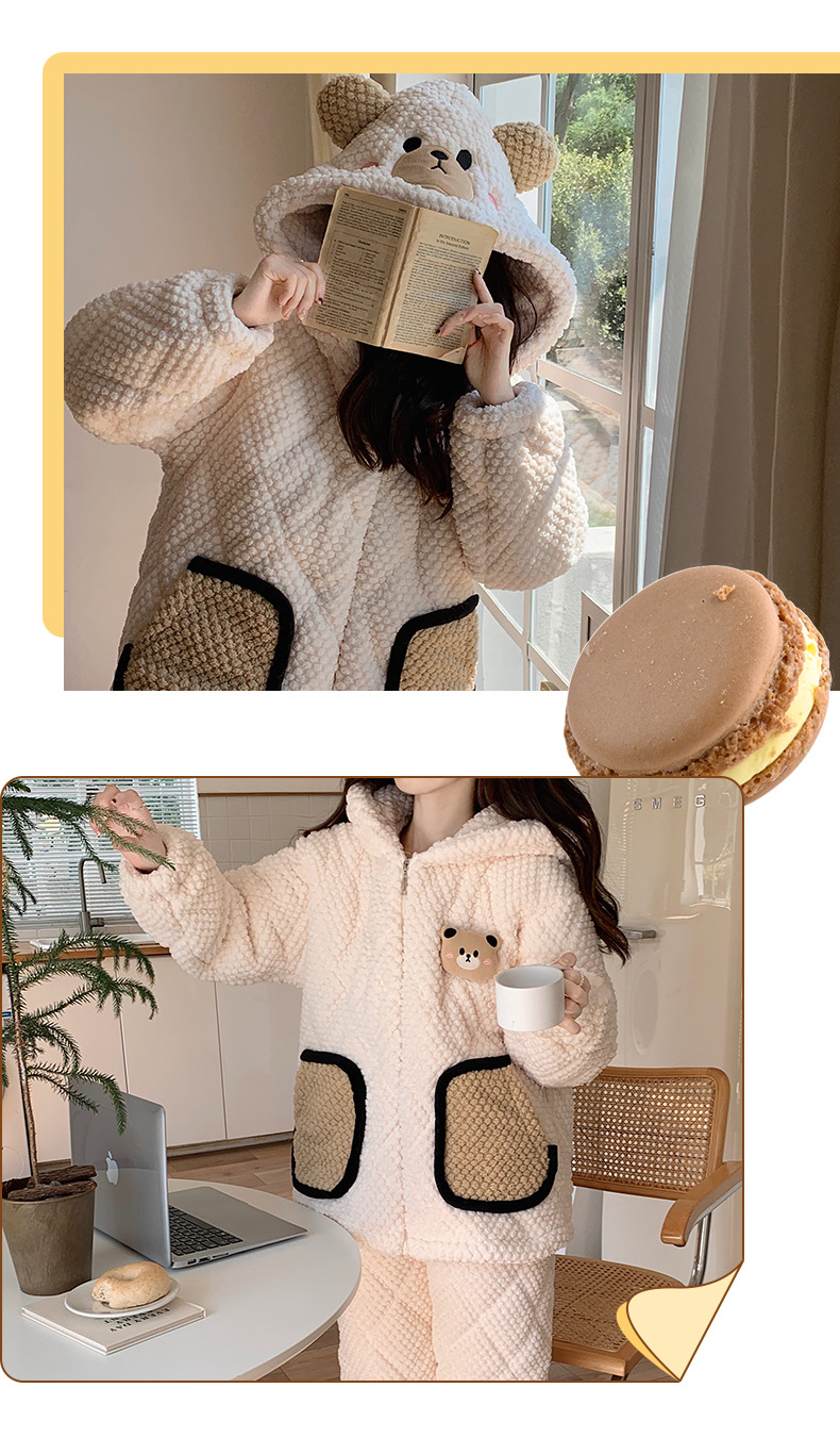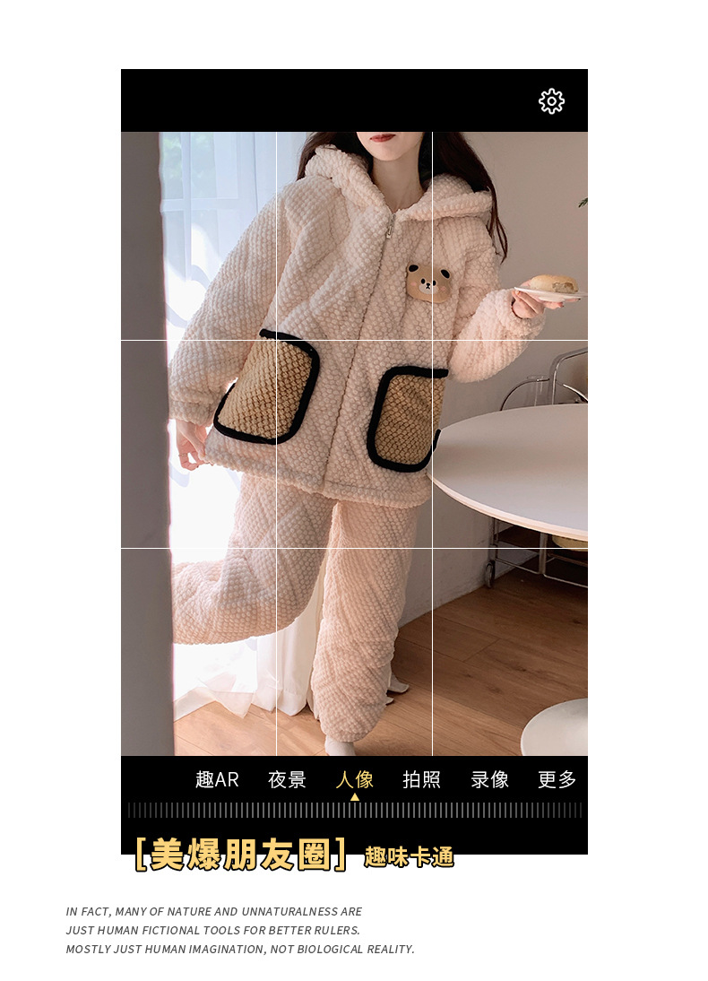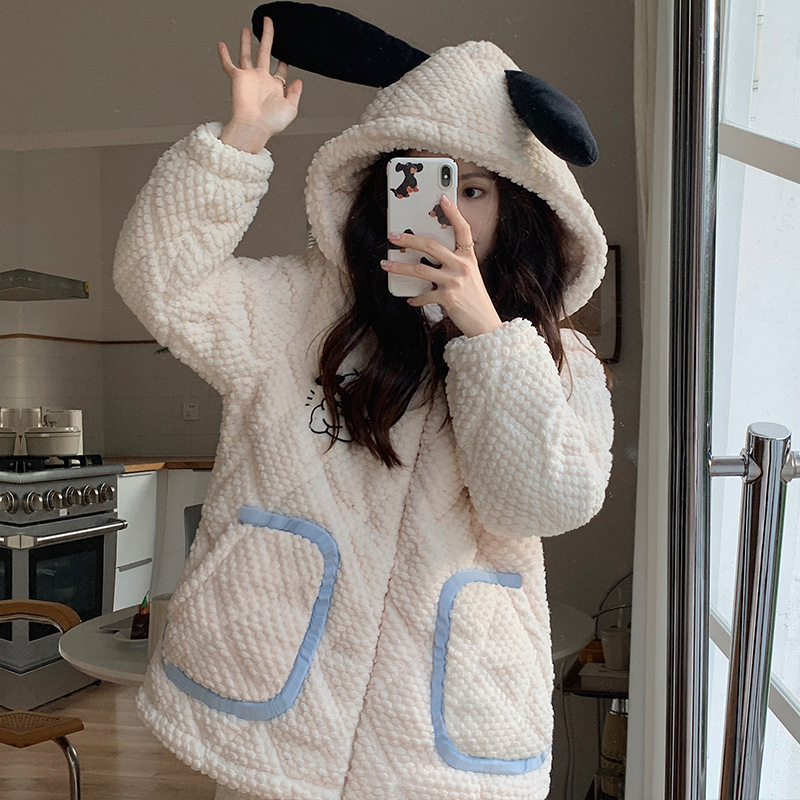 冬季珊瑚绒三层夹棉可爱卡通连帽睡衣女新款加厚加绒家居服可外穿
