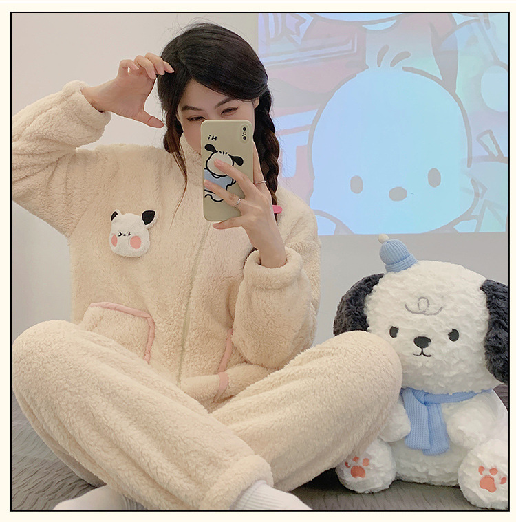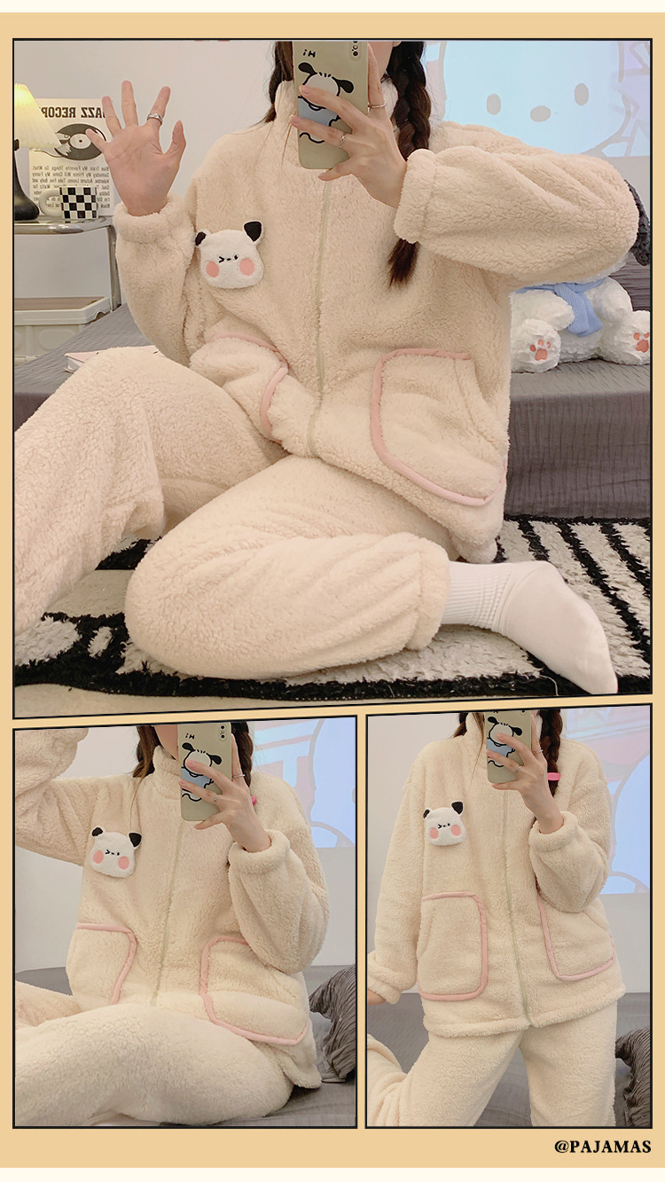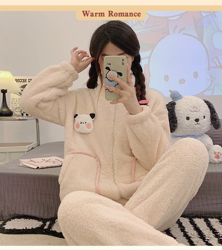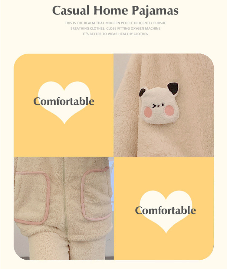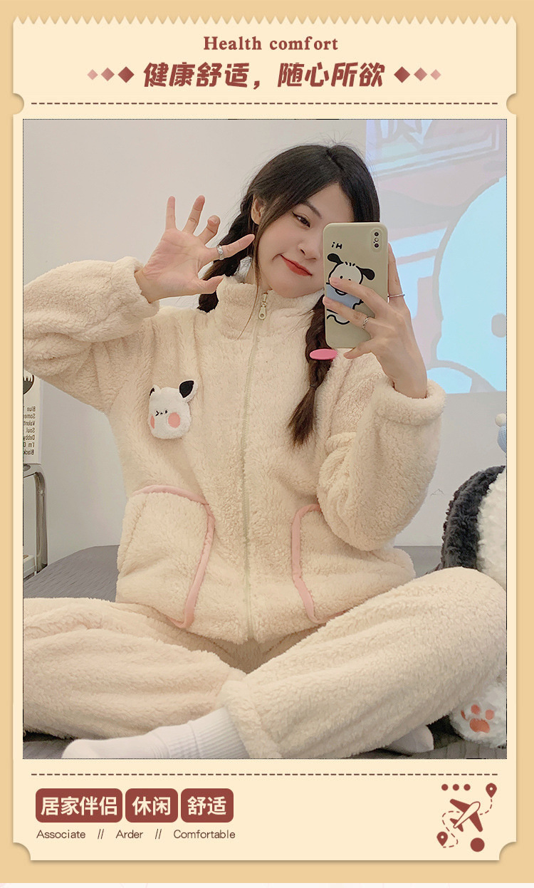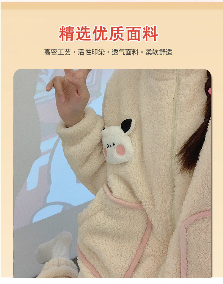 冬季珊瑚绒新款卡通睡衣女运动风加厚拉链法兰绒家居服套装可外穿