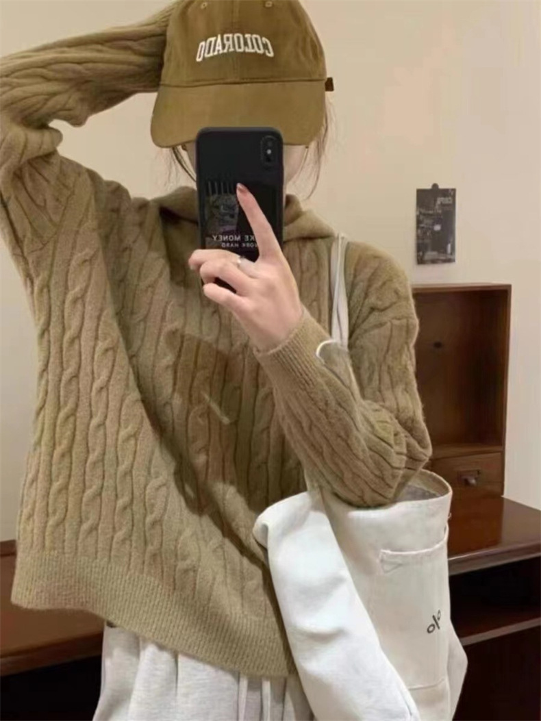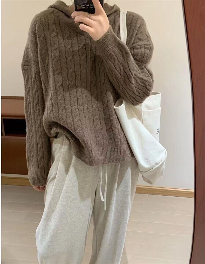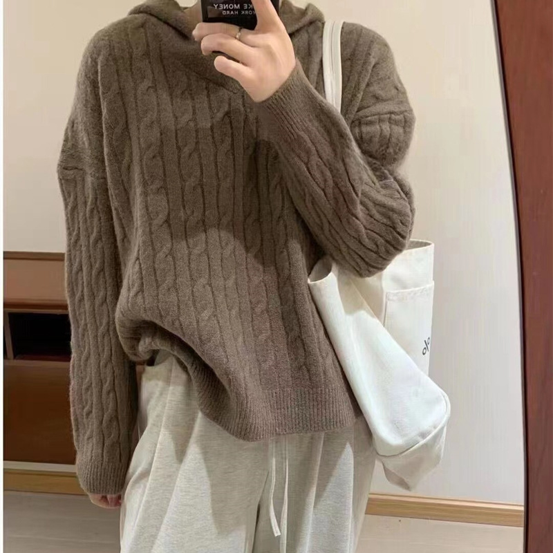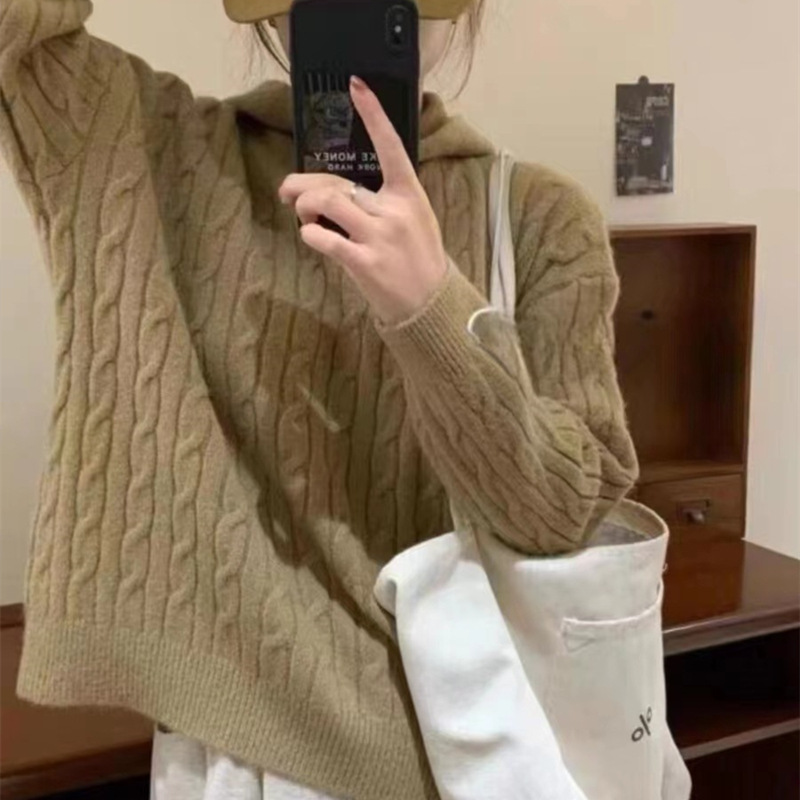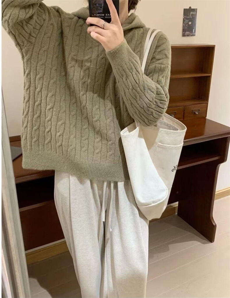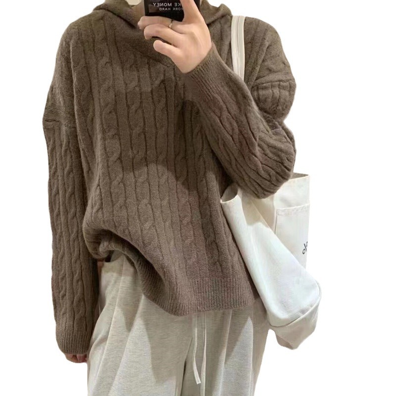 秋冬季新款麻花毛衣女连帽套头复古慵懒宽松软糯针织衫毛线上衣女