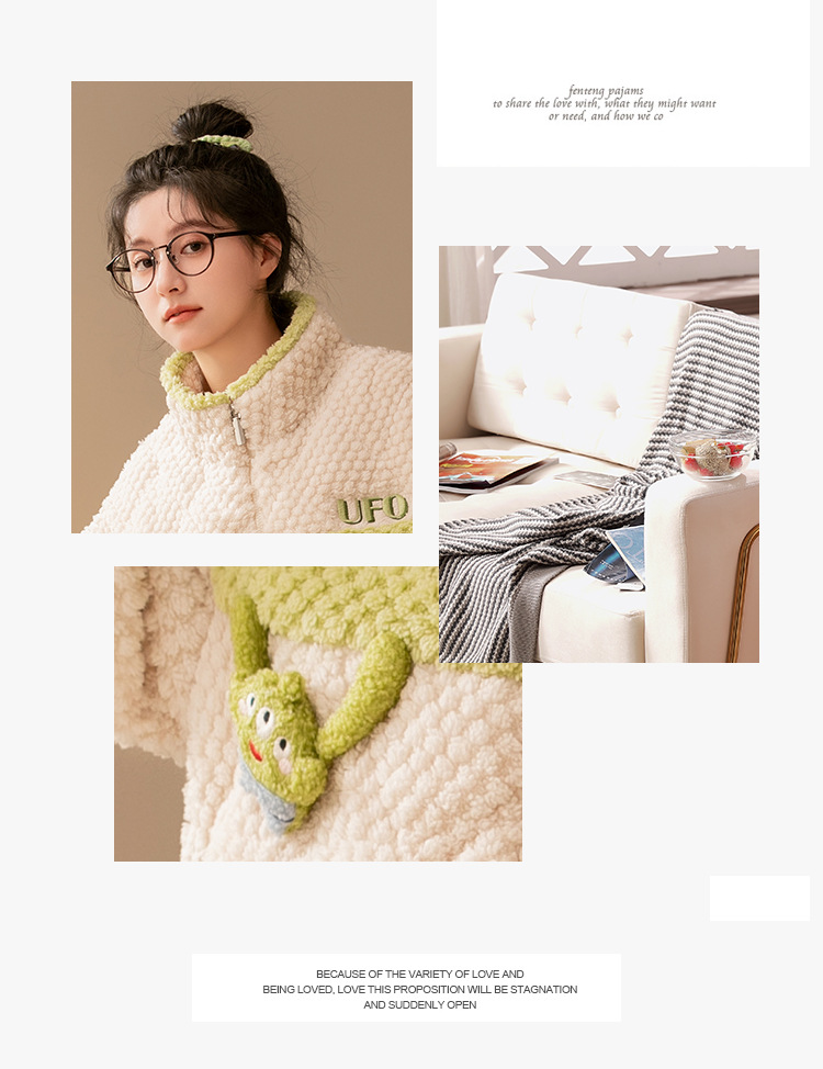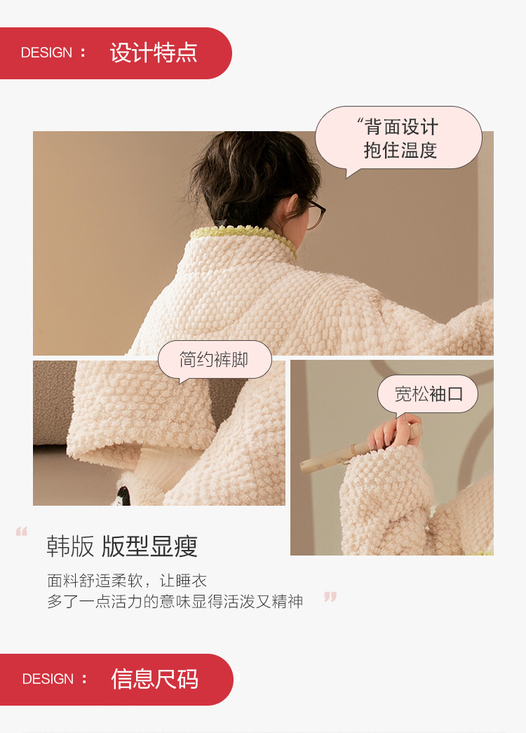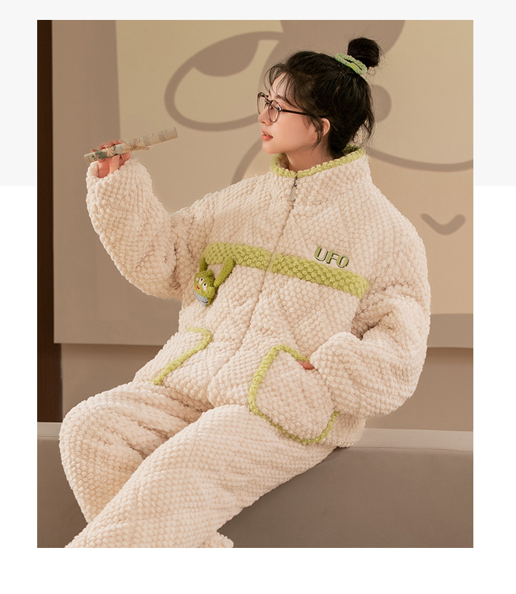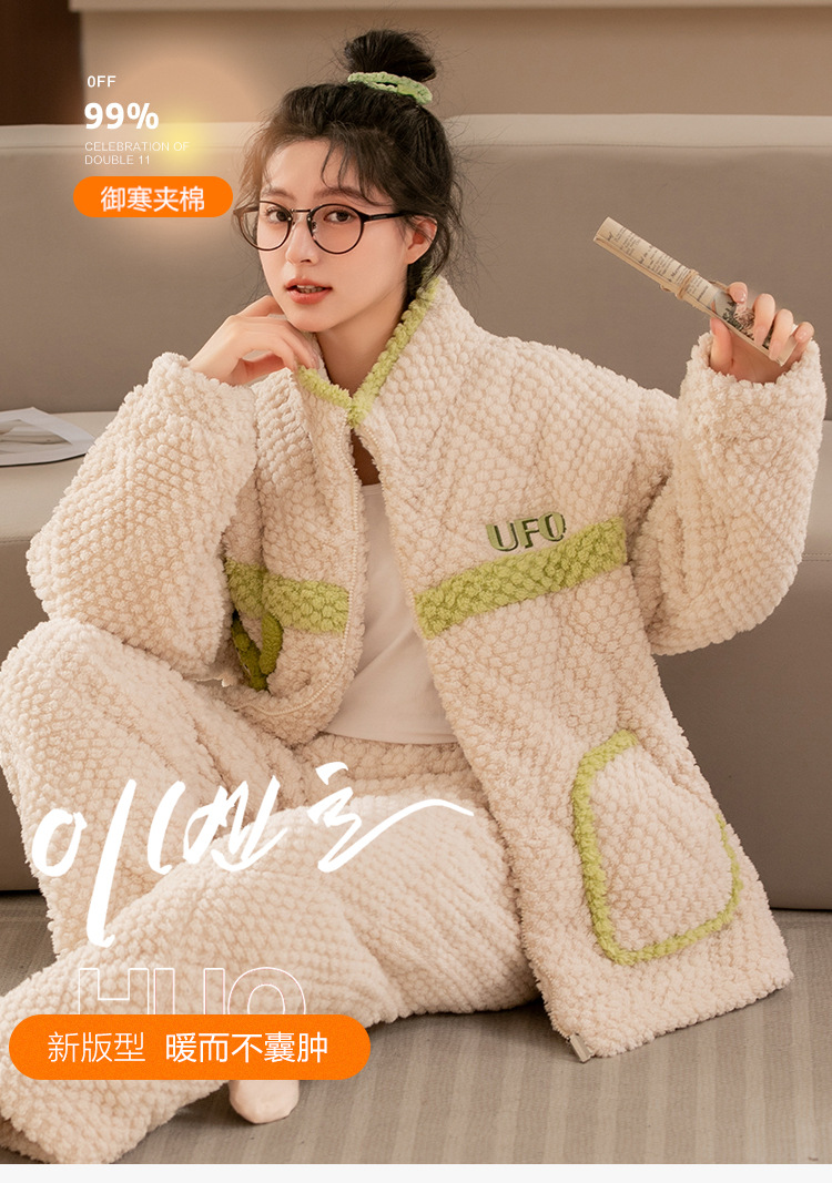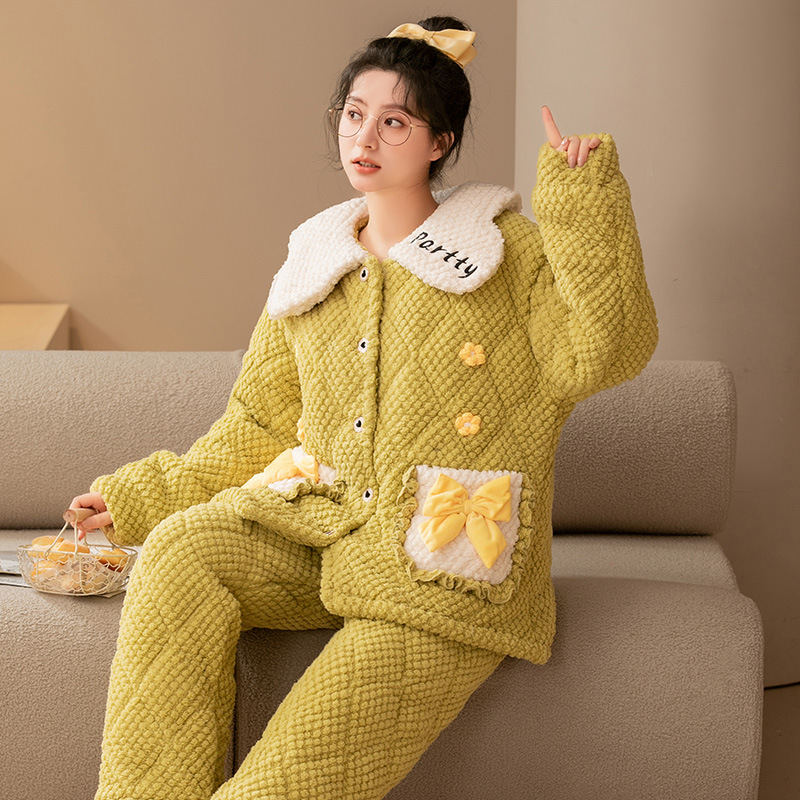 秋冬睡衣女冬季三层夹棉袄加厚法兰绒提花珊瑚绒家居服套装可外穿