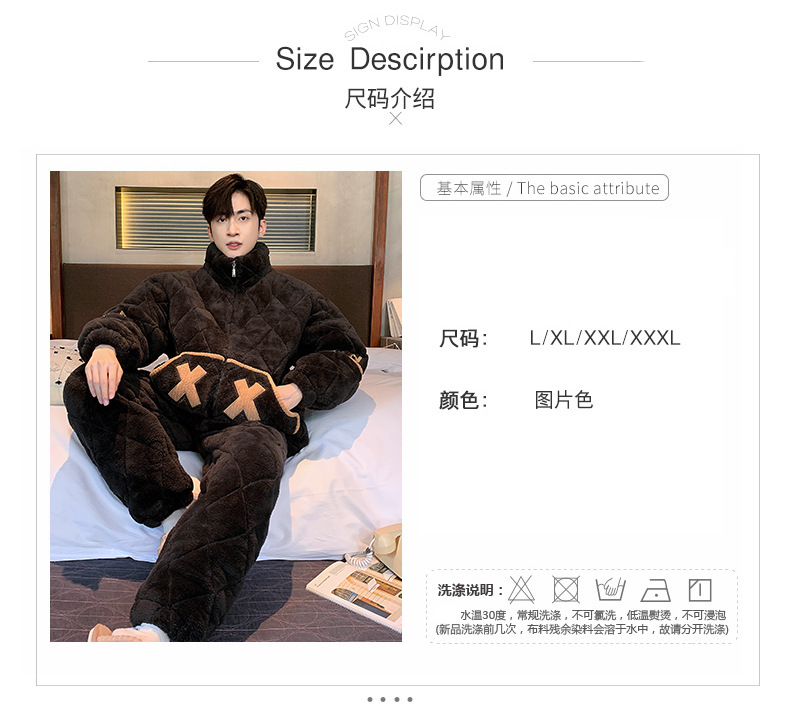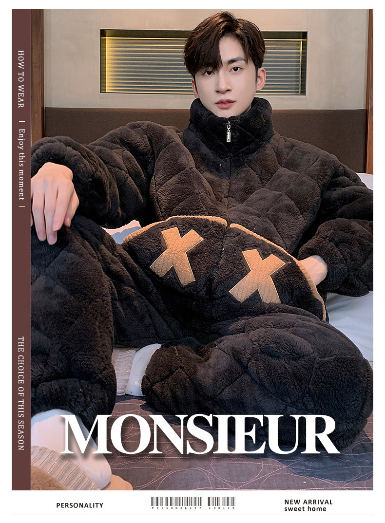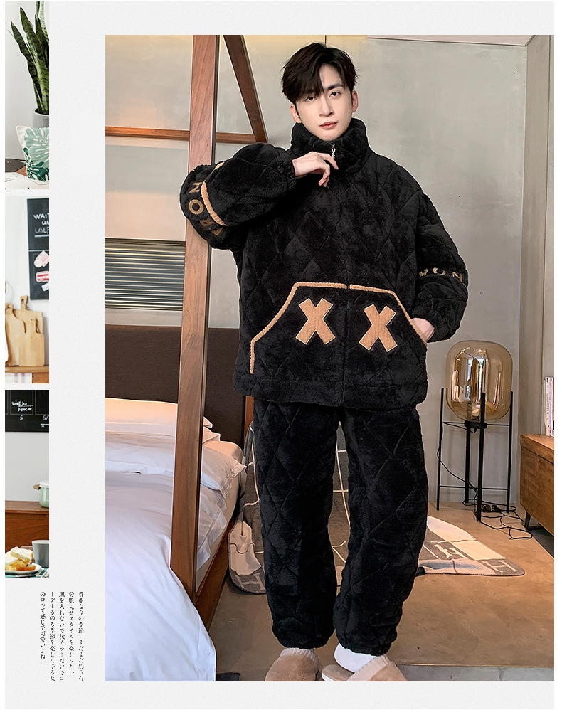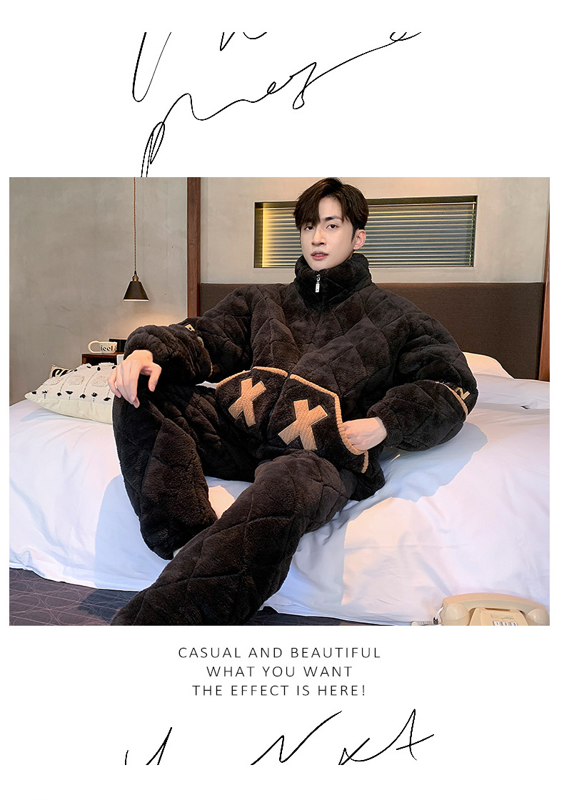 珊瑚绒睡衣男秋冬季三层夹棉加绒加厚简约高领可外穿家居服两件套
