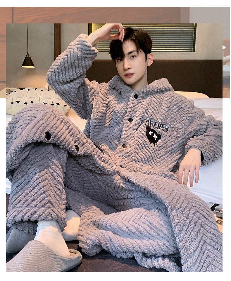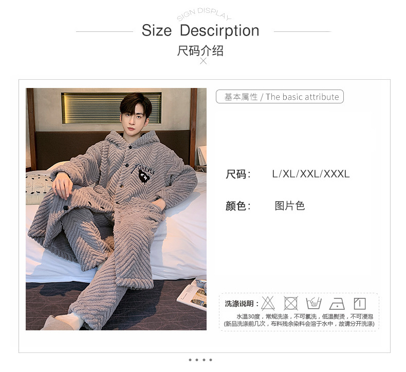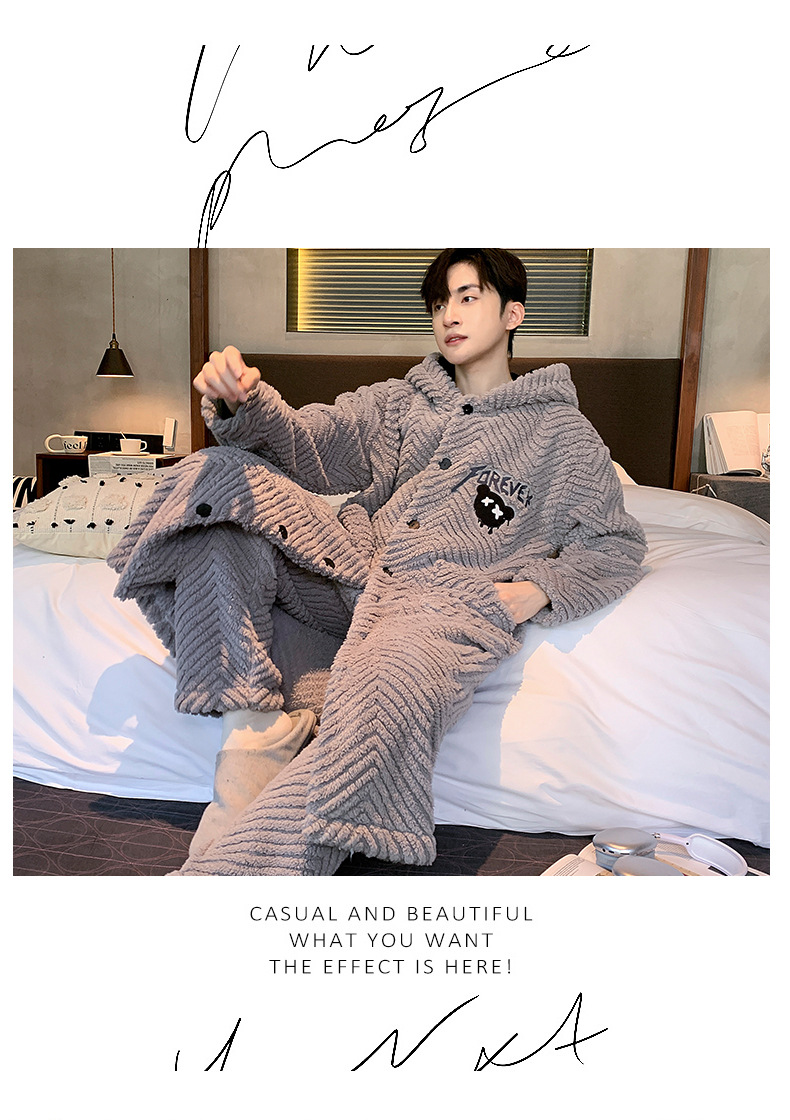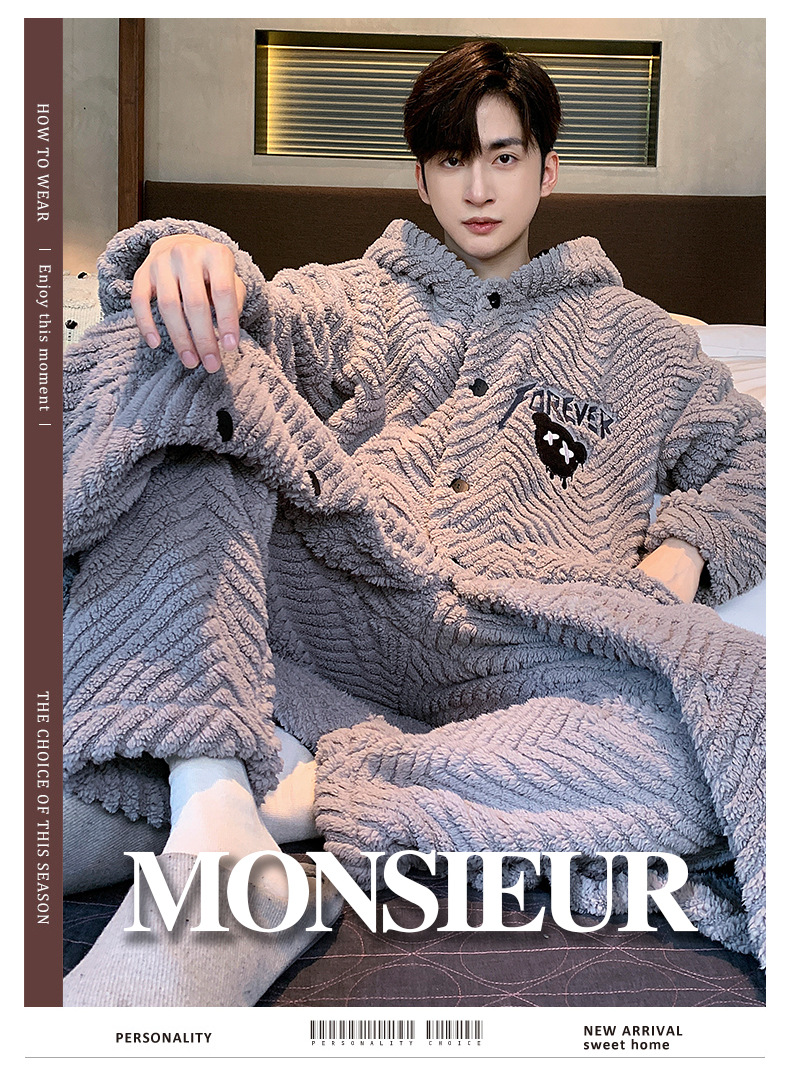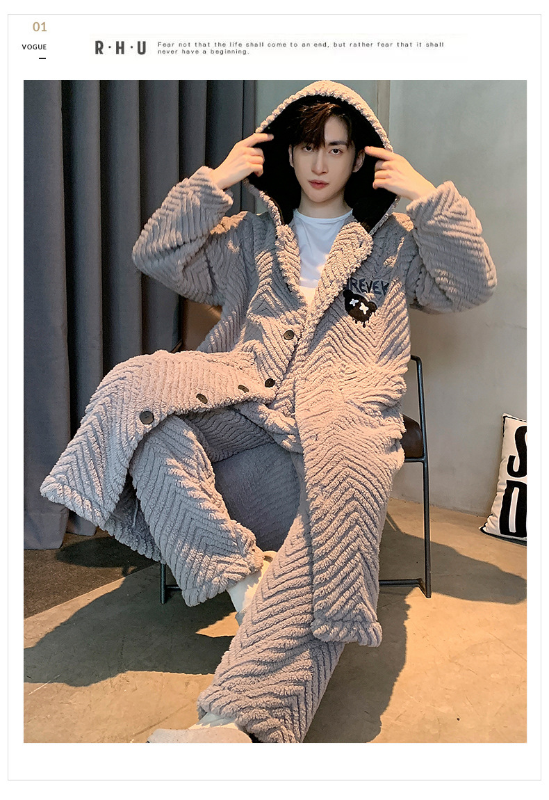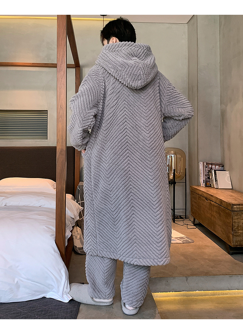 冬季珊瑚绒睡衣男士青少年法兰绒新款中长款睡袍连帽家居服两件套