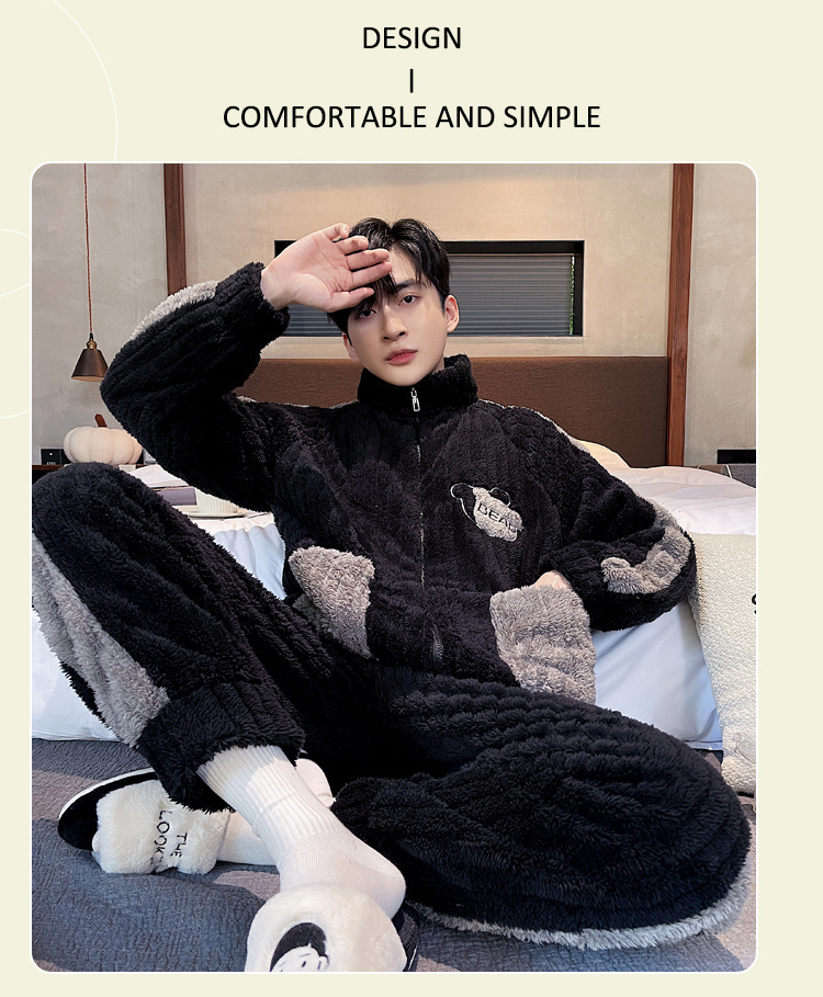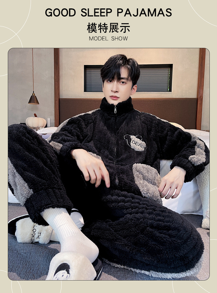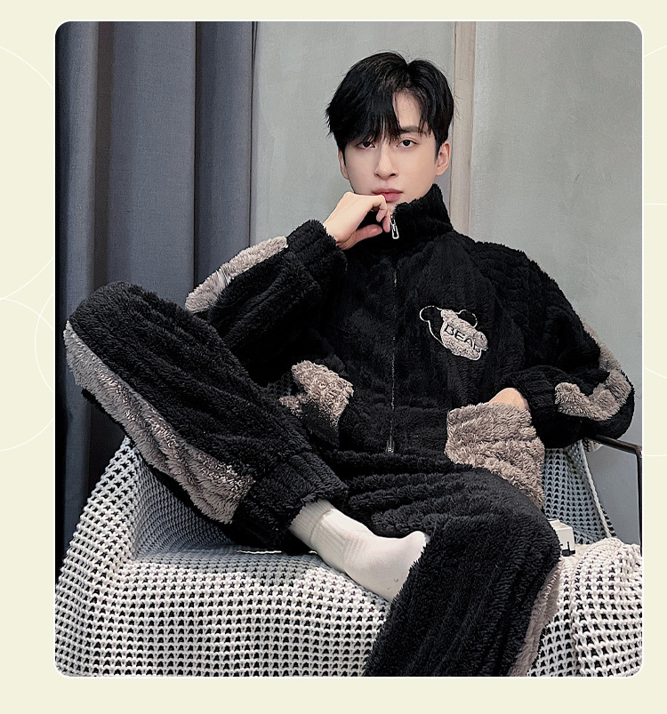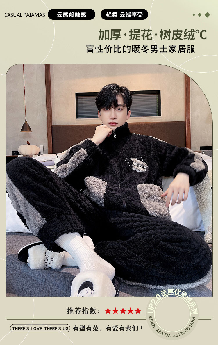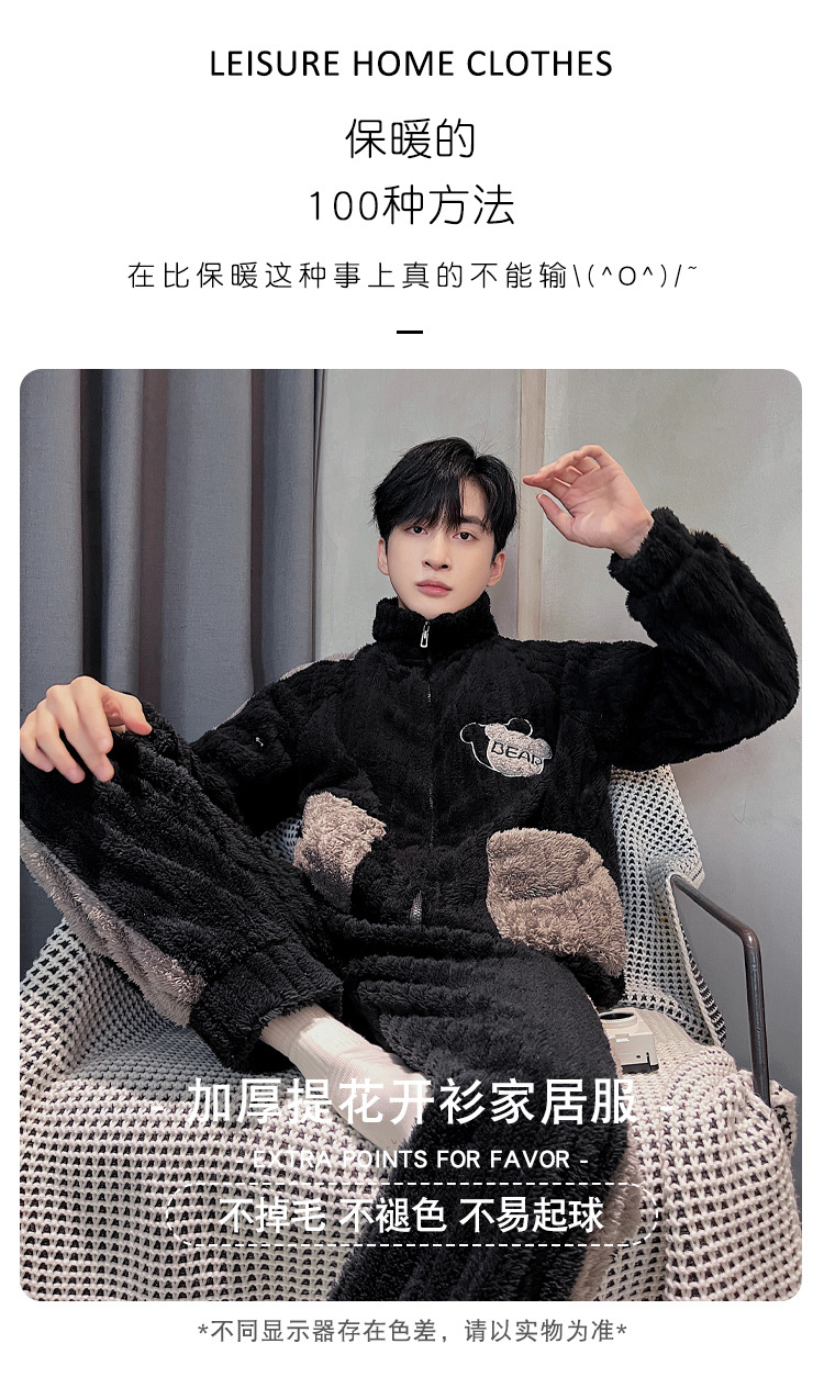 珊瑚绒睡衣男士冬季提花保暖开衫拉链法兰绒家居服2023年新款套装